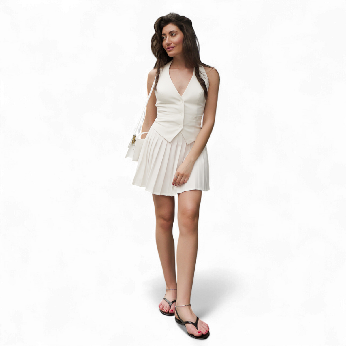 百褶裙增添轻盈与优雅,优美的裙摆动感与背心的结构形成鲜明对比。高腰设计多功能,兼具精致与舒适。