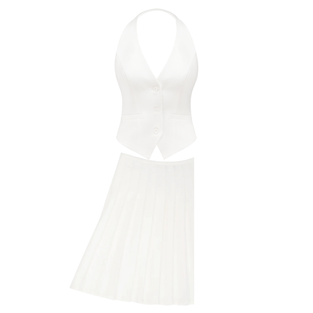 这款白色两件套西装是经典裁剪的现代演绎,配有结构感十足的背心和飘逸的百褶裙——锐利线条与柔美动感的完美融合。