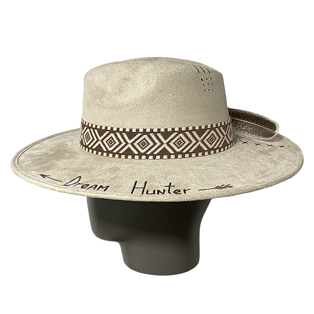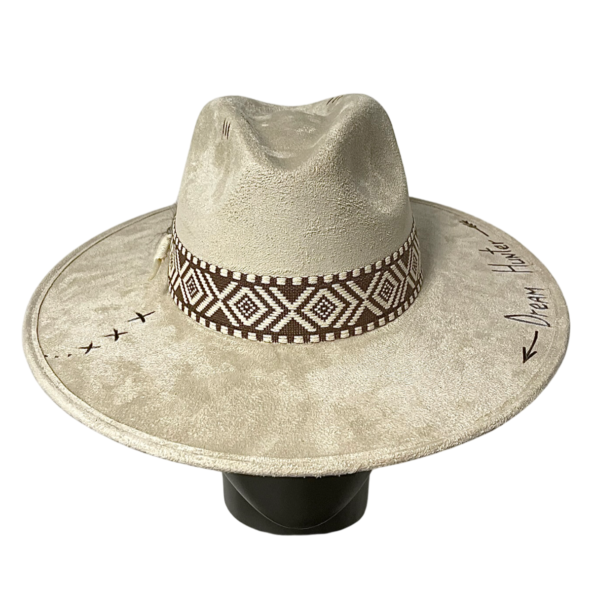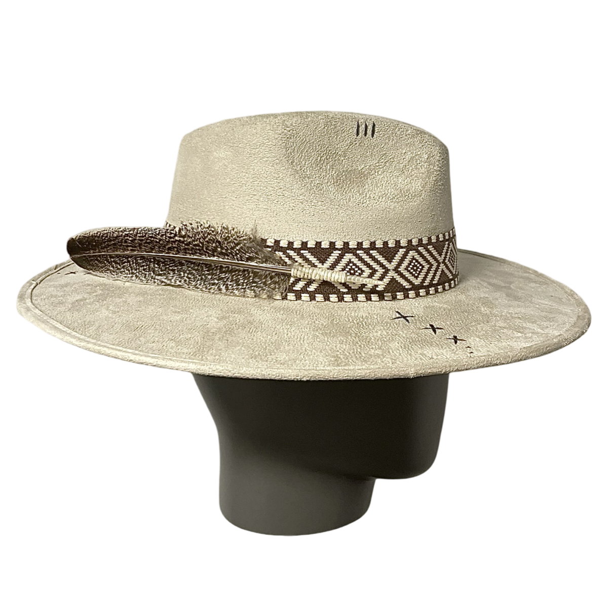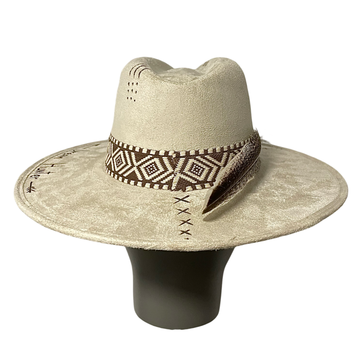 用我们的米色绒面革软呢帽提升您的造型,这是一款经典且优雅的配饰,散发出高贵与时尚气息。采用奢华的绒面革制成,这顶帽子质地柔软细腻,为任何装扮增添一丝精致感。