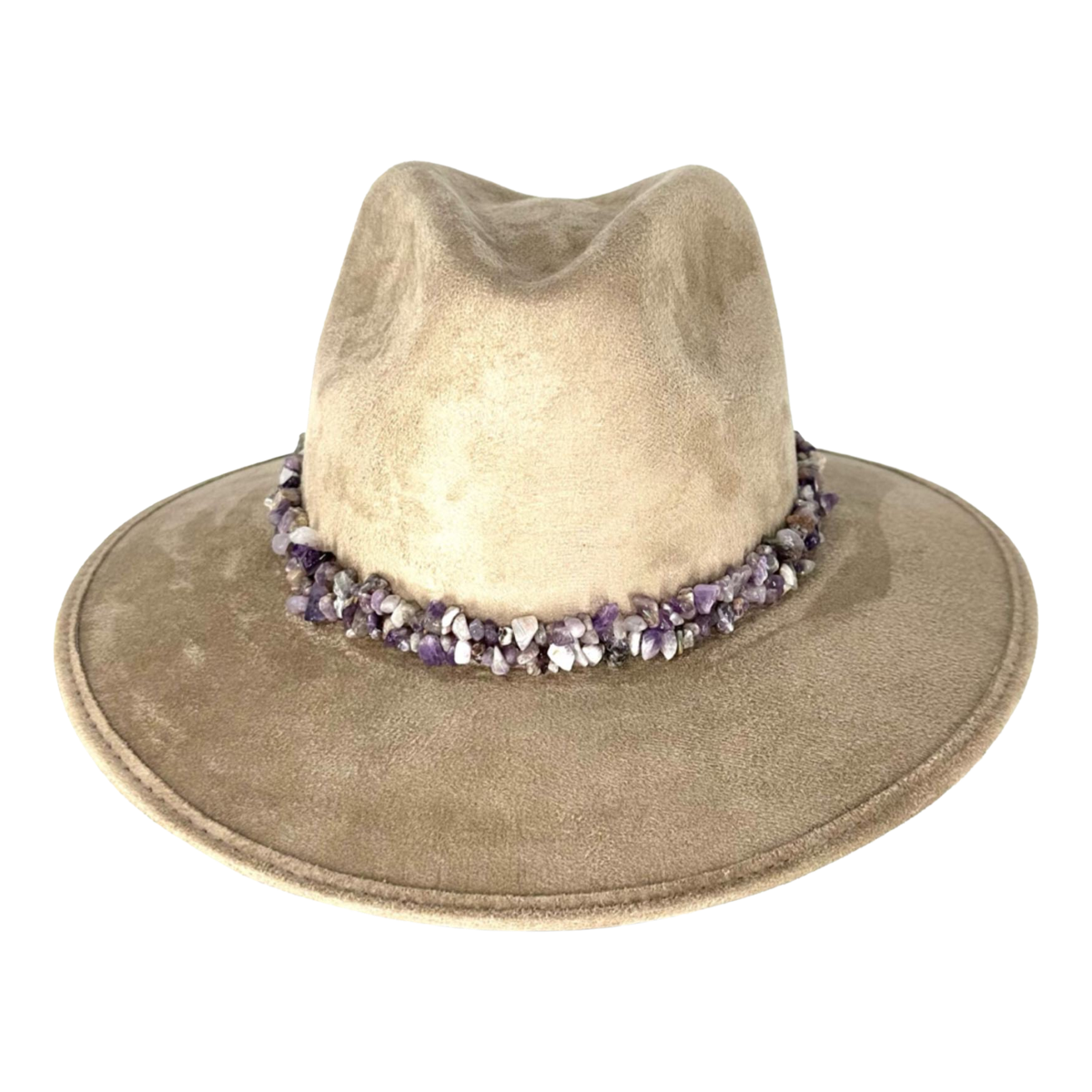 One of the standout features of this hat is the bond made of small purple stones that is wrapped around the base of the crown. The stones are beautifully designed and add a touch of elegance and charm to the hat. This feature is perfect for anyone who wants to add a pop of color and sparkle to their outfit.