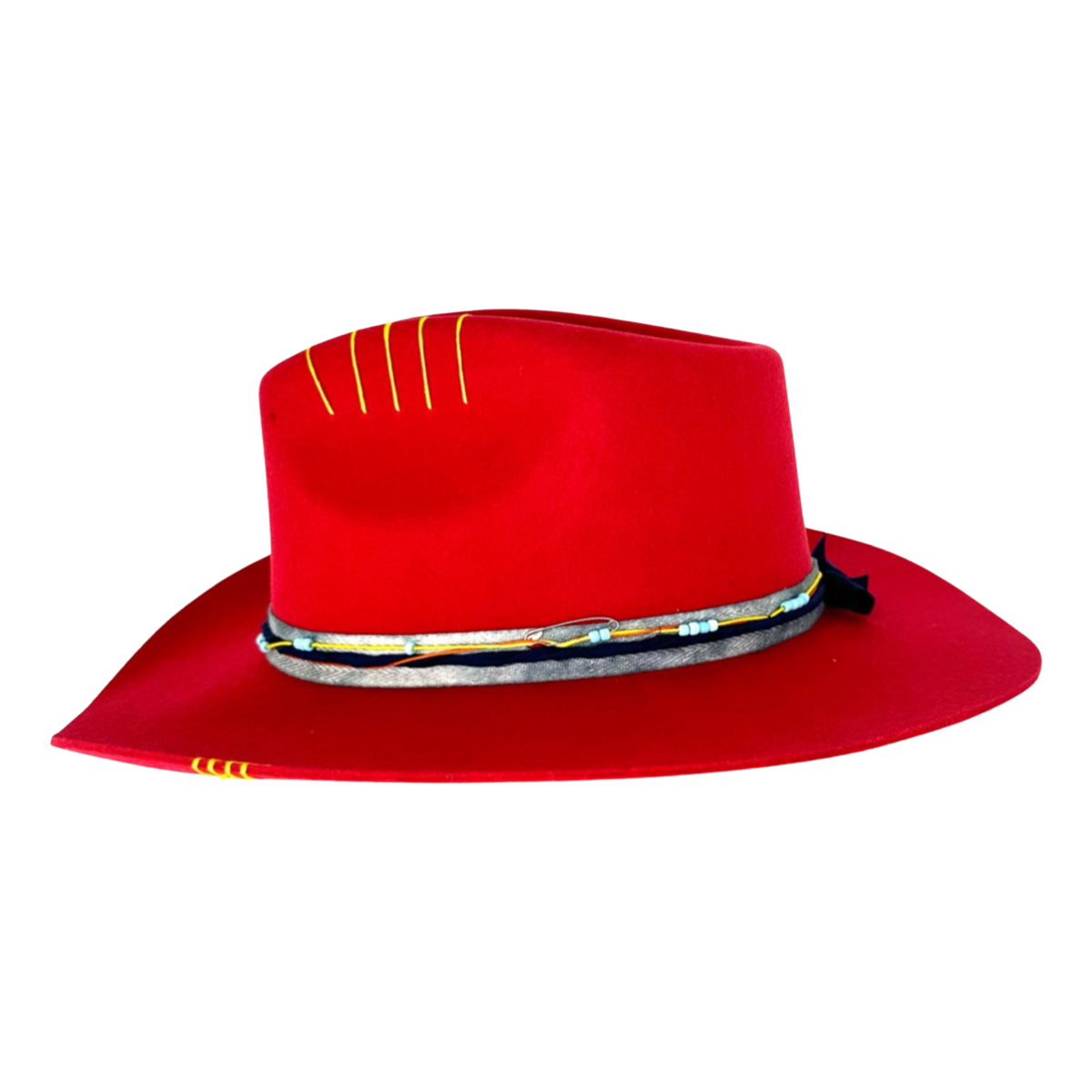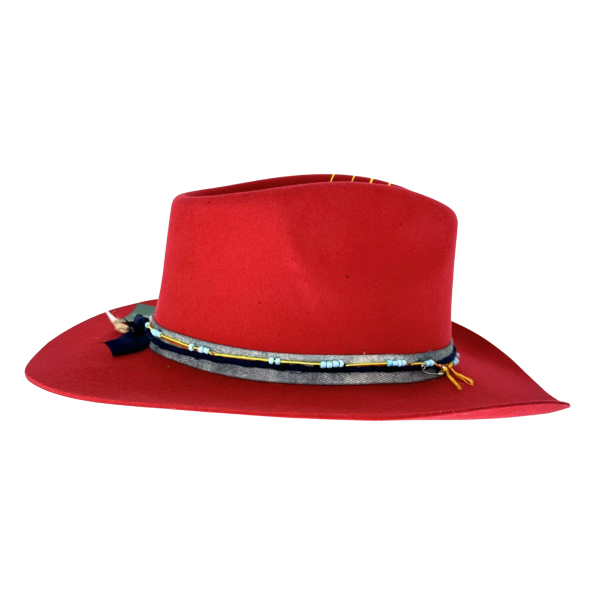 The Tuluminati Wool Hat in red is a stylish and eye-catching hat from Amber Hats. This hat is made from high-quality wool, which makes it warm and comfortable for colder weather. The design features a classic fedora shape with a wide brim that provides shade and protection from the sun.