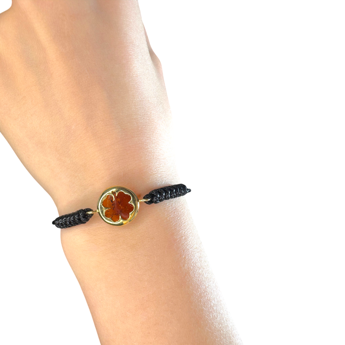 “Four-Leaf Clover” Bracelet with Black Cord, Gold-Plated Silver Details & Natural Amber (Adjustable)