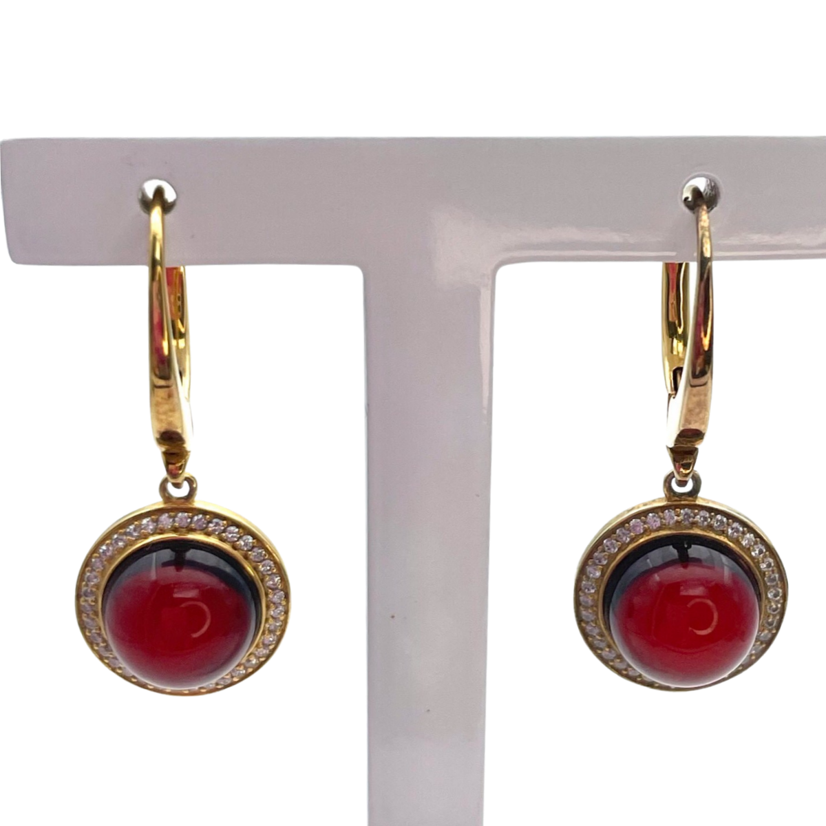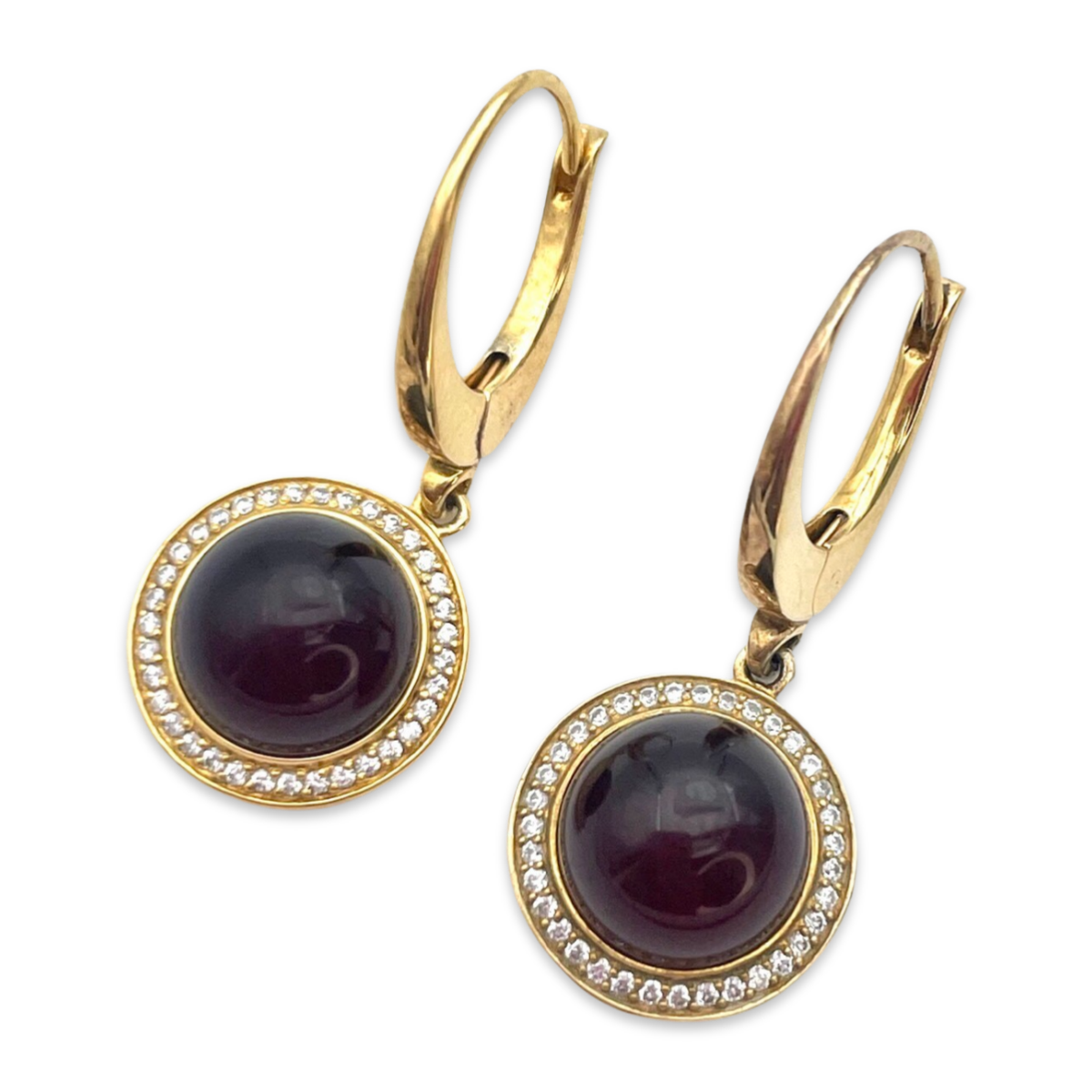 Whether you're dressing up for a special occasion or adding a touch of elegance to your everyday look, these gold-plated earrings with dark red amber and zircon stones are sure to impress. Their high-quality craftsmanship and timeless design make them a piece of jewelry that will be treasured for years to come.