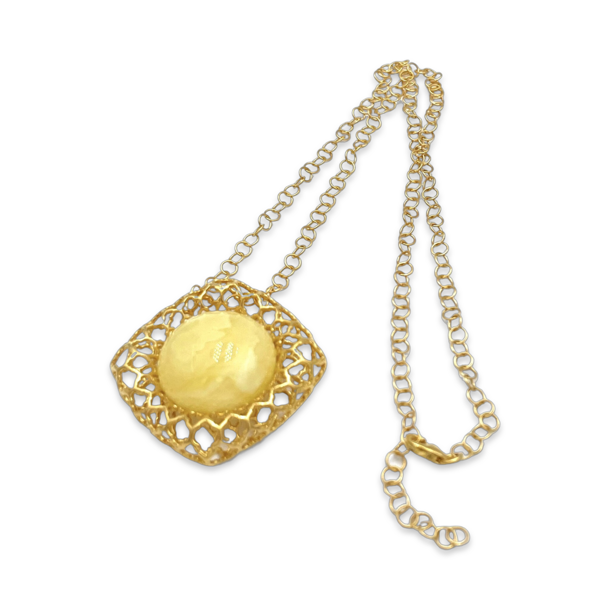 这款美丽的项链饰有一个由惊艳的琥珀制成的吊坠,悬挂在镀金银链上。琥珀是一种独特的宝石,是化石化的树脂,拥有美丽的天然色彩和纹理。链条和吊坠上的24K镀金增添了一丝奢华感,提升了整体美感。链条长度可调,允许您根据服装或喜好佩戴不同长度。琥珀被认为具有疗愈功效,也被说能带来好运和繁荣,使这条项链不仅是一件美丽的饰品,更具有深刻的意义。这款琥珀镀金项链适合任何场合,无论是正式活动还是休闲外出,都是一件永不过时的作品,是任何珠宝收藏的绝佳补充。