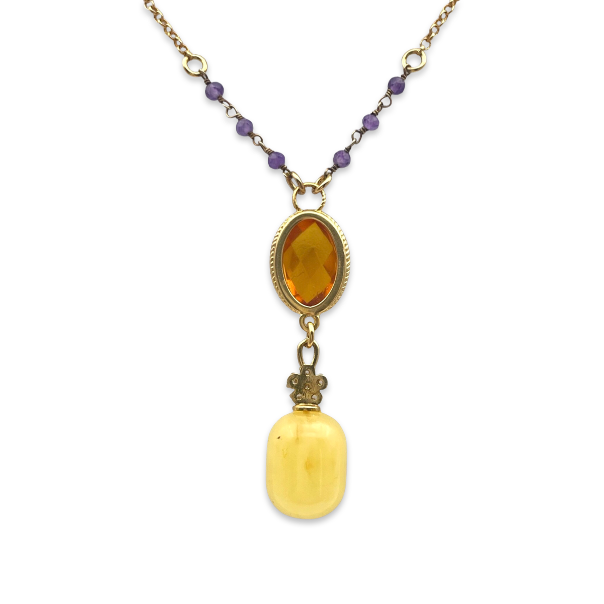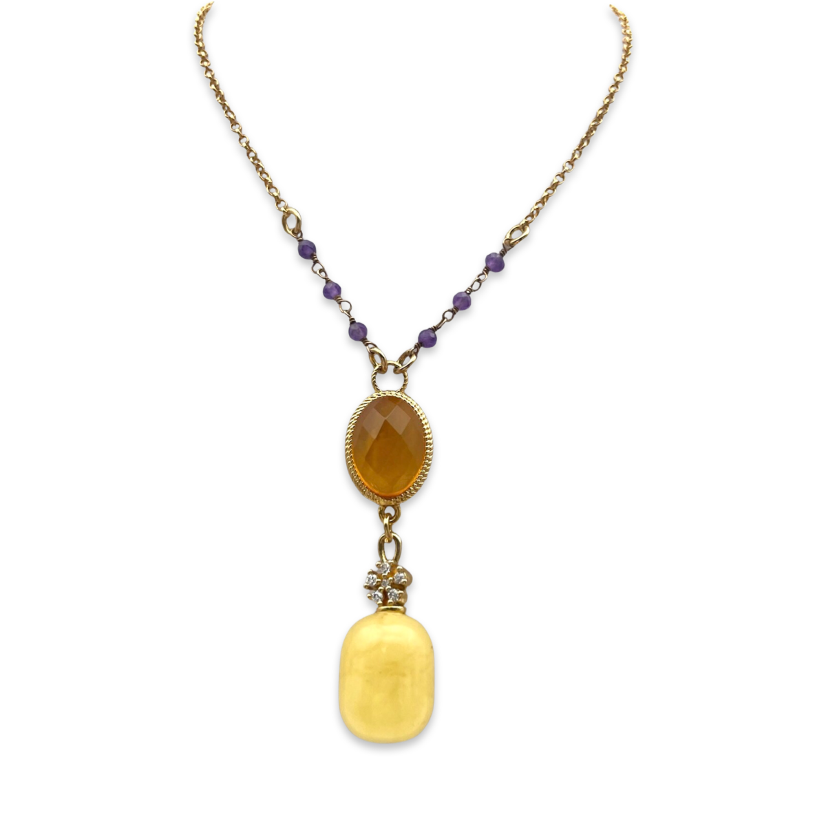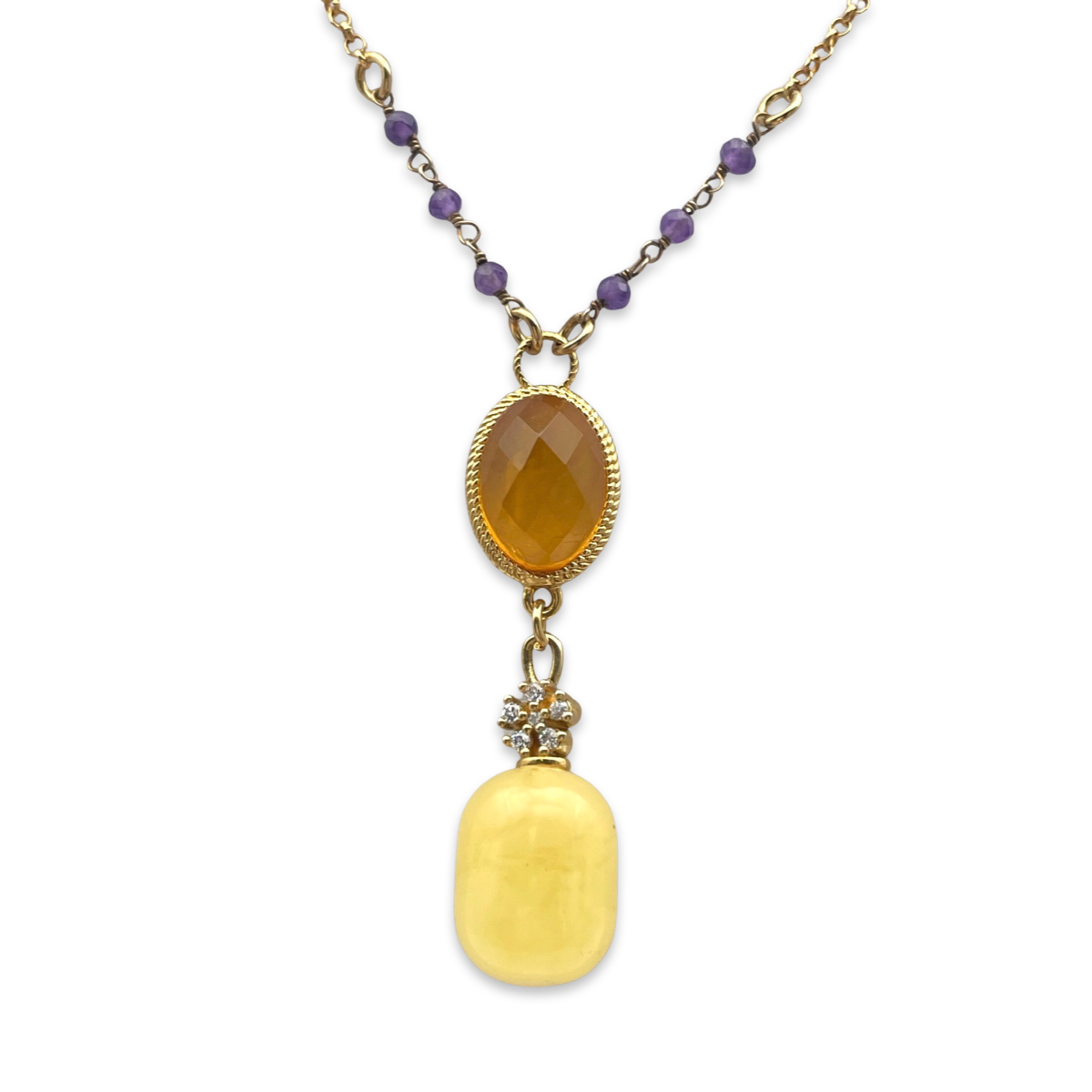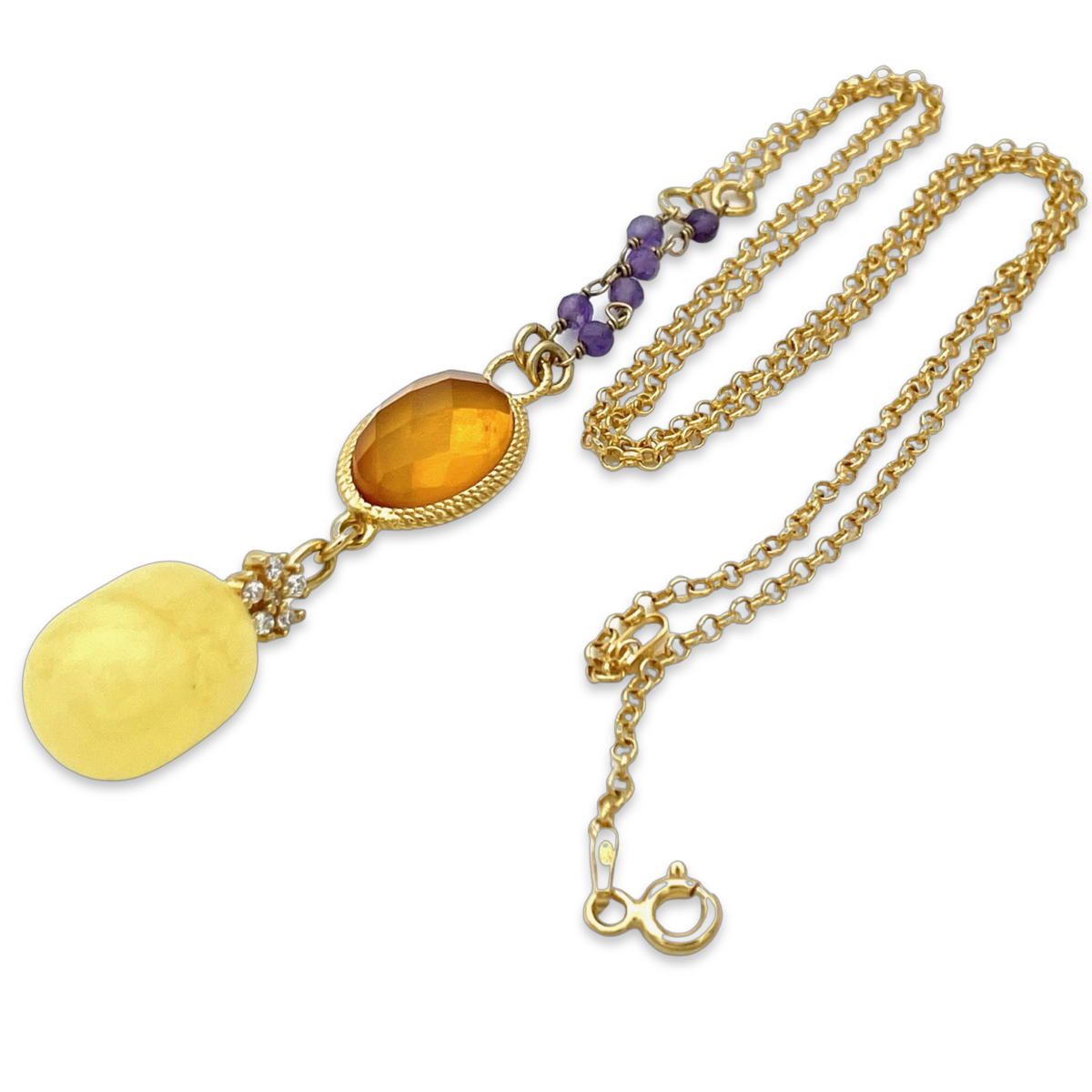 This exquisite necklace features a beautiful amber pendant that is elegantly complemented by sparkling zircon and amethyst stones. The pendant is crafted from high-quality amber and features a stunning gold-plated 24k finish that adds a touch of luxury and sophistication to the piece.The zircon and amethyst stones create a striking contrast that catches the eye and adds to the overall beauty of the necklace.The necklace itself is made from durable and lightweight materials, making it comfortable to wear throughout the day.Whether you're dressing up for a special occasion or adding a touch of elegance to your everyday look, this amber gold-plated necklace is sure to become a treasured piece in your jewelry collection.