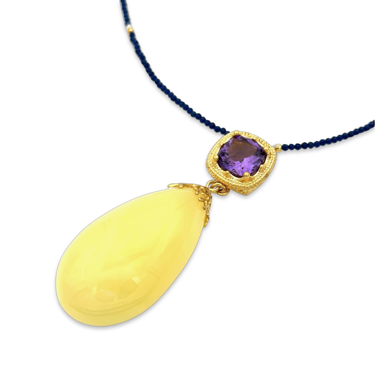 This necklace features a beautiful amber pendant and amethyst stones with gold-plated details. The pendant is made from genuine amber, which has been carefully selected for its natural beauty and unique characteristics. The amethyst stones are also of high quality, and have been hand-cut and polished to enhance their natural sparkle and color. The gold-plated 24k details add a touch of elegance and luxury to the overall design of the necklace. The necklace itself is made from durable materials and is designed to be comfortable to wear. It is perfect for adding a touch of sophistication to any outfit, and makes a great gift for someone special.
