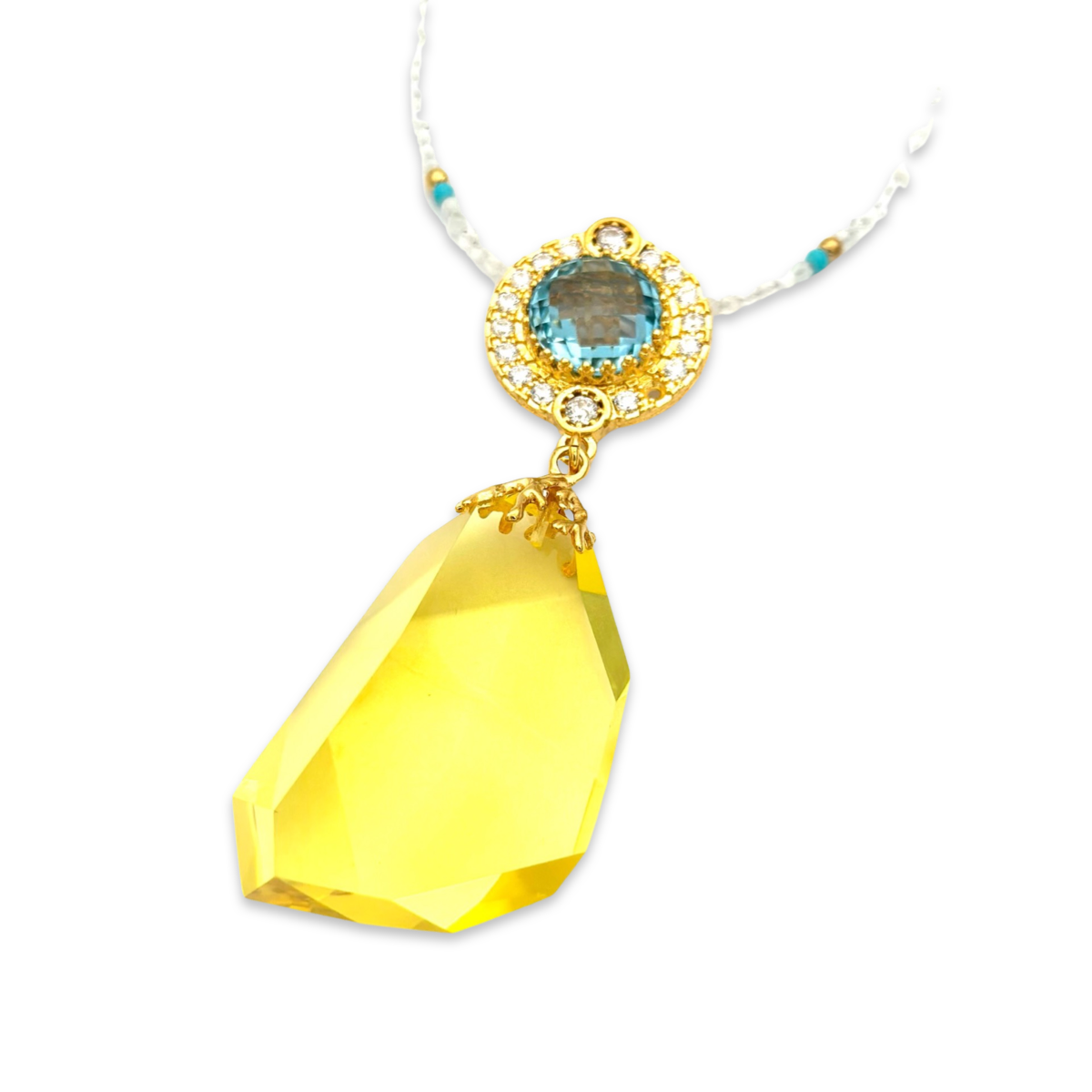 This exquisite necklace features a stunning faceted amber and topaz pendant with intricate gold-plated 24k details. The warm, honey-colored tones of the amber stone are beautifully complemented by the gold-plated accents, creating a truly luxurious and elegant piece of jewelry.