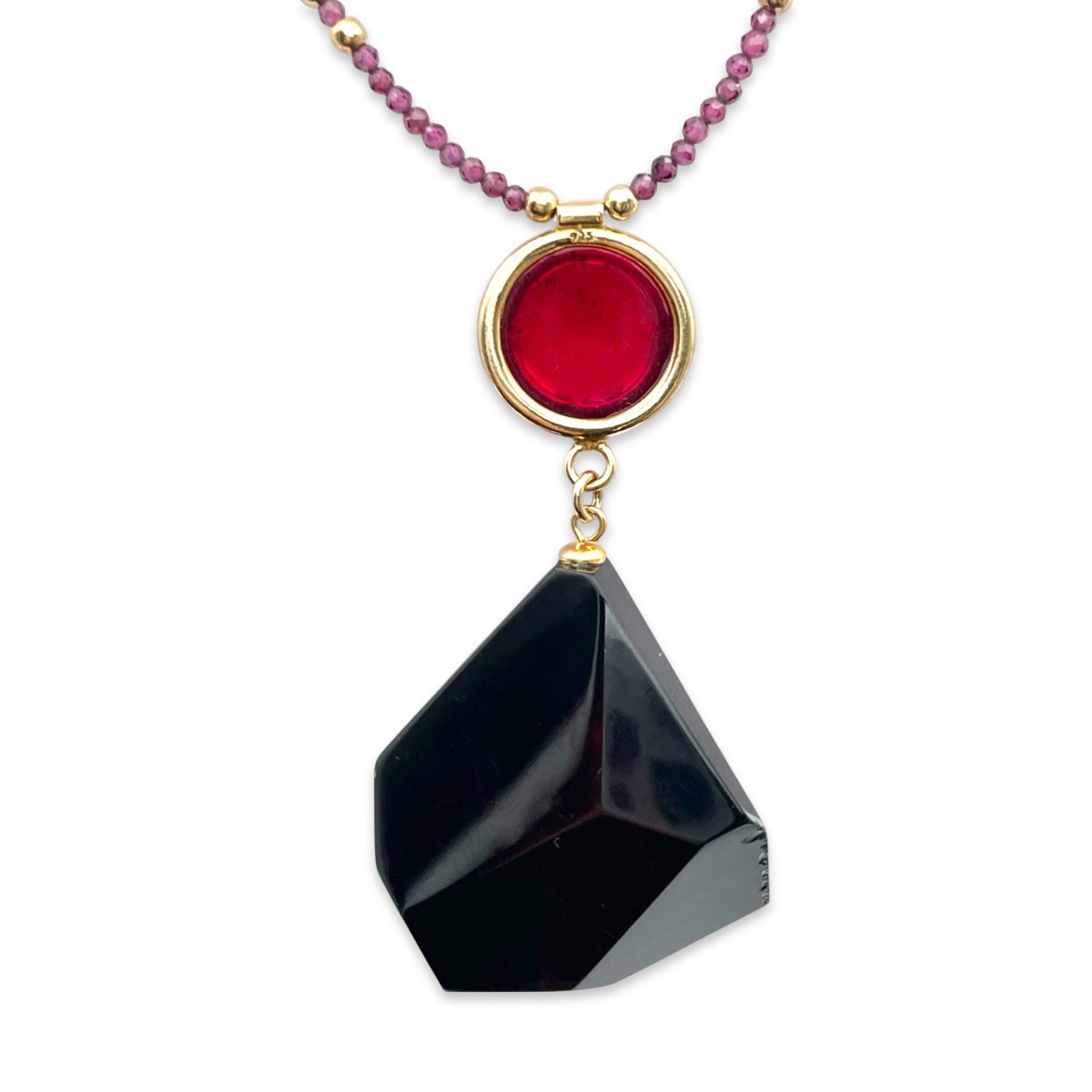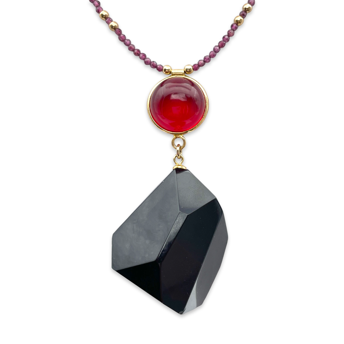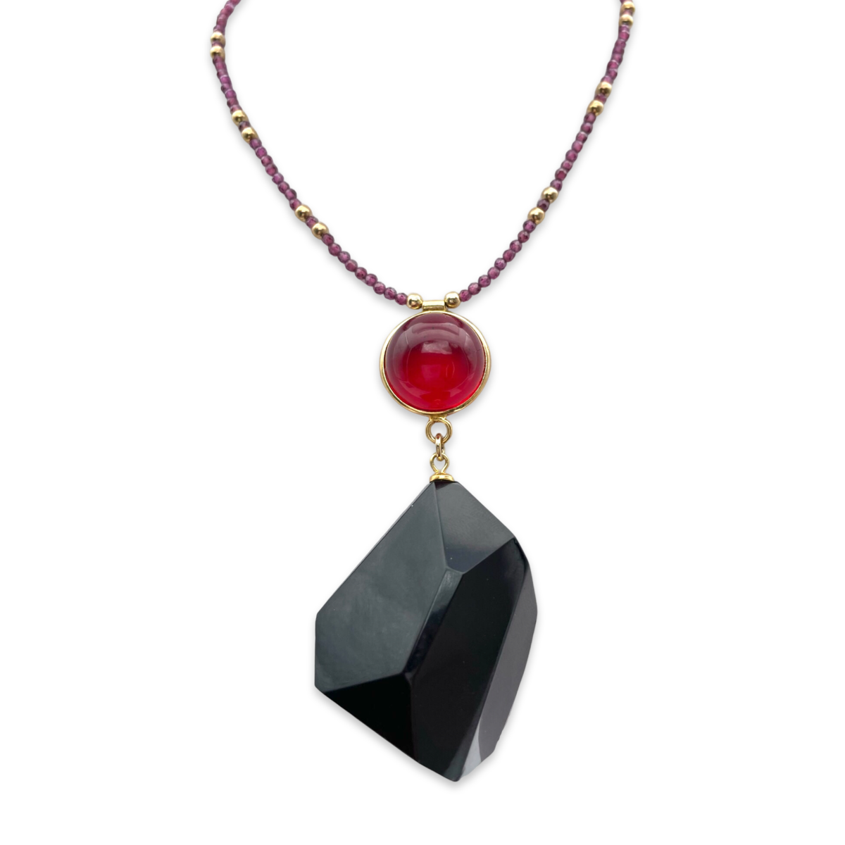 This page features a beautiful necklace with a black amber pendant and red amber with gold-plated 24k details. The necklace is expertly crafted by skilled artisans and made of high-quality materials to ensure durability and longevity.