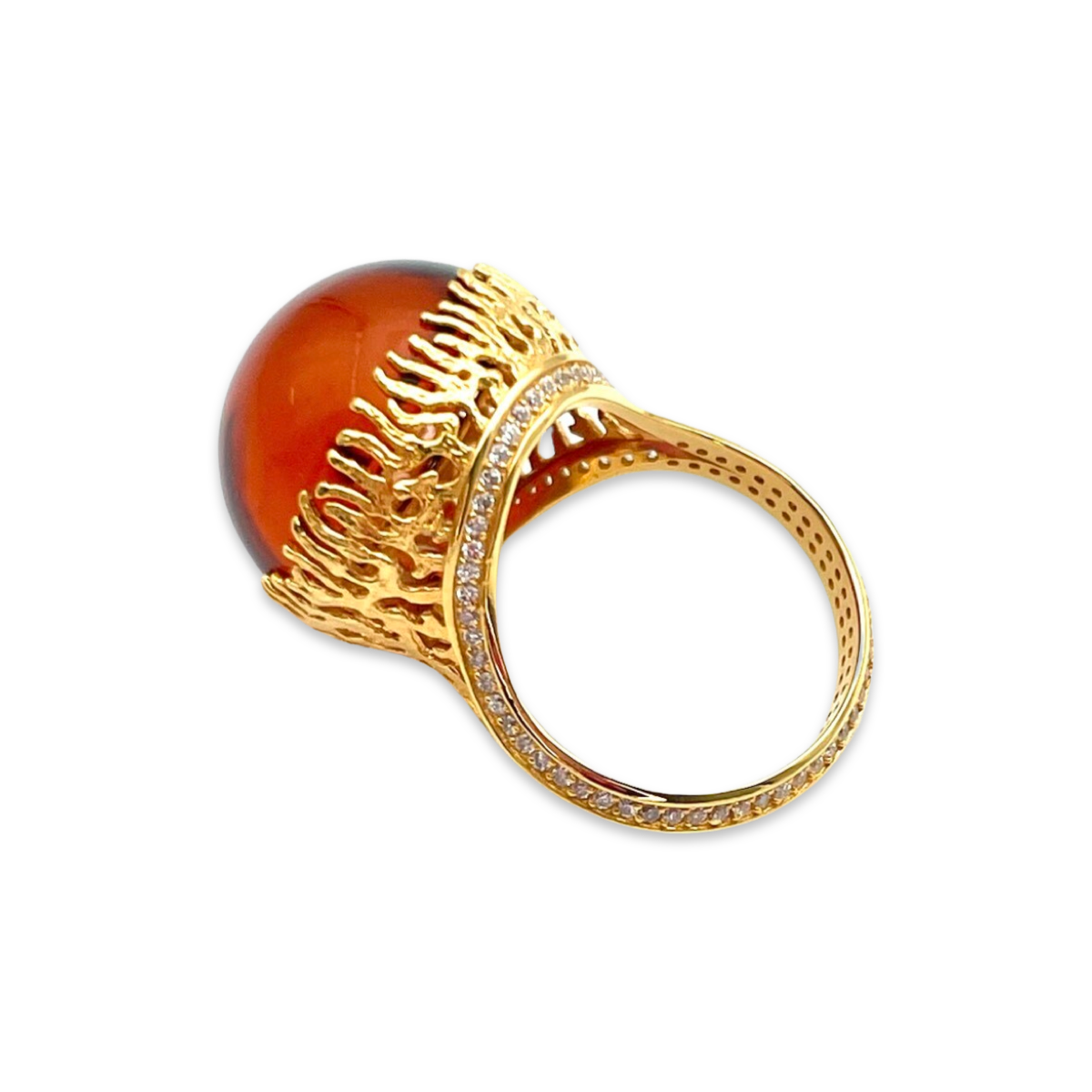 这款令人惊艳的镀金戒指结合了天然红色琥珀和闪耀的锆石,经过精湛工艺打造,呈现出一件真正精美的珠宝作品。红色琥珀温暖而炽烈的色调与明亮闪烁的锆石相得益彰,形成大胆而醒目的对比。戒指的戒圈采用高品质银材质镀金,确保持久耐用,而精致的镶嵌工艺则展现了宝石的美丽。戒指设计独特,色彩搭配大胆,造型引人注目。非常适合为任何服装增添一抹魅力,这款镀金红色琥珀锆石戒指定会吸引众人目光。