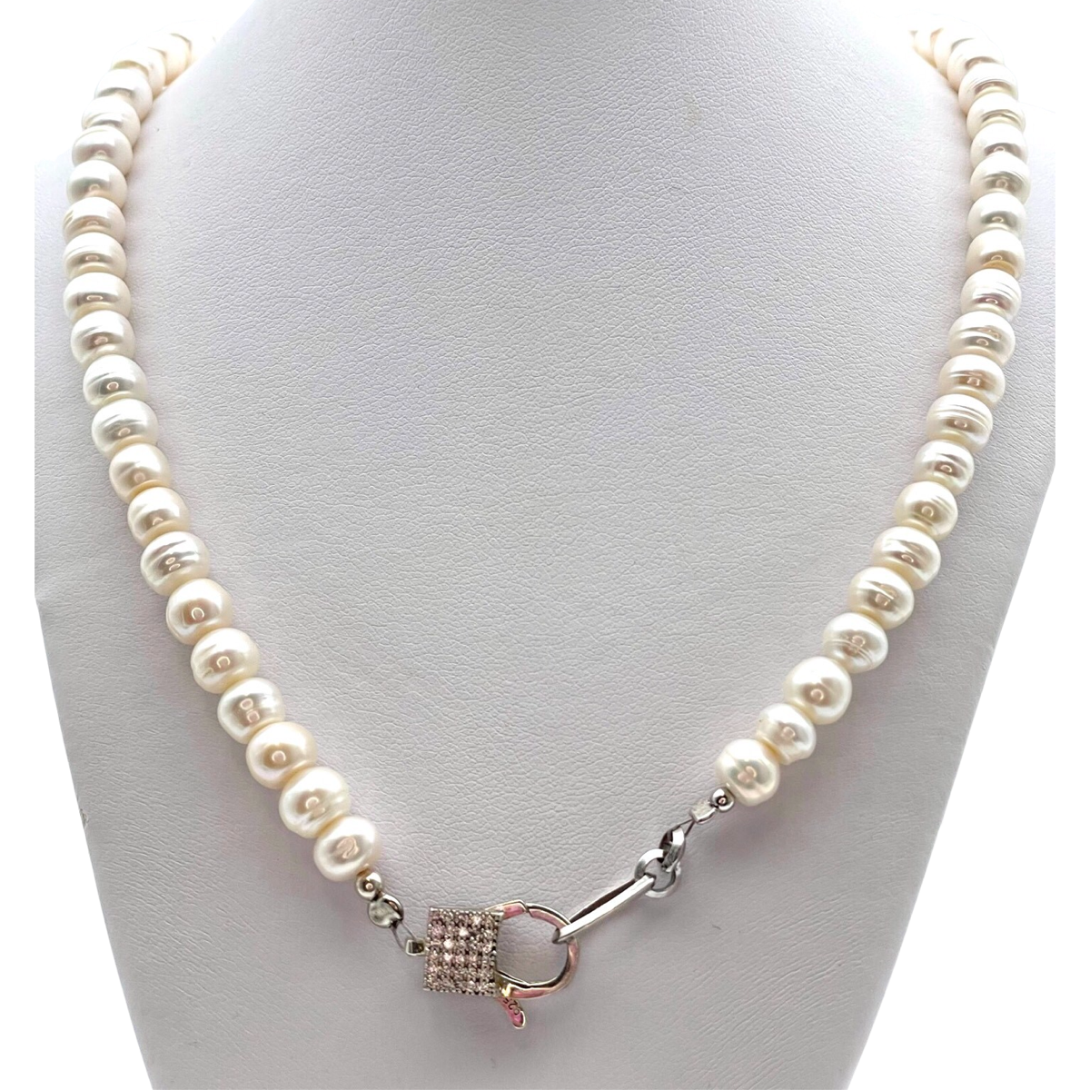 This is a pearl necklace from Amber Hats, featuring beautiful and classic white pearls. The necklace is a timeless piece of jewelry that can be worn for any occasion. The necklace has a silver clasp, which adds a touch of elegance to the design.