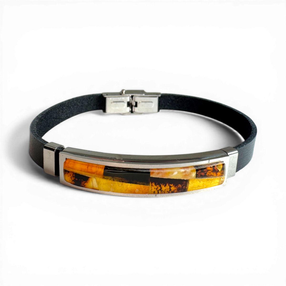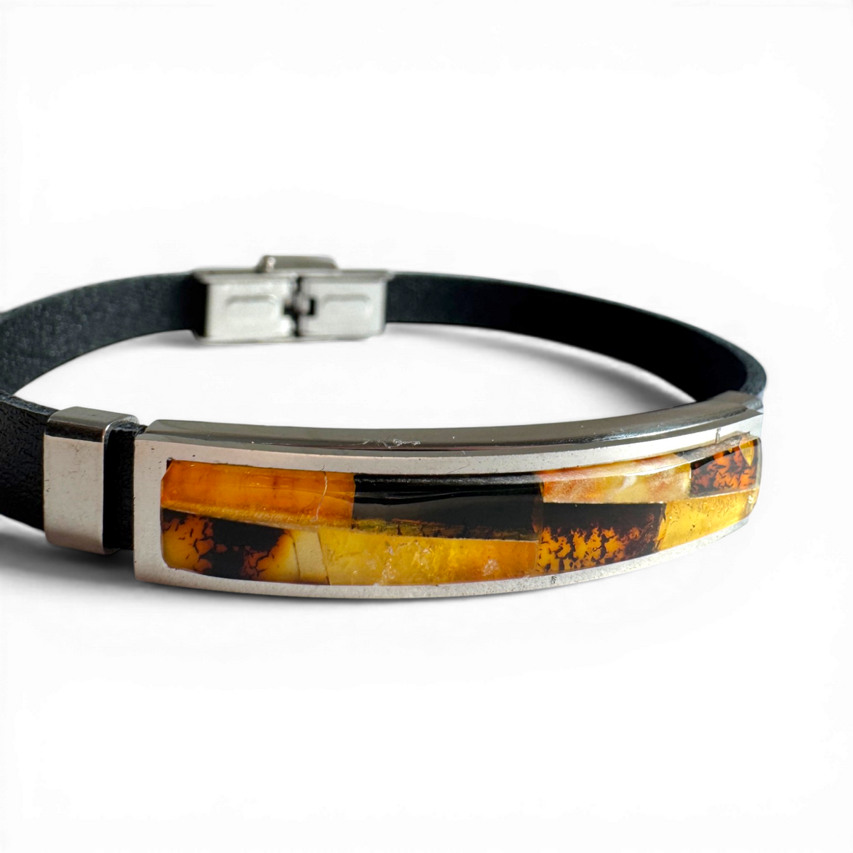 The Vibe: Effortless "cool" with a prehistoric edge. This piece blends the durability of steel with the organic comfort of leather, centered by a radiant amber soul.