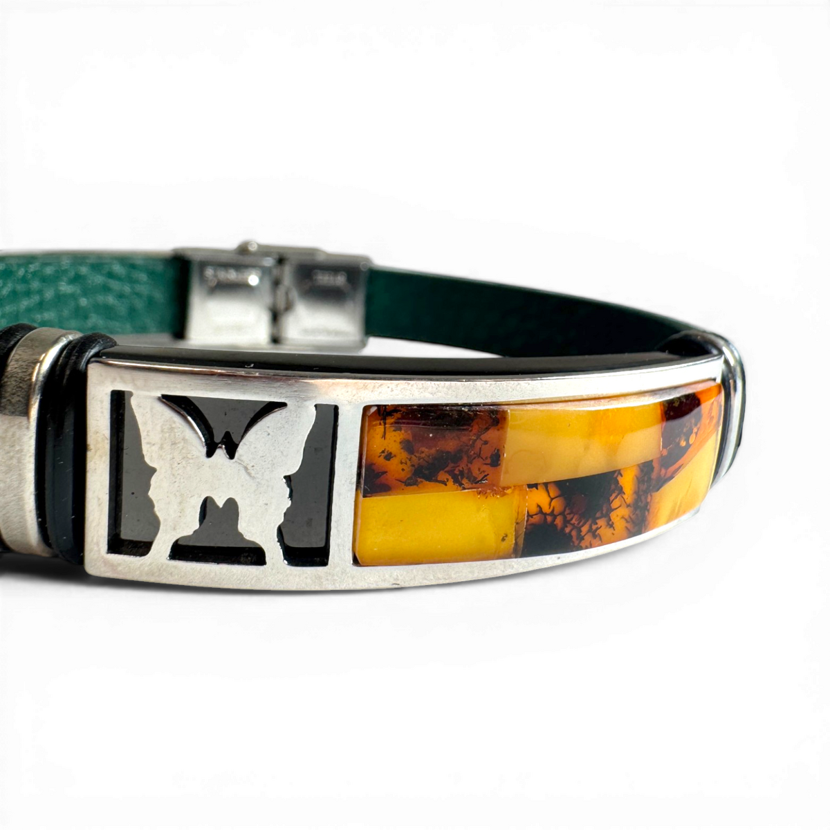 The Vibe: Effortless "cool" with a prehistoric edge. This piece blends the durability of steel with the organic comfort of leather, centered by a radiant amber soul.