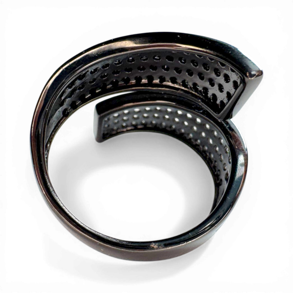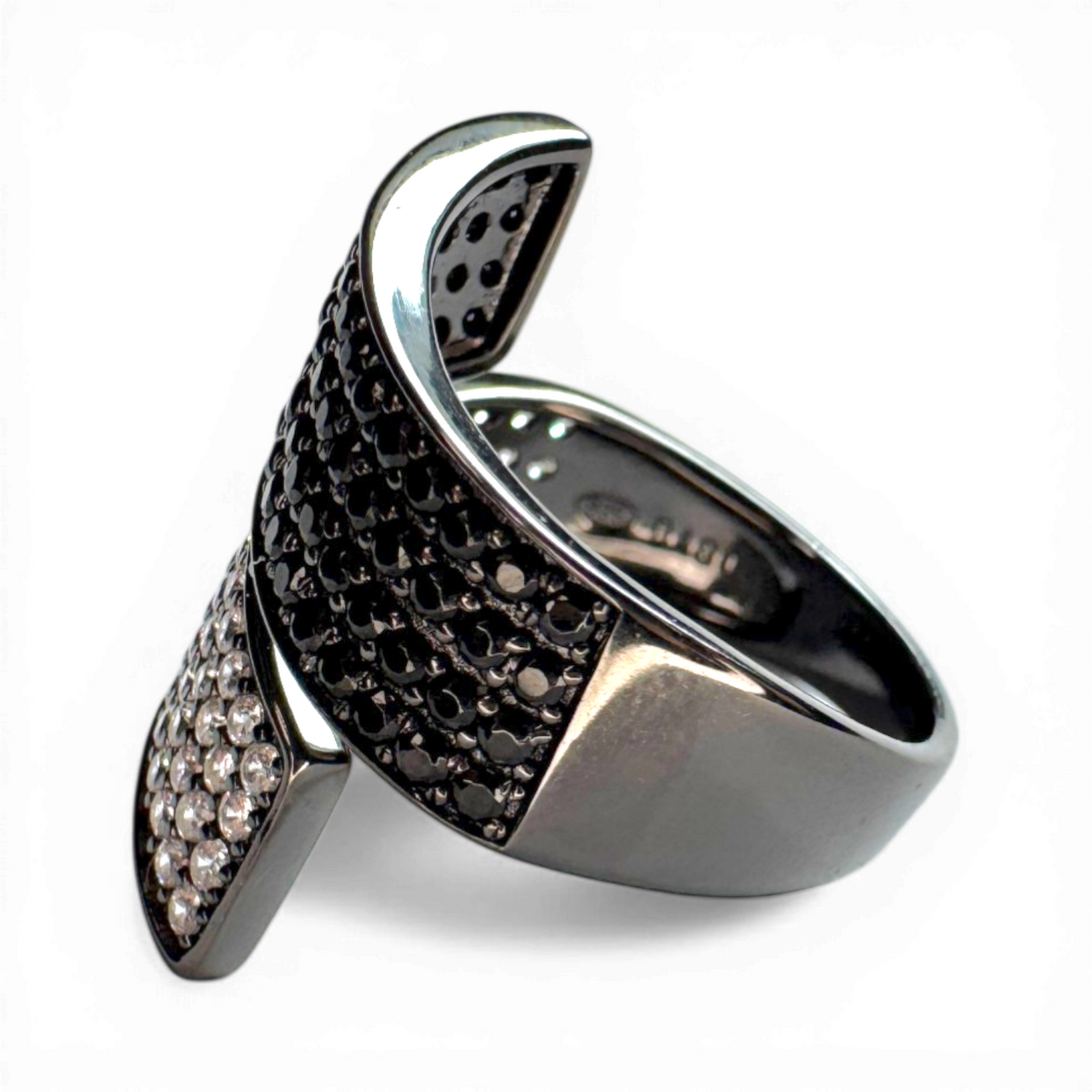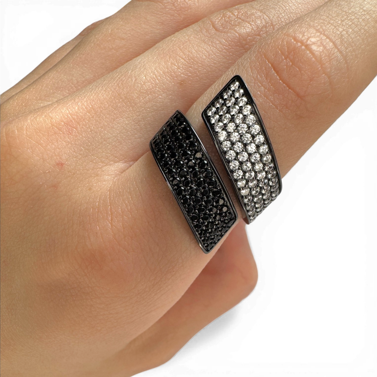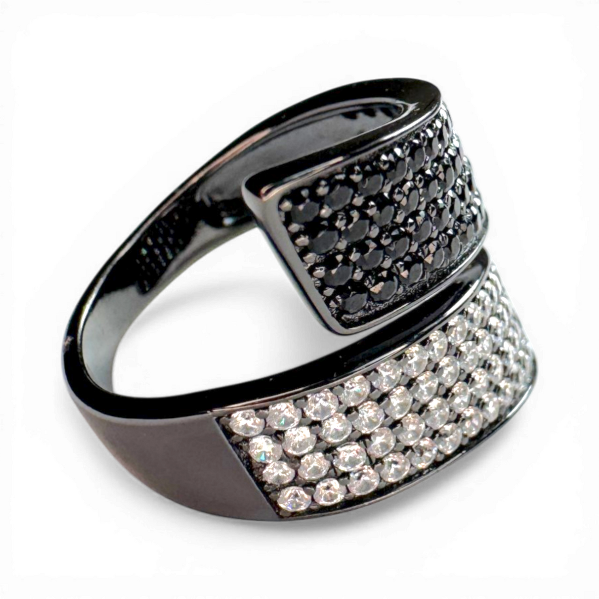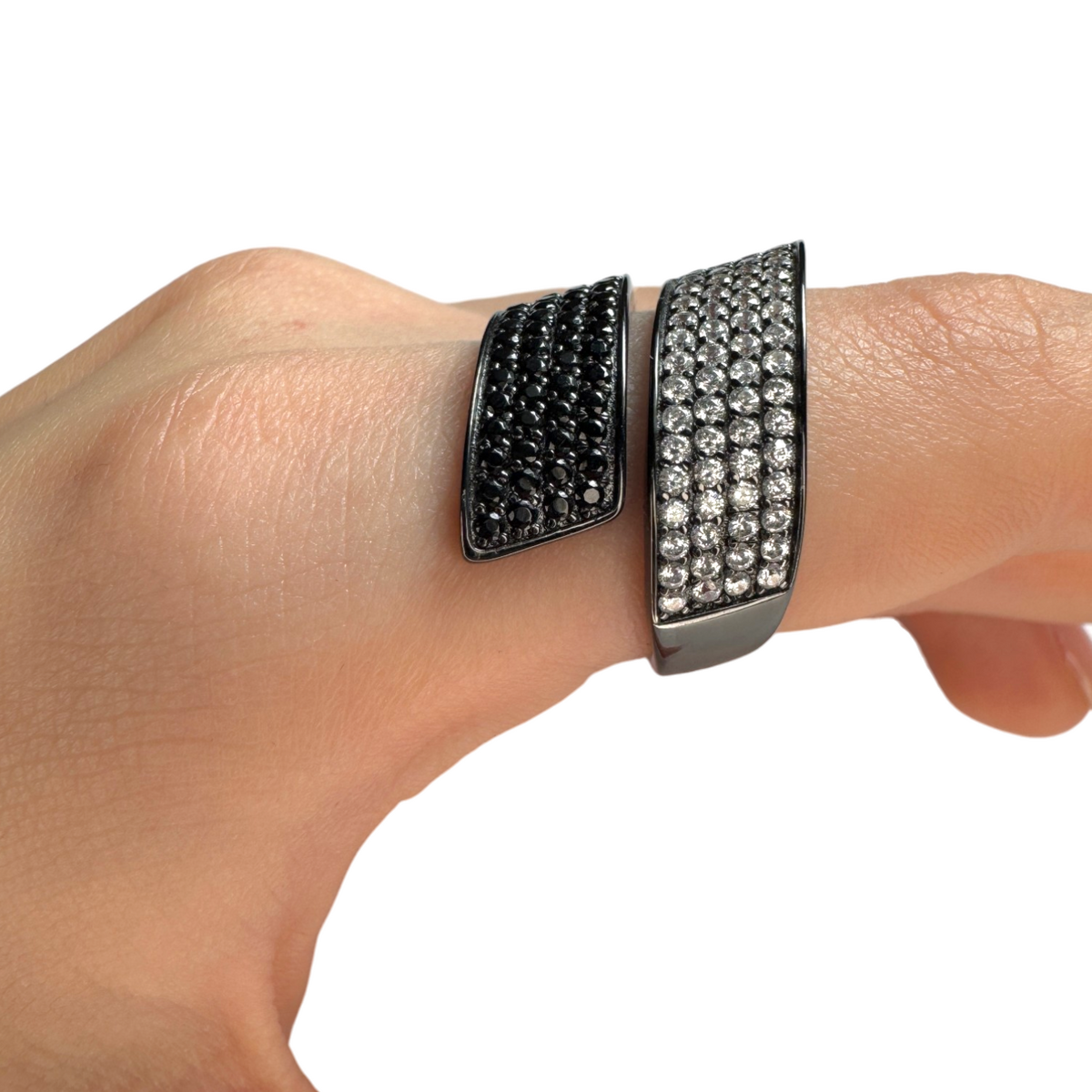 A modern contrarier ring crafted from sterling silver 925, combining white and black zirconia for a bold contrast.