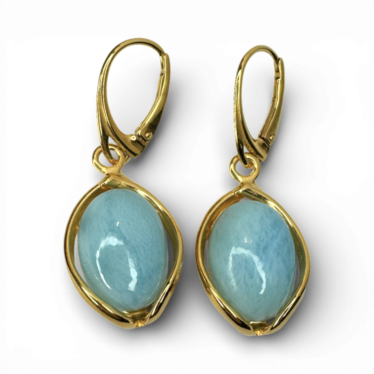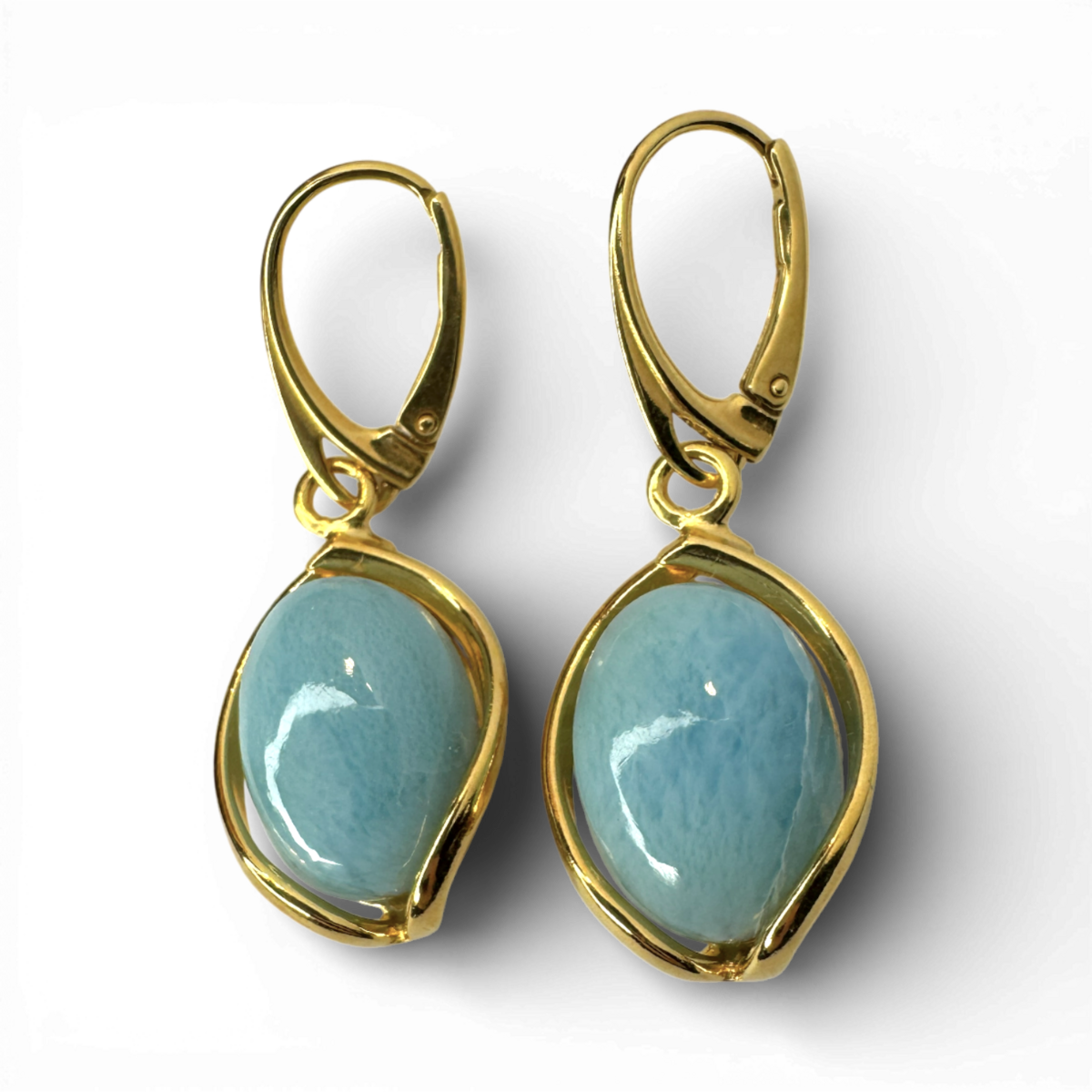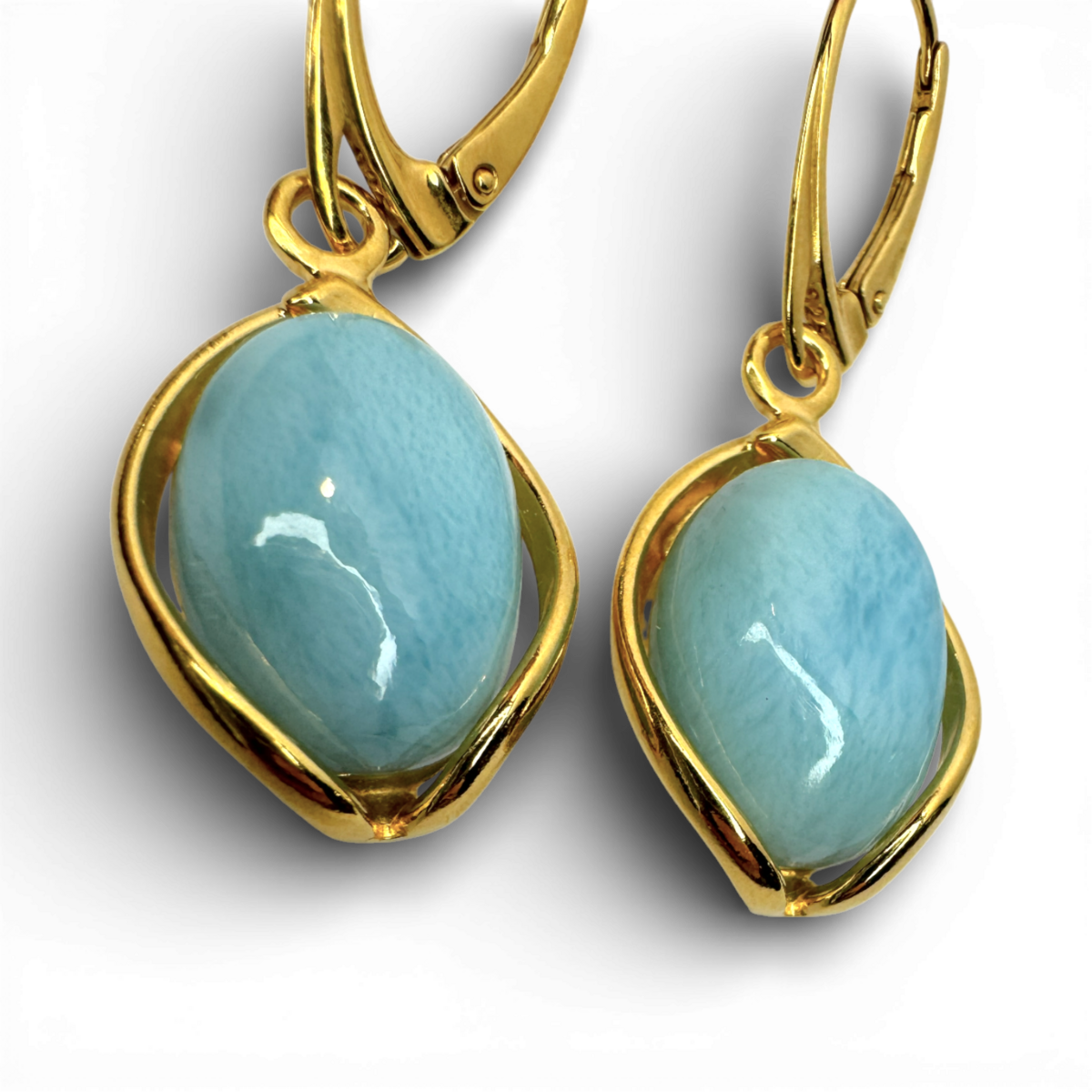 优雅的耳环由镀金银制成,饰以天然拉里玛石。石头柔和的蓝色调唤起宁静与精致奢华的感觉,而简洁的轮廓确保了永恒的魅力。精致、轻盈且毫不费力的时尚设计——旨在提升日常和晚间造型的品味。