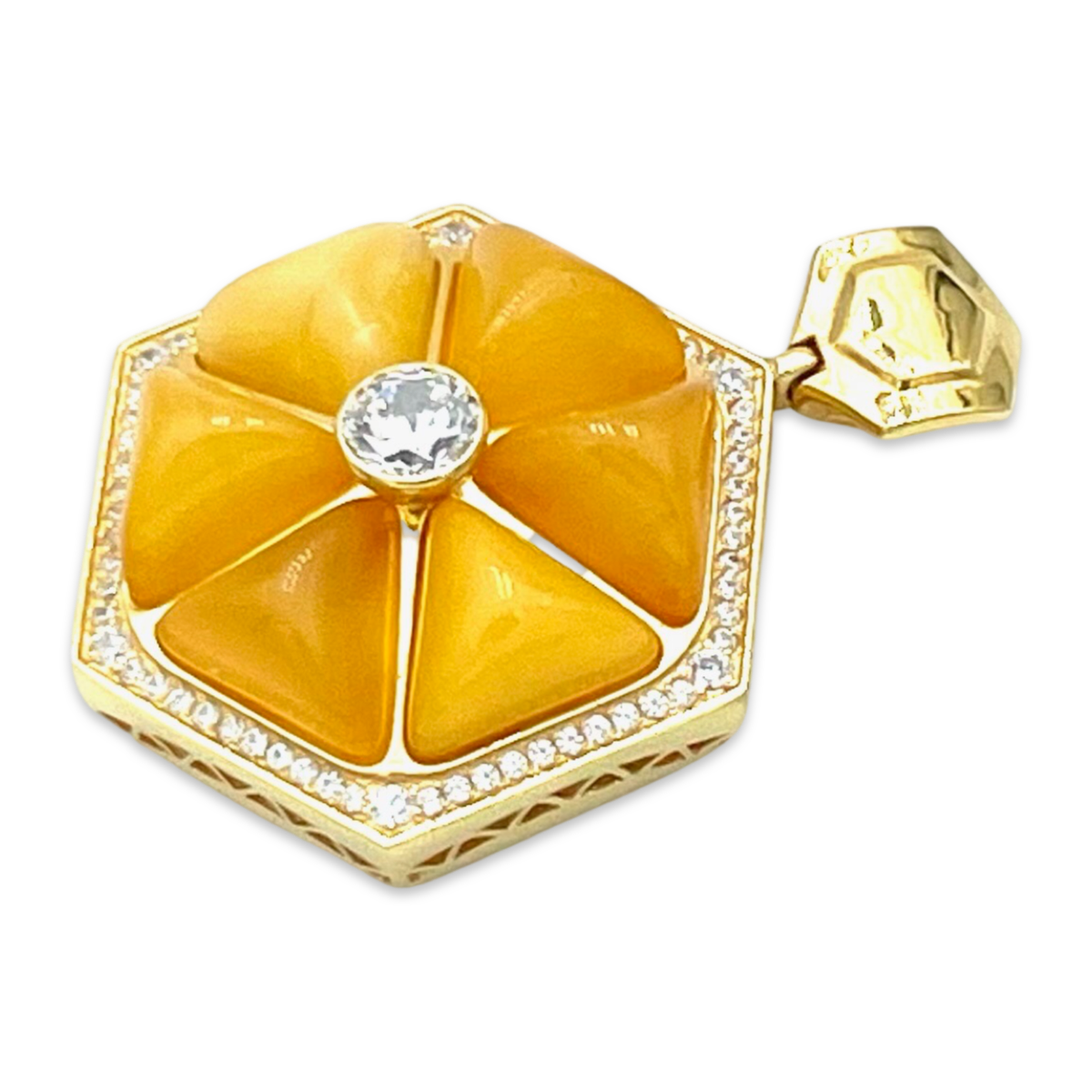 This gold-plated 24k pendant features a beautiful yellow amber stone, accented by sparkling zircon stones. The pendant is designed to hang from a chain, and is sure to make a statement with any outfit. The warm golden tones of the amber stone are complemented by the bright sparkle of the zircon stones, creating a piece that is both elegant and eye-catching. This pendant is a perfect gift for anyone who loves unique and beautiful jewelry.