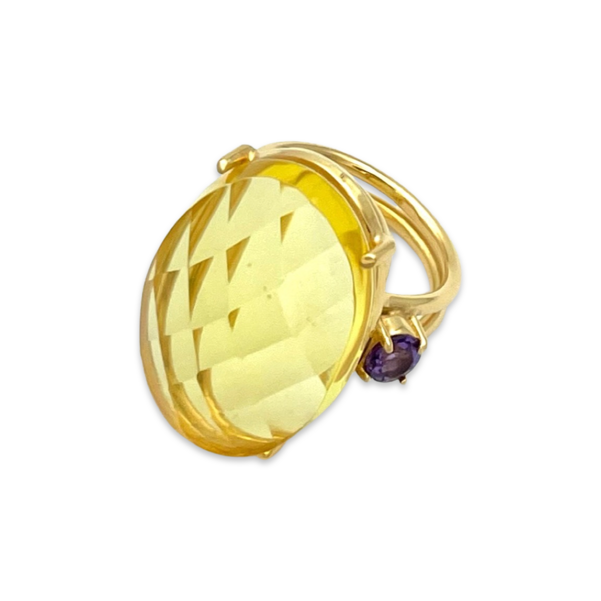 This gilded ring is a beautiful combination of light amber and purple amethyst gemstones. The amber is carefully selected for its warm, golden color, and is faceted to add a beautiful sparkle. The purple amethysts add a touch of elegance and complement the amber perfectly. The ring is gold-plated 24k for a luxurious look. It's a stunning piece of jewelry that will add a touch of sophistication and style to any outfit.
