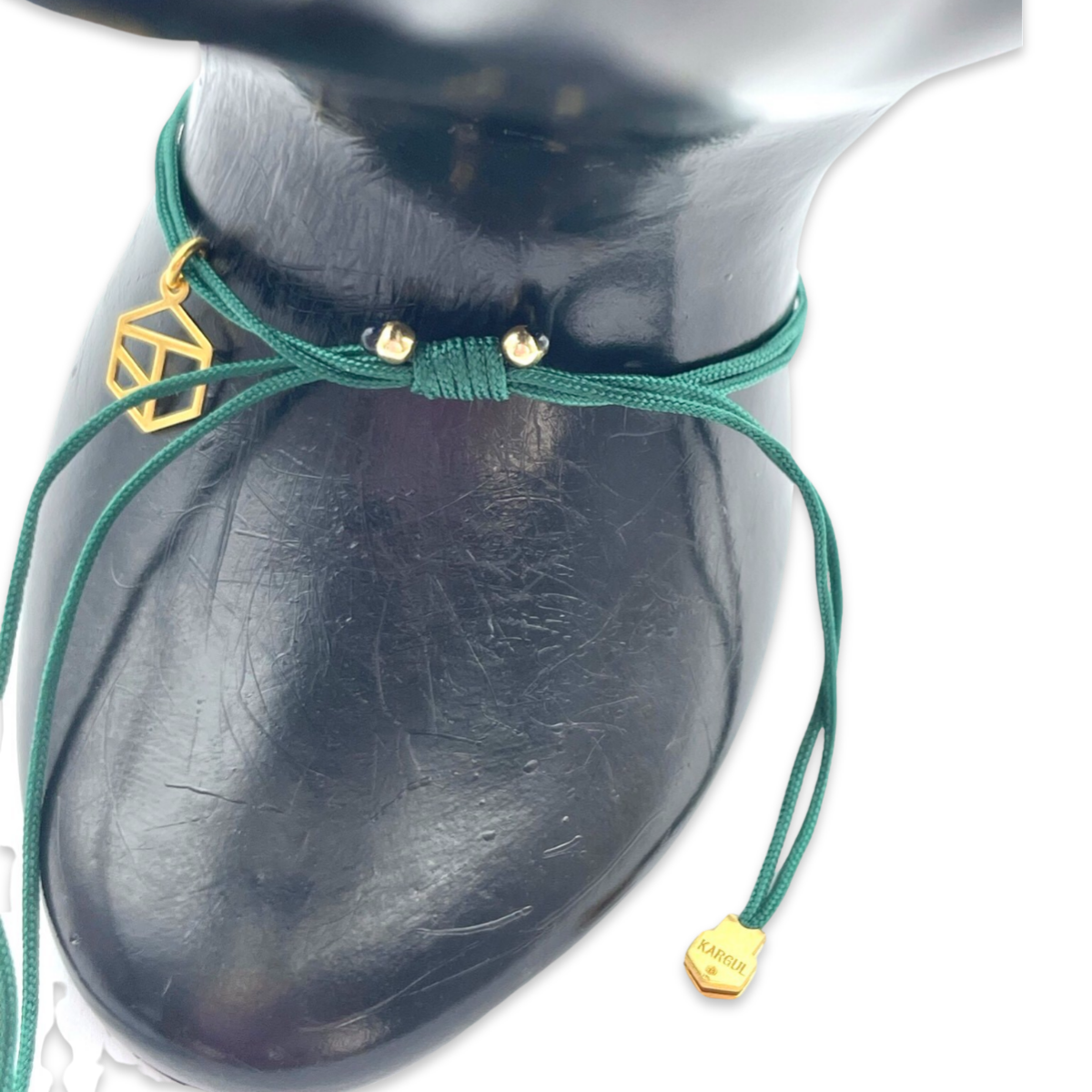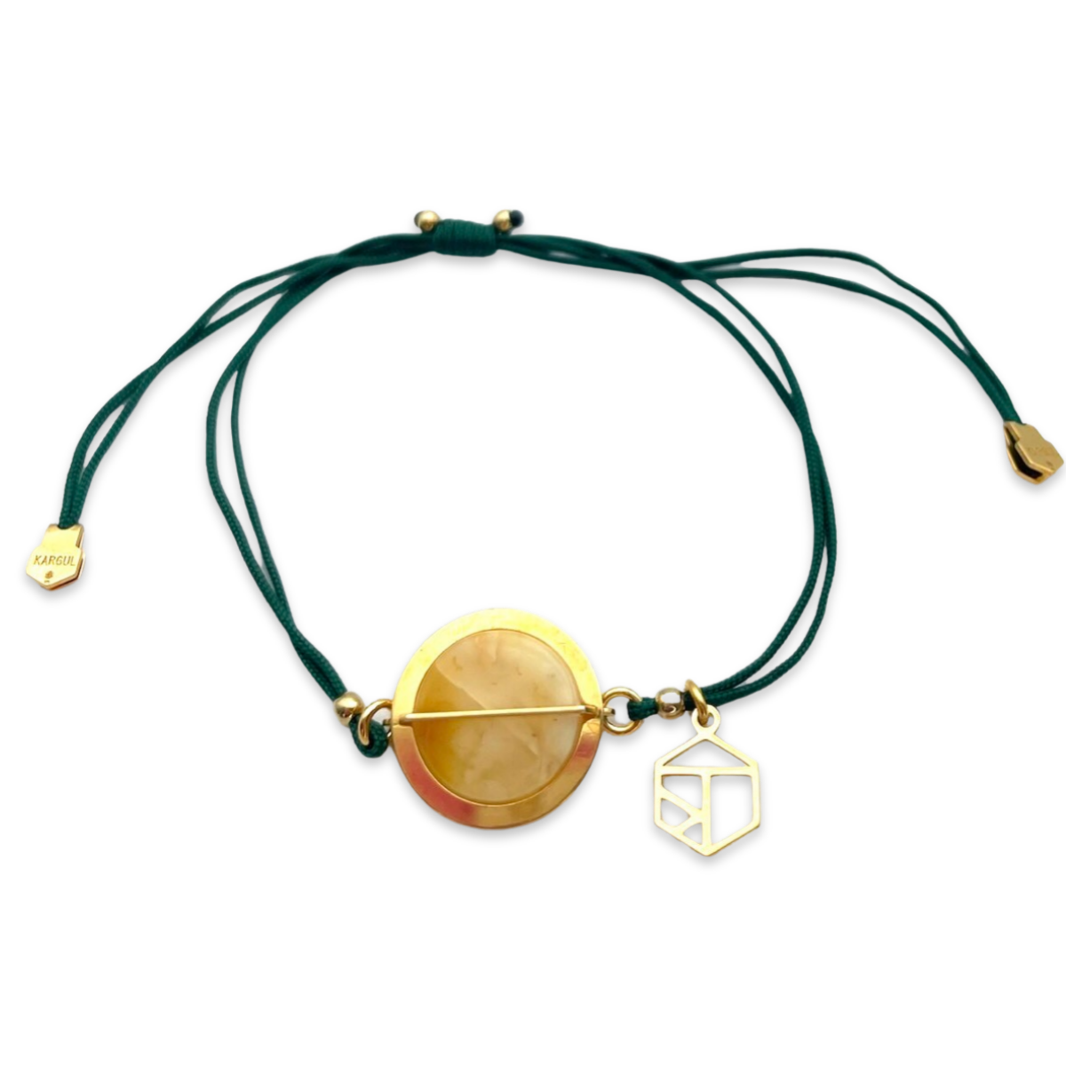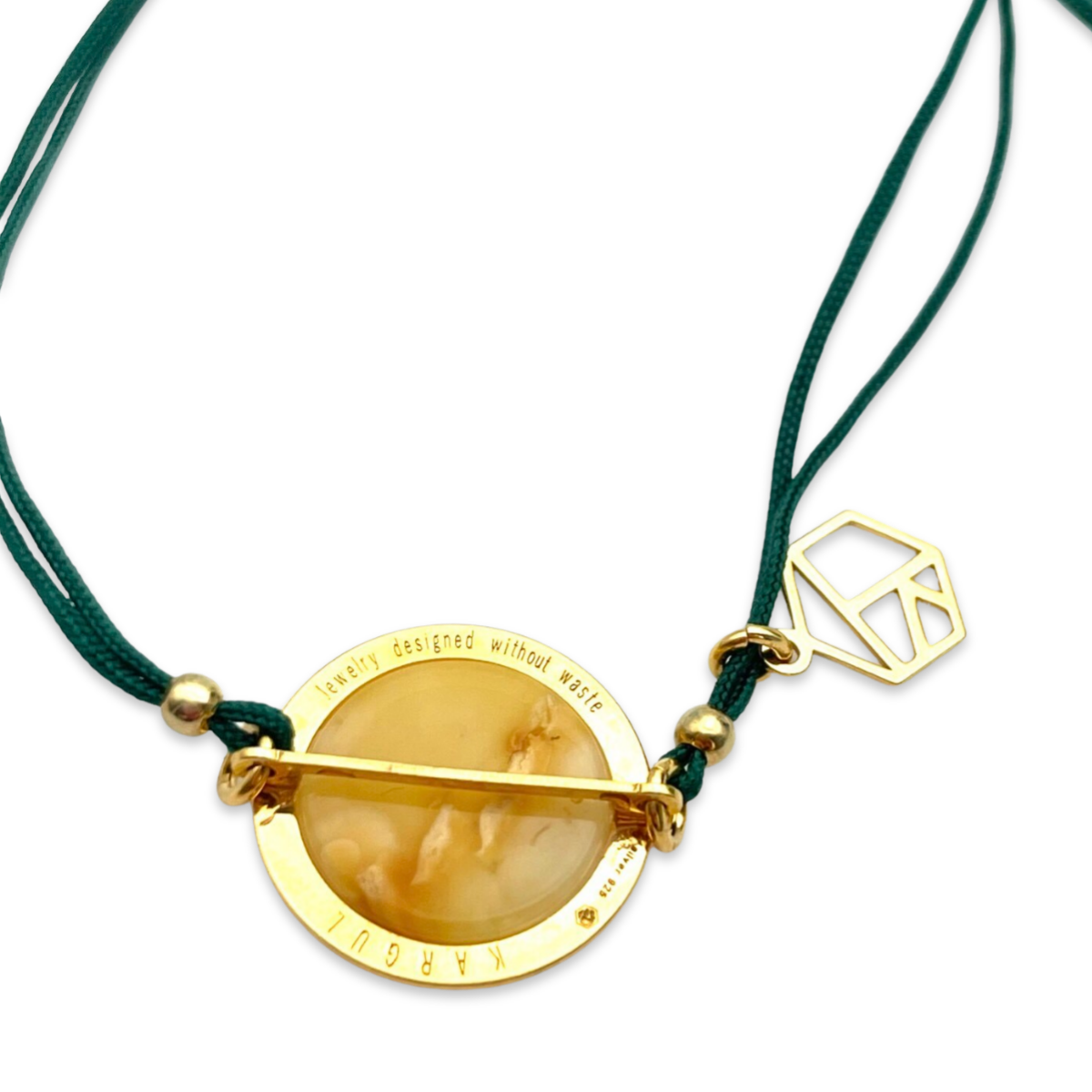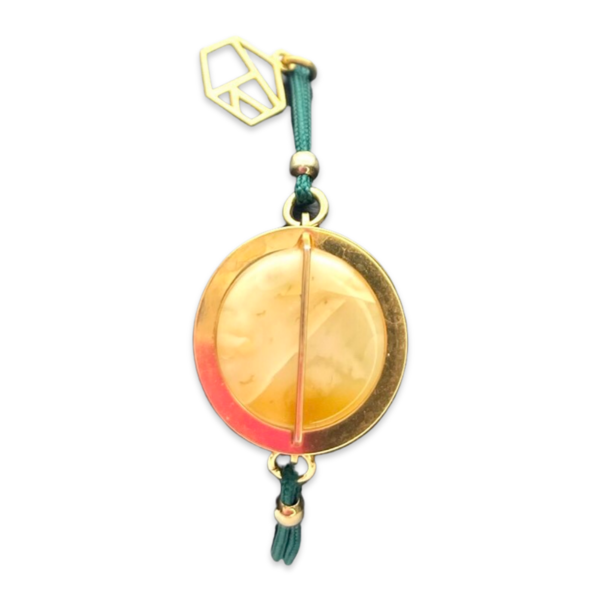 绿色线绳不仅为琥珀和金色提供了鲜明的对比,还为设计增添了一抹质朴感。材料的组合使这款手链成为一款多功能配饰,适合休闲和正式场合佩戴。