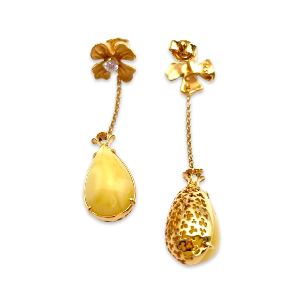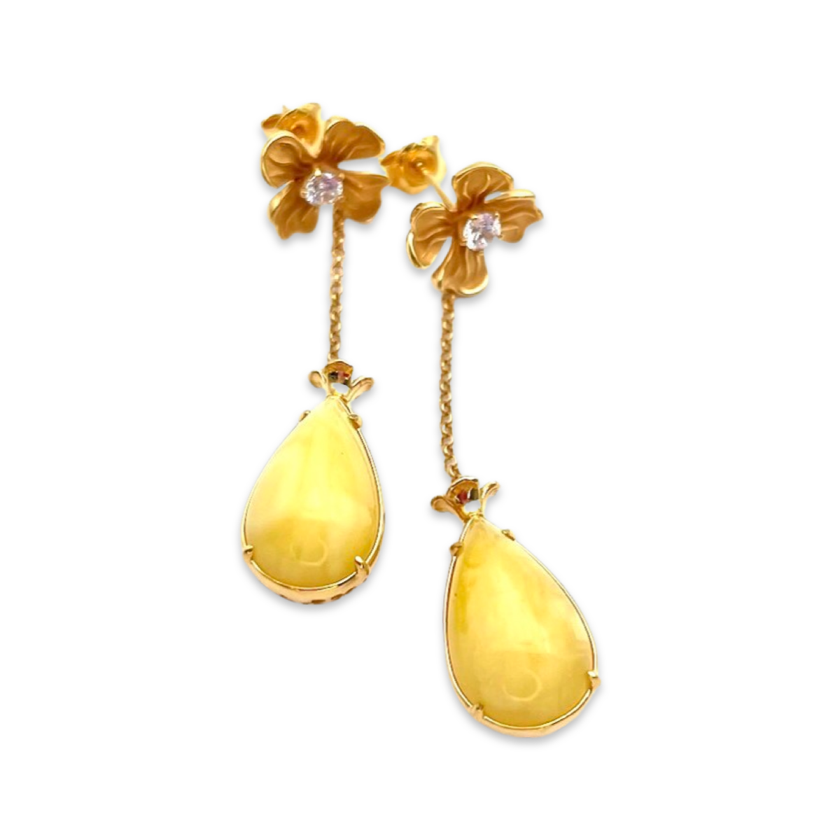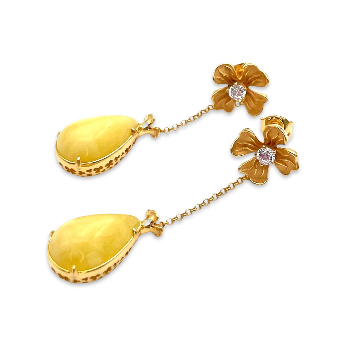 These elegant gold-plated stud earrings are the perfect accessory for any occasion. The earrings feature stunning amber stones that are expertly crafted to showcase their natural beauty and added by sparkling zircons that add a touch of glamour to the design.The gold-plated silver is of high quality and ensures that these earrings will last for years to come. The studs are comfortable to wear and feature secure backs that keep them in place throughout the day.The warm, golden tones of the metal complement the rich hues of the amber stones, making these earrings a versatile addition to any jewelry collection. Whether you're dressing up for a special occasion or adding a touch of elegance to your everyday look, these earrings are sure to impress.These gold-plated earrings with amber and zircons come in a beautiful presentation box, making them the perfect gift for a loved one. So why wait? Add them to your cart today and elevate your style to the next level!
