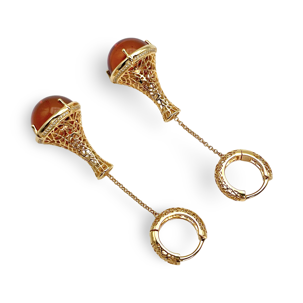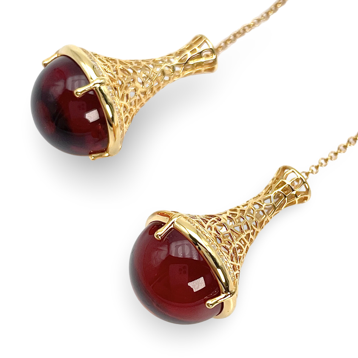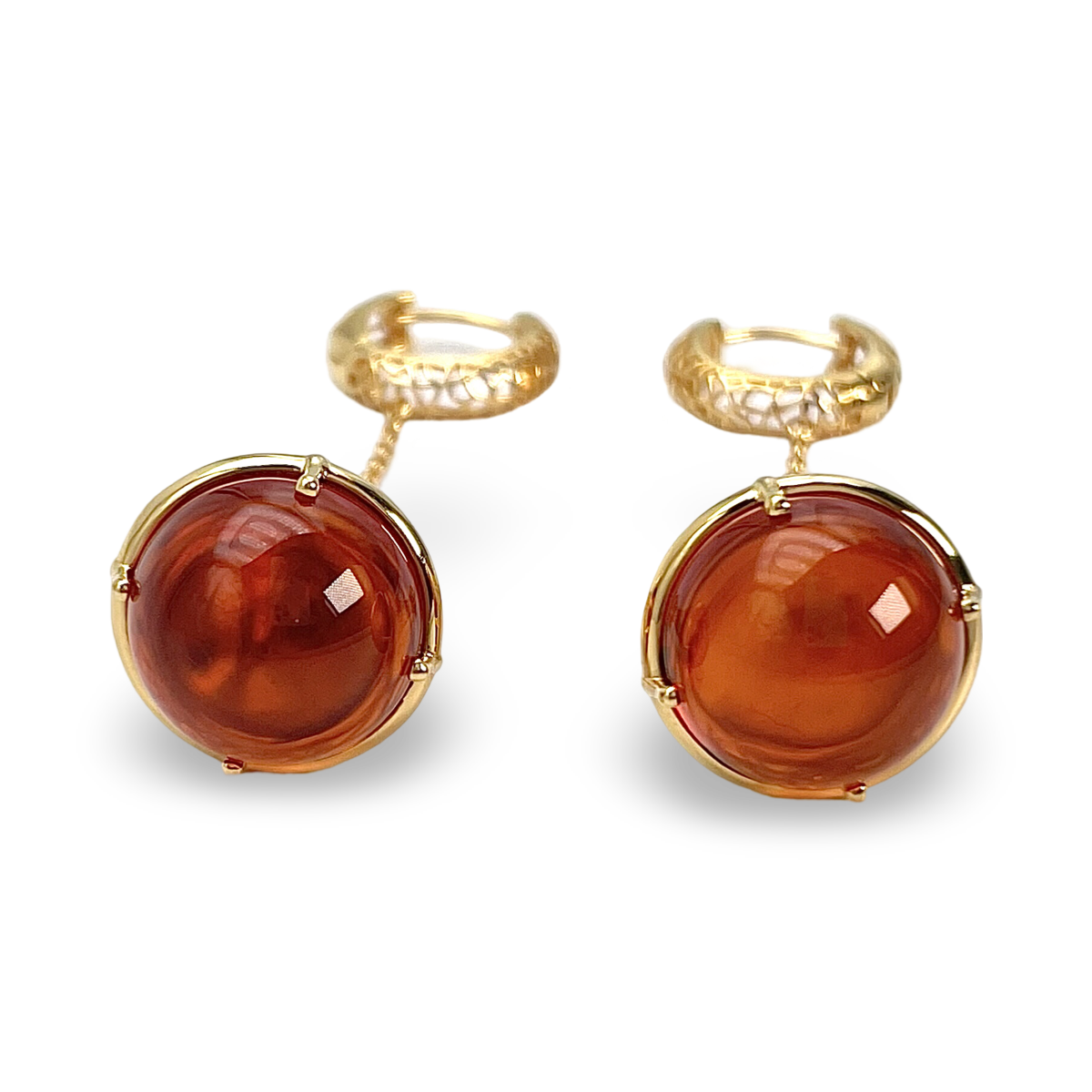 每只耳环的中心镶嵌着迷人的红色琥珀宝石,散发出温暖与魅力。琥珀宝石的深红色调为任何装扮增添大胆的色彩,使每次佩戴都成为引人注目的焦点。