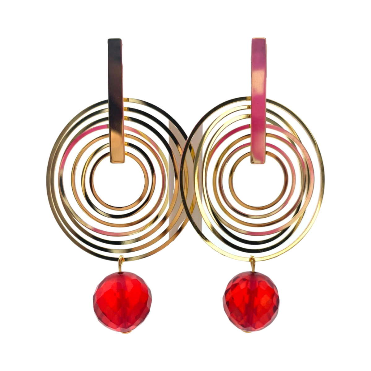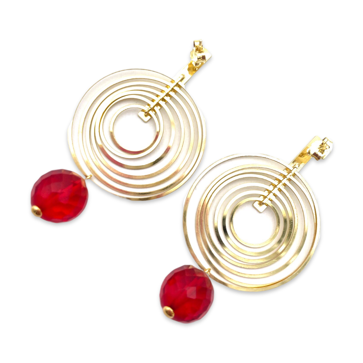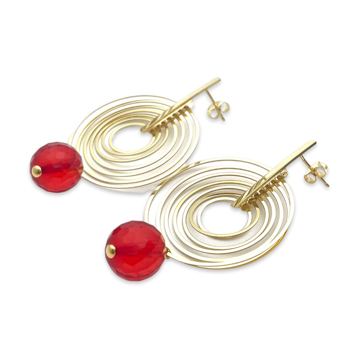 These gold-plated stud earrings feature red faceted amber balls that add a touch of elegance and sophistication to any outfit. Amber is a fossilized resin that has been prized for its natural beauty and durability for centuries. The red faceted balls used in these earrings catch the light beautifully and sparkle with every movement. The earrings are secured with a gold-plated post and back, which ensures they stay in place all day long. The gold plating 24k adds a touch of luxury to the earrings and complements the rich color of the amber. These earrings are perfect for both casual and formal occasions and can be worn with a variety of outfits. Whether you're dressing up for a night out or want to add a touch of glamour to your everyday look, these gold-plated amber earrings are a stunning choice.