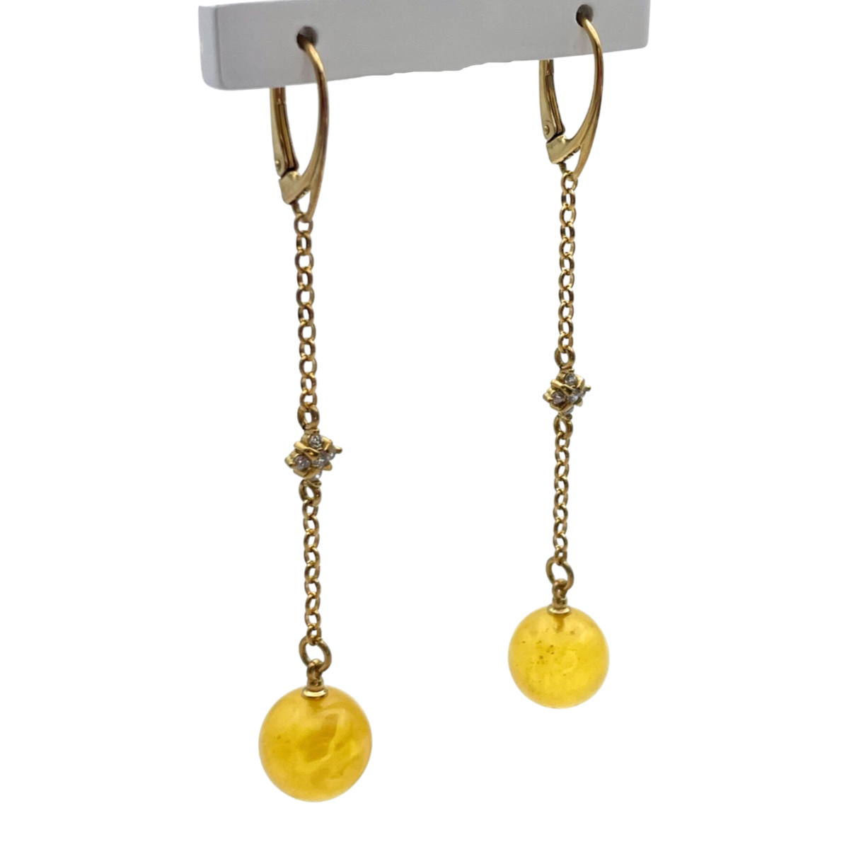 These gold-plated earrings are a stunning combination of classic elegance and modern design. The earrings feature sparkling zircons that are set in the gold-plated base, adding a touch of glamour and sophistication to the overall look.The earrings also feature chains with amber balls at the ends, which adds a unique and playful element to the design. The amber balls are smooth and polished, making them comfortable to wear and adding a natural touch to the overall aesthetic.The gold plating 24k on the earrings is of high quality, ensuring that the earrings will last for years to come. The overall design is versatile and can be worn with a variety of outfits, making these earrings a great addition to any jewelry collection.These gold-plated earrings with zircons and amber balls are perfect for anyone who appreciates jewelry that is both elegant and unique. They are also a great gift for someone special, as they are sure to impress and delight.