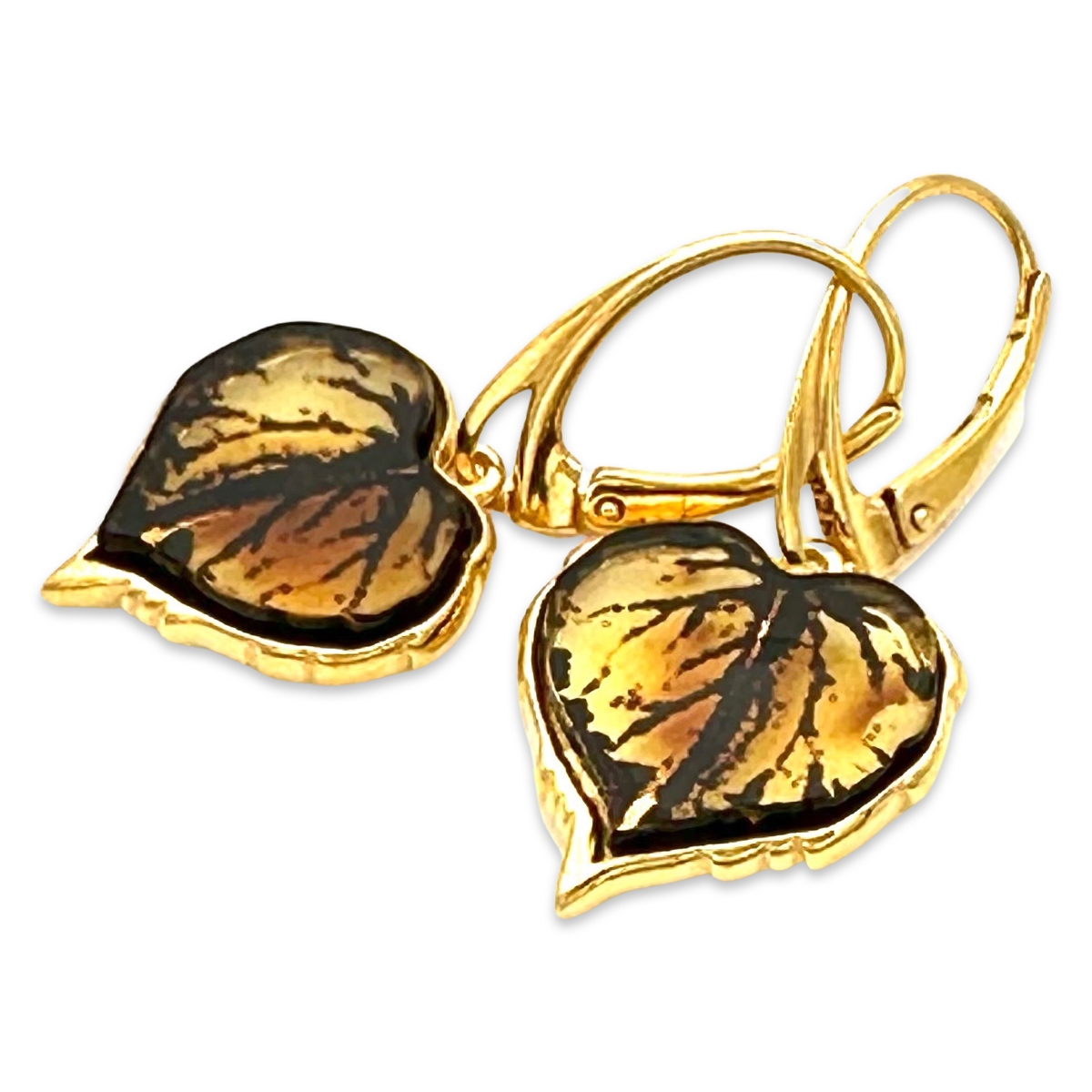 These gold-plated leaf-shaped earrings are a beautiful and unique addition to any jewelry collection. The intricate leaf design is elegant and stylish, with a stunning amber stone that adds a pop of color and sparkle.The earrings are made from high-quality materials, including a durable gold-plated 24k base and a secure Italian clasp that ensures the earrings stay in place all day long. The amber stone is carefully crafted to showcase its natural beauty, and the leaf design adds a touch of nature-inspired charm to any outfit.These earrings are versatile enough to wear with a variety of different styles and outfits, whether you're dressing up for a special occasion or adding a touch of glam to your everyday look. They are lightweight and comfortable to wear, making them an ideal choice for all-day wear.If you're looking for a beautiful and unique pair of earrings to add to your jewelry collection, these gold-plated leaf-shaped earrings with amber are the perfect choice. They're sure to become a staple in your wardrobe for years to come.