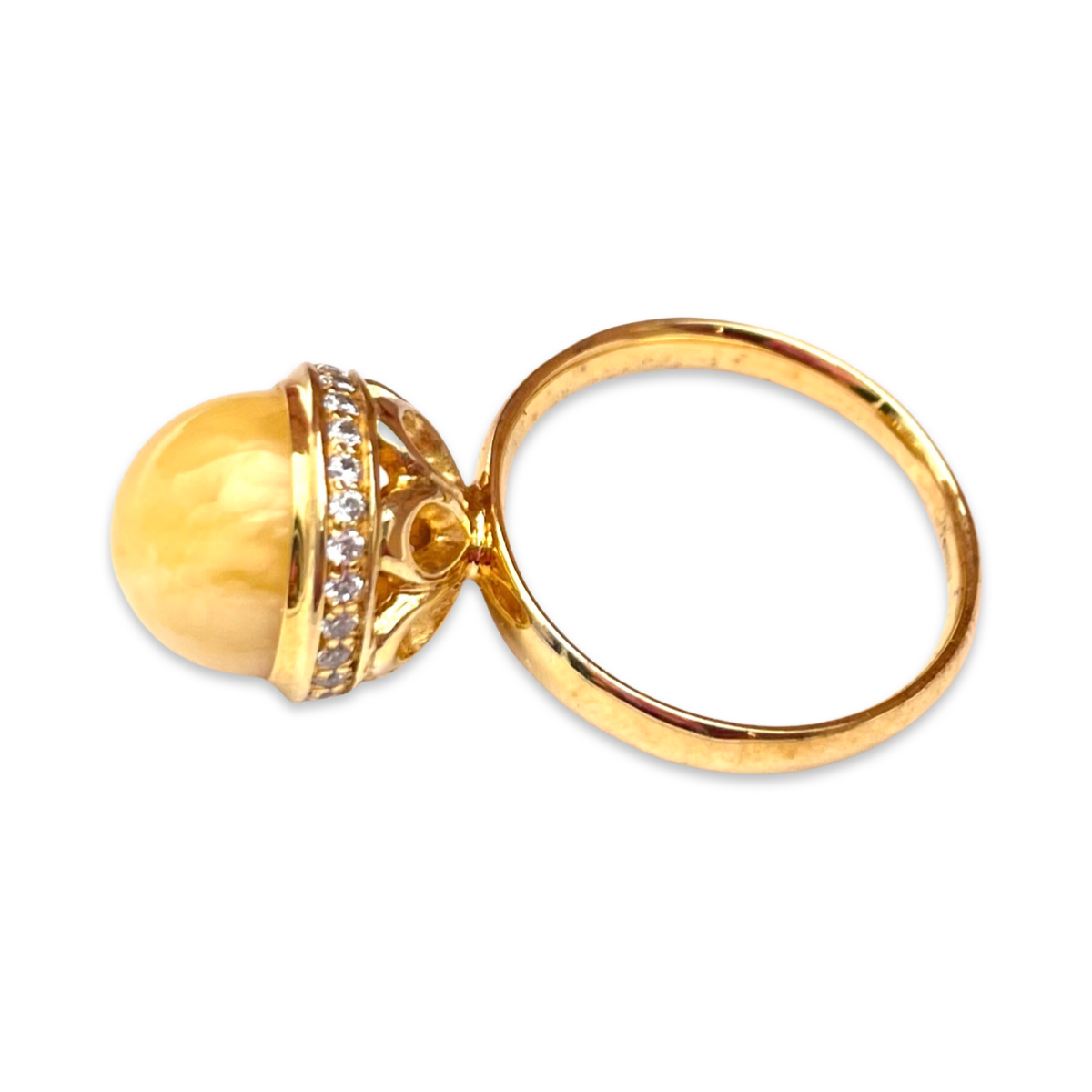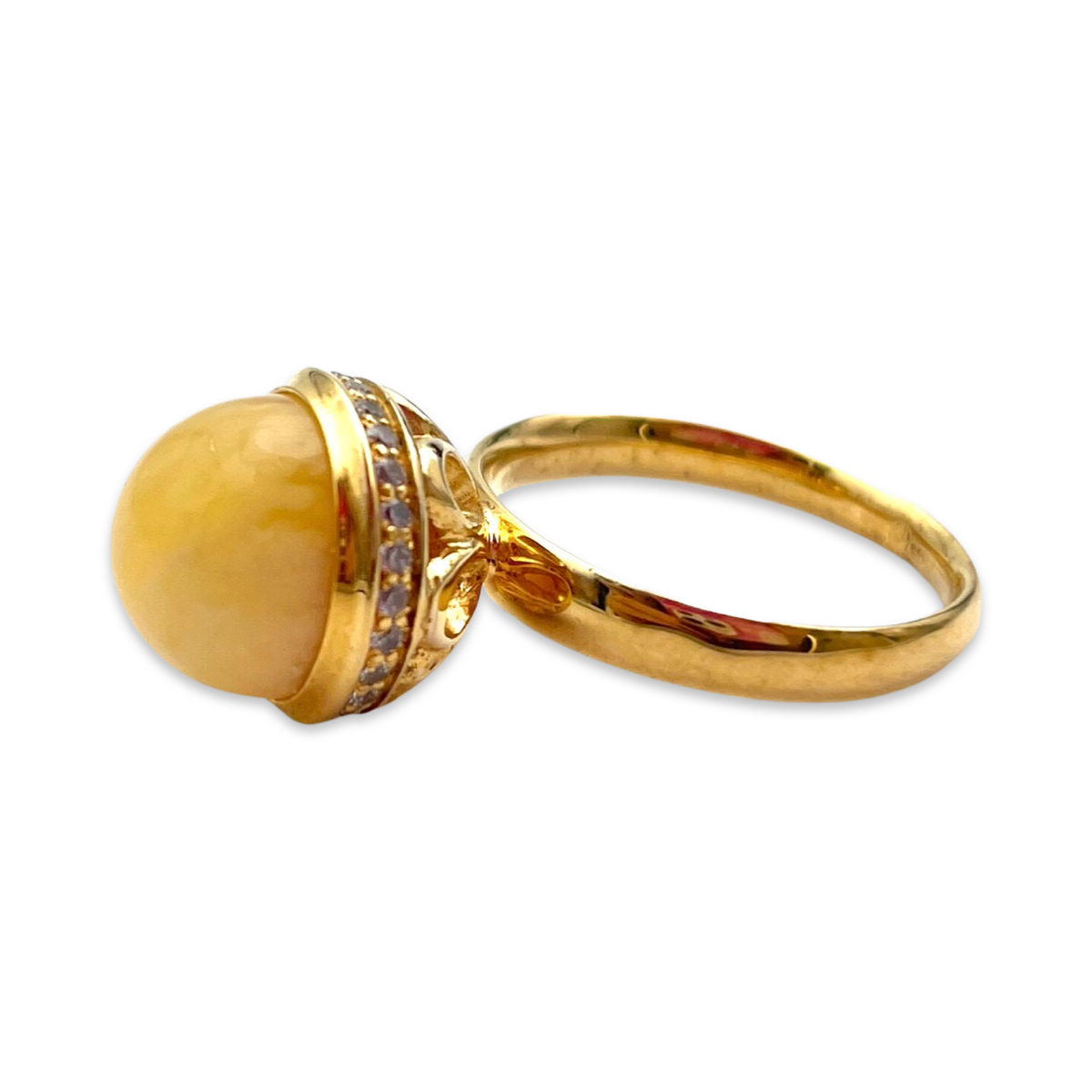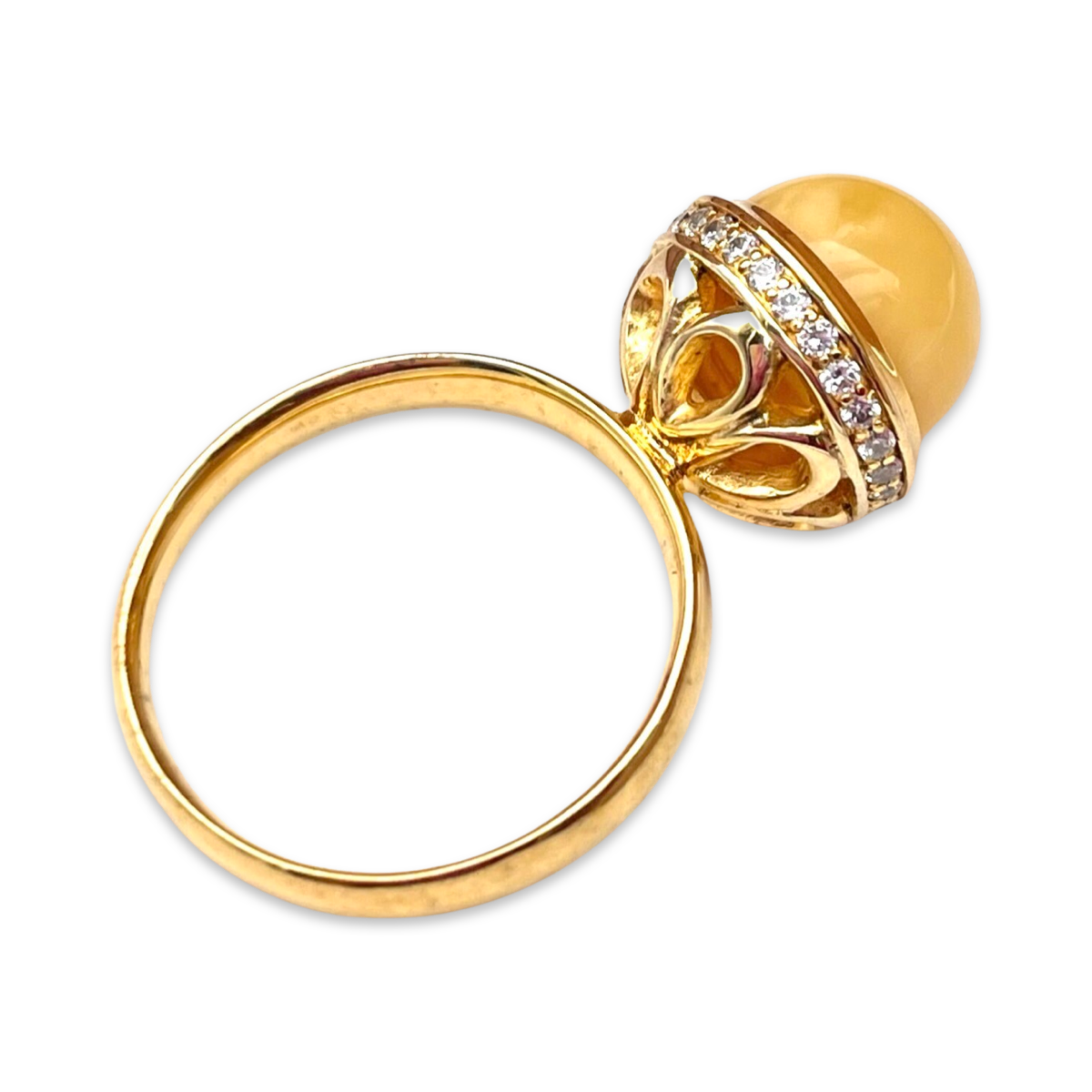 This gold-plated ring features a beautiful yellow amber stone at its center, which is accented by sparkling zircon stones. The amber stone has a smooth, polished surface that reflects light and highlights the stone's warm, golden hues. The zircon stones add an elegant touch and enhance the overall design of the piece. The ring is crafted with high-quality materials and has a polished finish that adds to its luxurious look. The gold plating 24k provides an elegant touch and helps to prevent the ring from tarnishing over time. This piece is perfect for adding a touch of sophistication to any outfit and is sure to be a treasured addition to any jewelry collection.