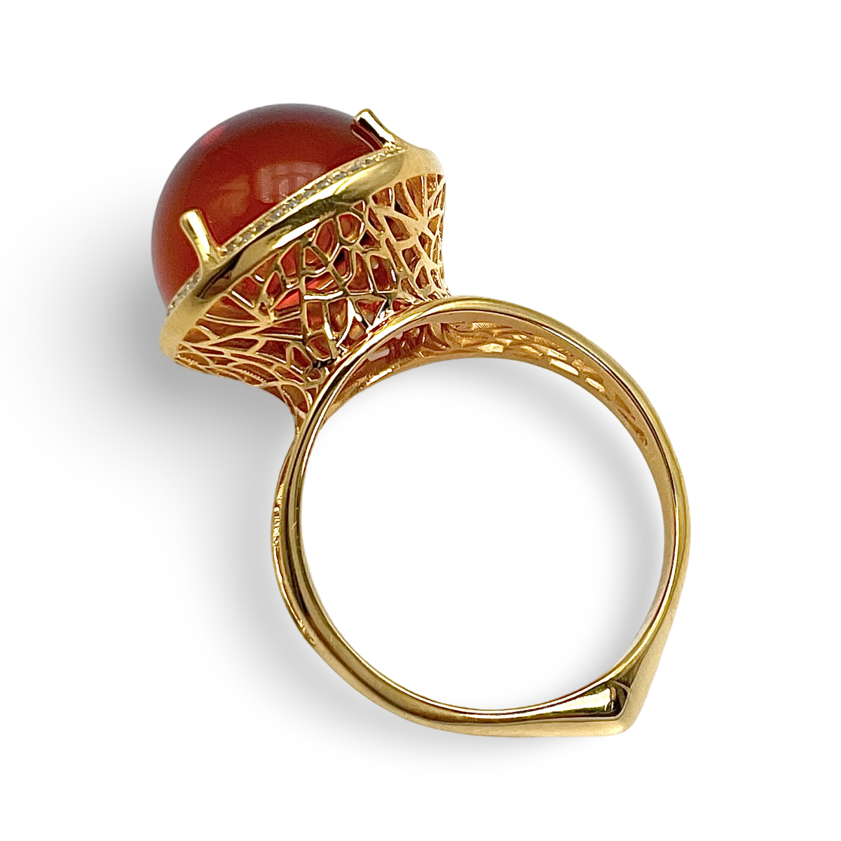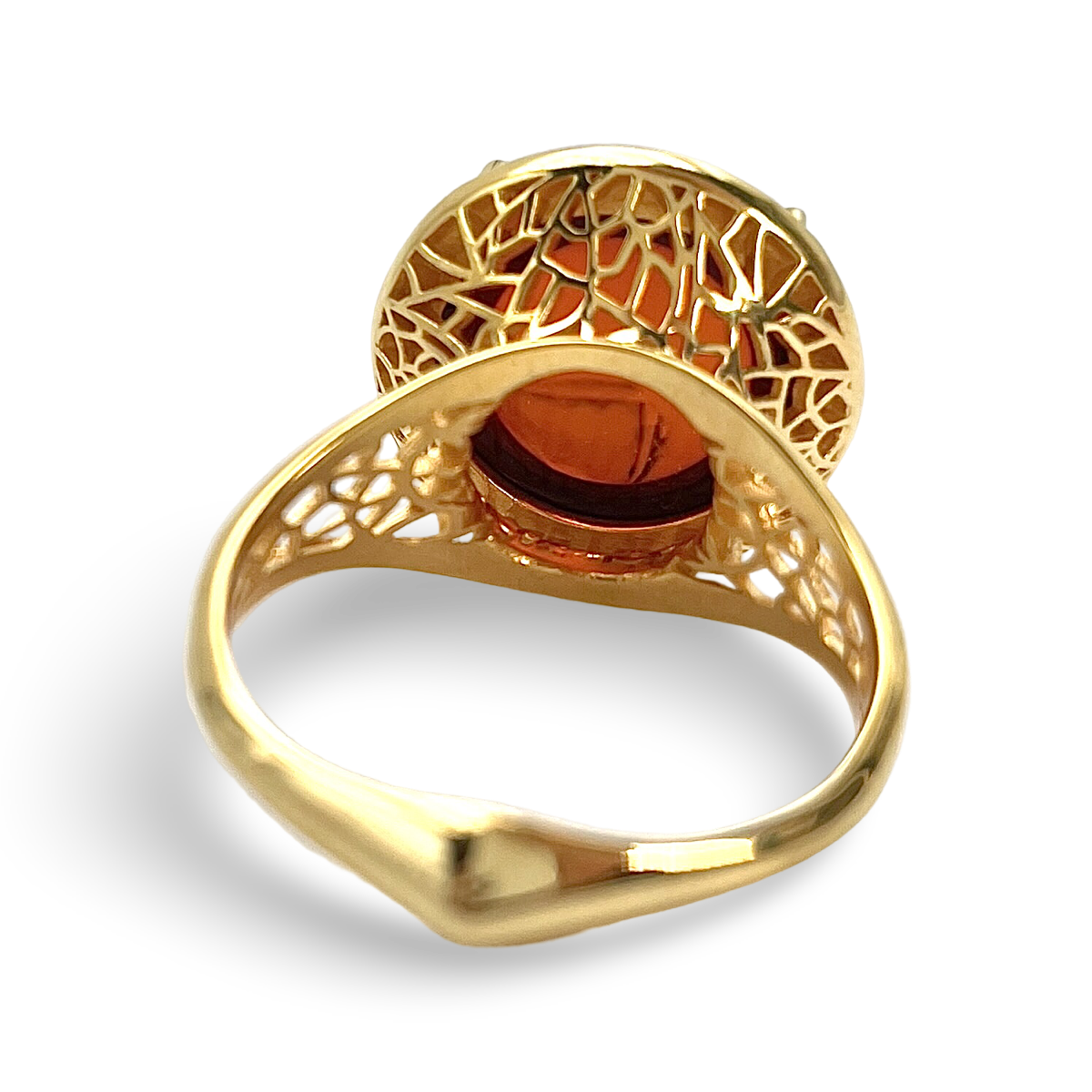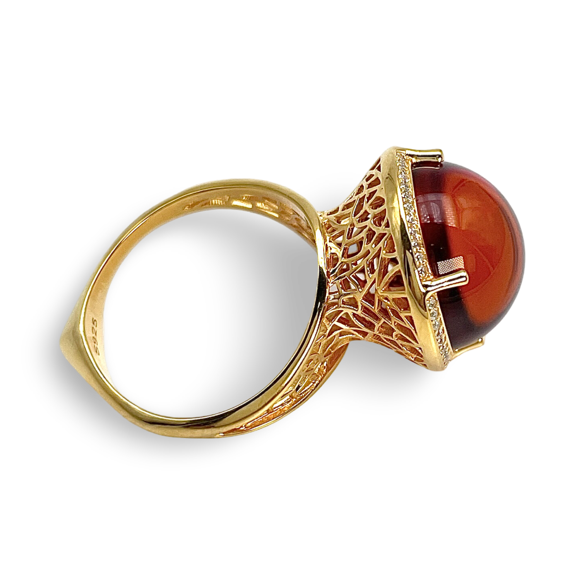 沉醉于优雅之中,佩戴我们精美的镀金银925戒指,饰以迷人的红色琥珀。此戒指经过精心打造,完美结合了奢华材质与永恒设计。