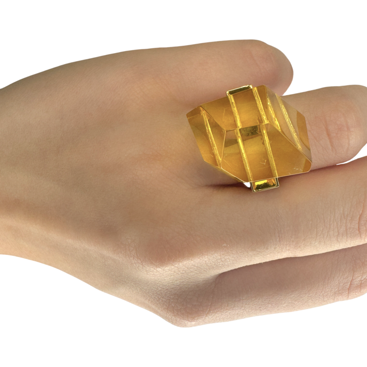 一款优雅的戒指,采用天然琥珀镶嵌在精致的镀金细节中。琥珀的温暖光芒和简洁的轮廓营造出永恒而精致的风格。富有表现力却不张扬——适合日常佩戴或特殊场合。