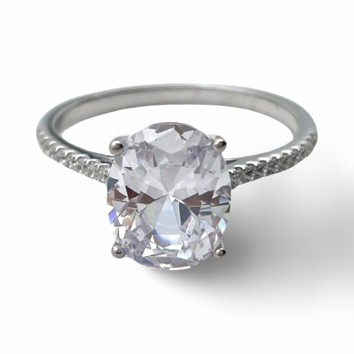 这款精美的戒指采用高品质银制成,因其耐用性和光泽而闻名。戒指中央镶嵌着一颗璀璨的椭圆切割白色锆石,因其能够散发出光辉与精致感而被精选。