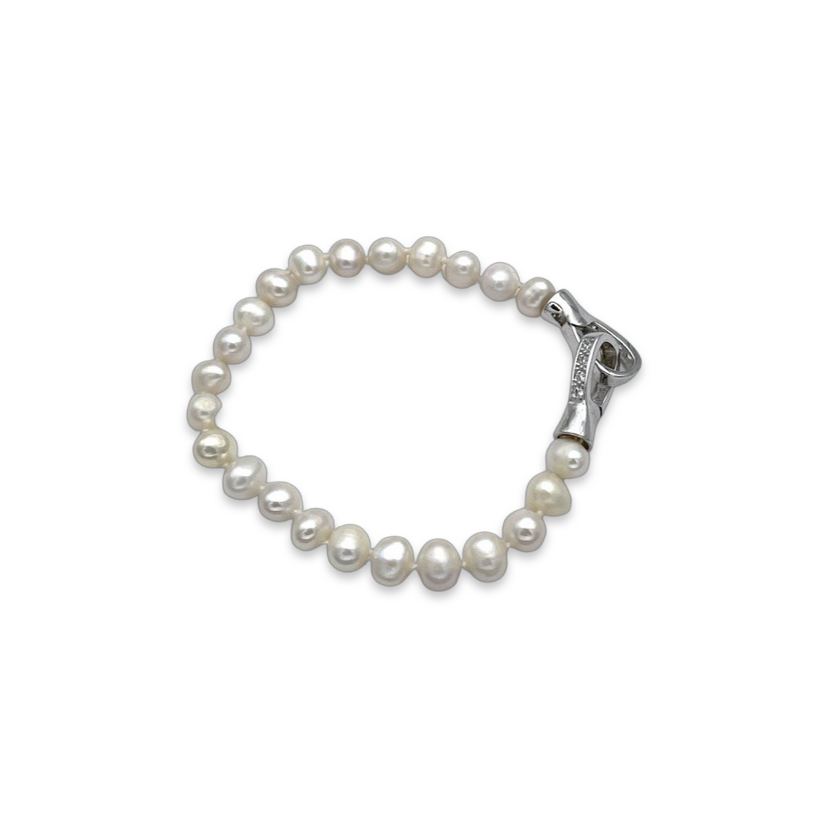 这款银质珍珠手链是一件永不过时的经典珠宝。手链上镶嵌着精心挑选的美丽光泽珍珠。