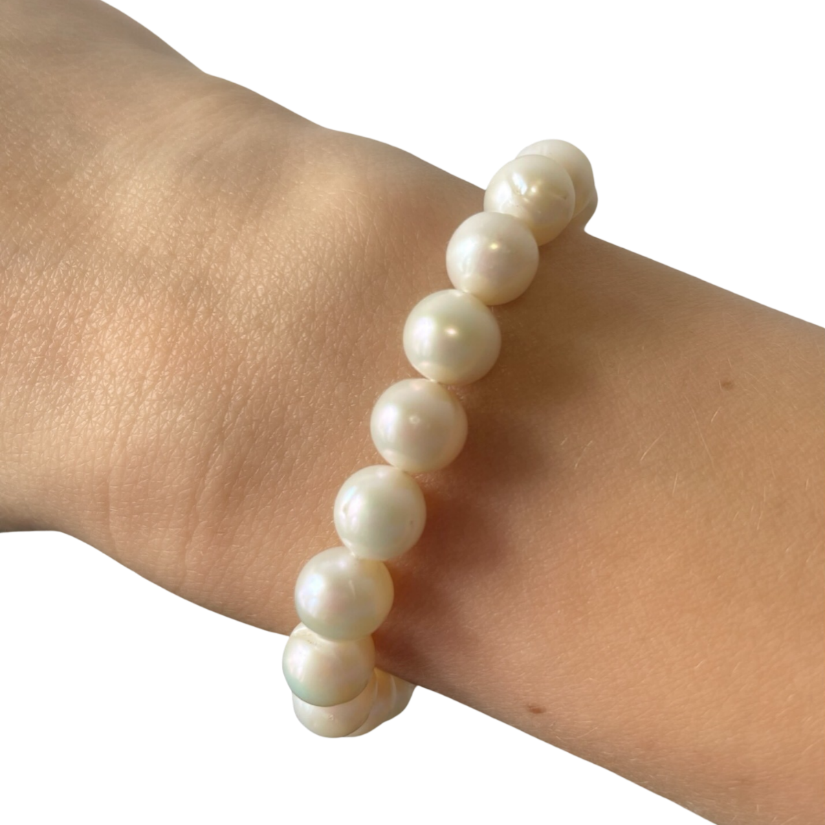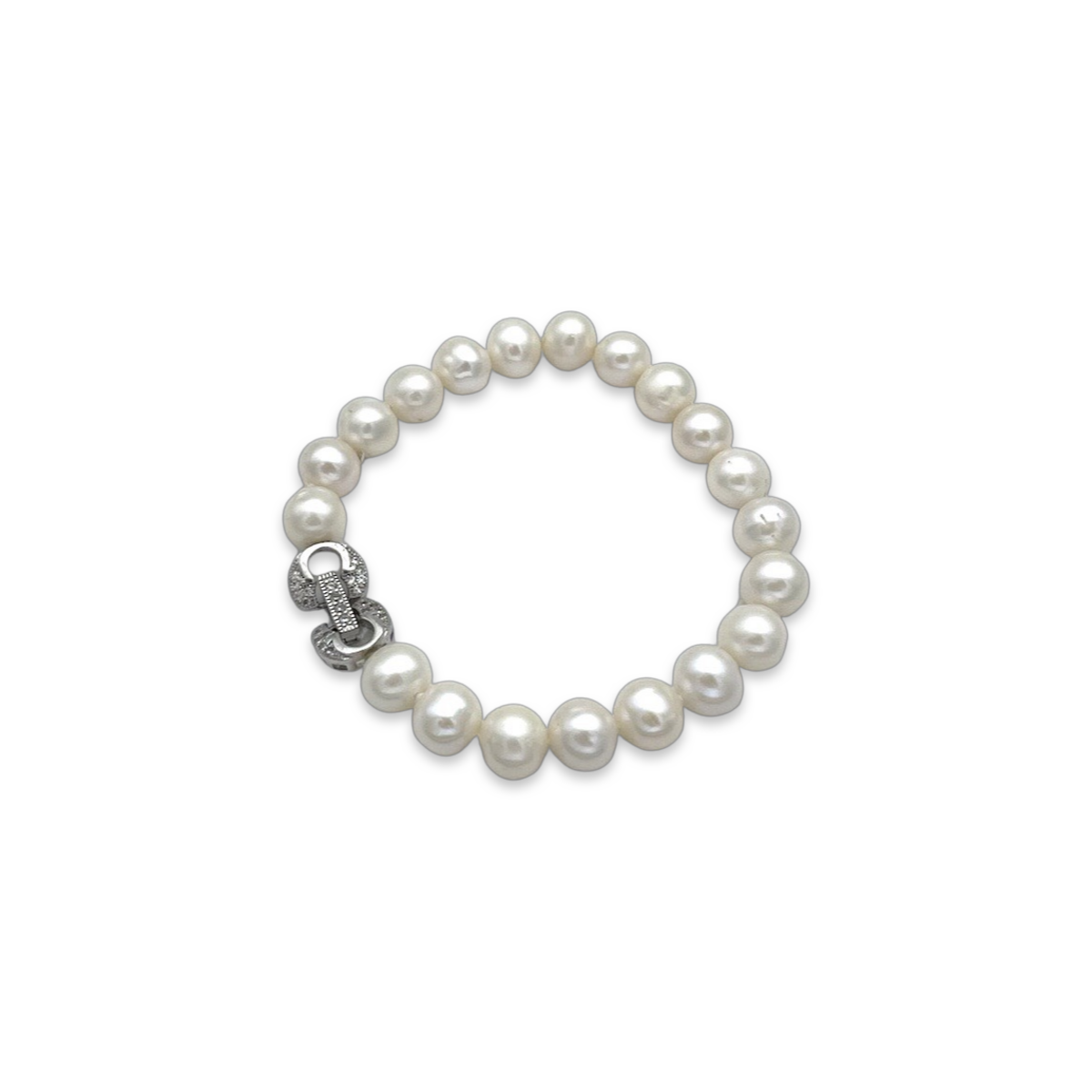 手链上的珍珠经过精心挑选,表面光滑且光泽丰富,确保每颗珍珠在任何光线下都能闪耀夺目。银质扣环为设计增添了一丝现代感,使其成为一款既适合正式场合又适合休闲装扮的多功能配饰。