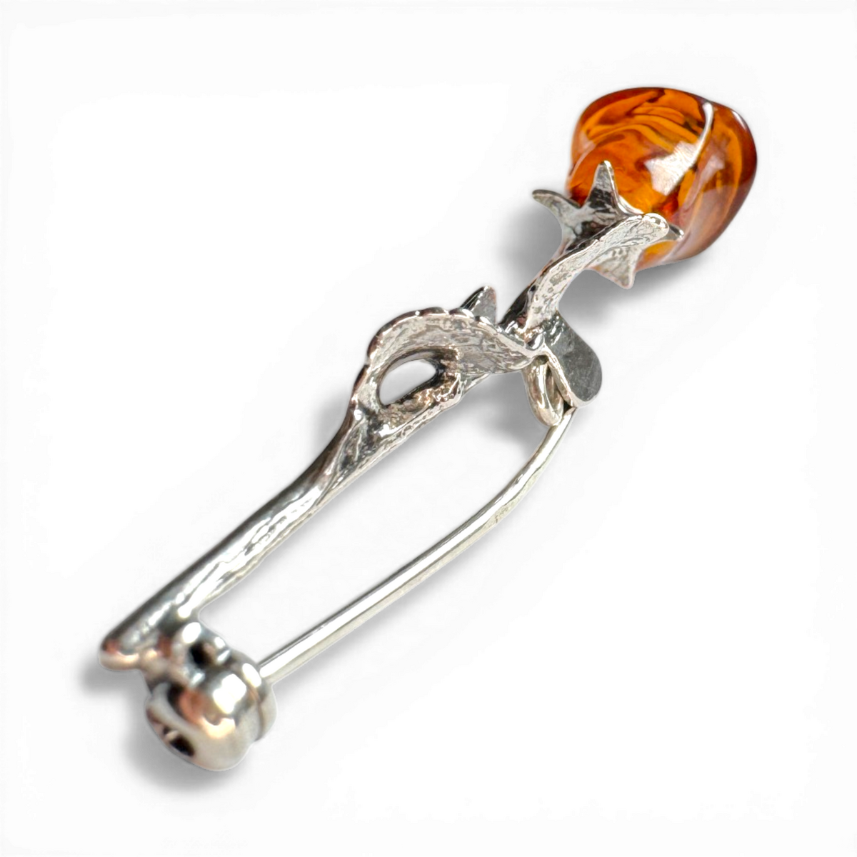 This Silver Brooch with Cognac Amber Rose combines timeless elegance with unique craftsmanship. The centerpiece features a beautifully detailed amber rose in a rich cognac hue, set in a polished silver frame for a sophisticated finish. Its versatile design makes it suitable for various occasions, whether accessorizing formal attire or adding a refined touch to casual outfits. A perfect blend of style and quality, this brooch is a distinctive addition to any jewelry collection.