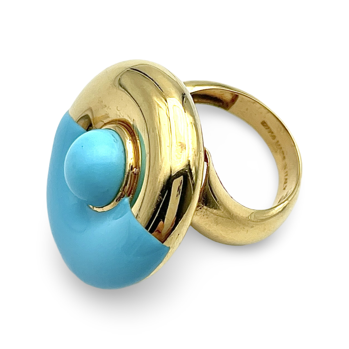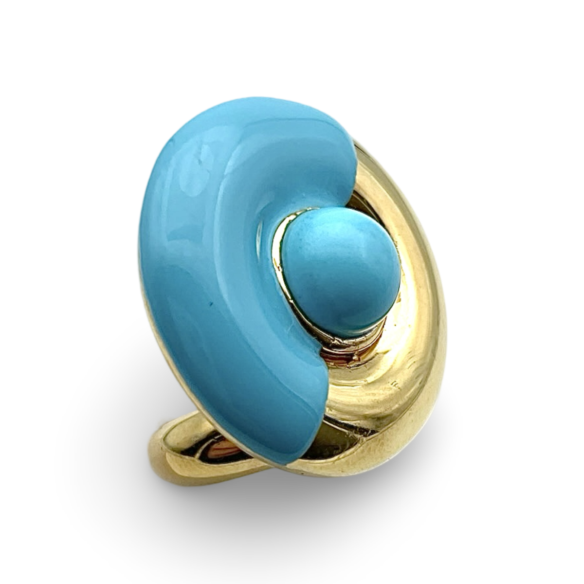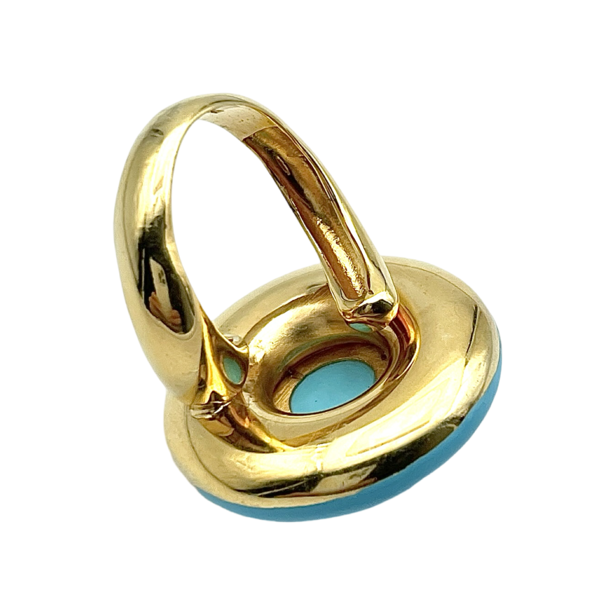 这款由绿松石和优质镀金银制成的戒指是一件引人注目且优雅的珠宝。戒指镶嵌着一颗精美抛光的绿松石,以其宁静的蓝色调著称,戒托采用高品质镀金纯银制成。鲜艳的绿松石与奢华的镀金之间形成鲜明对比,营造出大胆且精致的外观。无论是日常佩戴还是特殊场合,这款戒指都能为任何服装增添一抹自然之美和永恒的优雅,是喜爱独特且高端珠宝人士的必备之选。