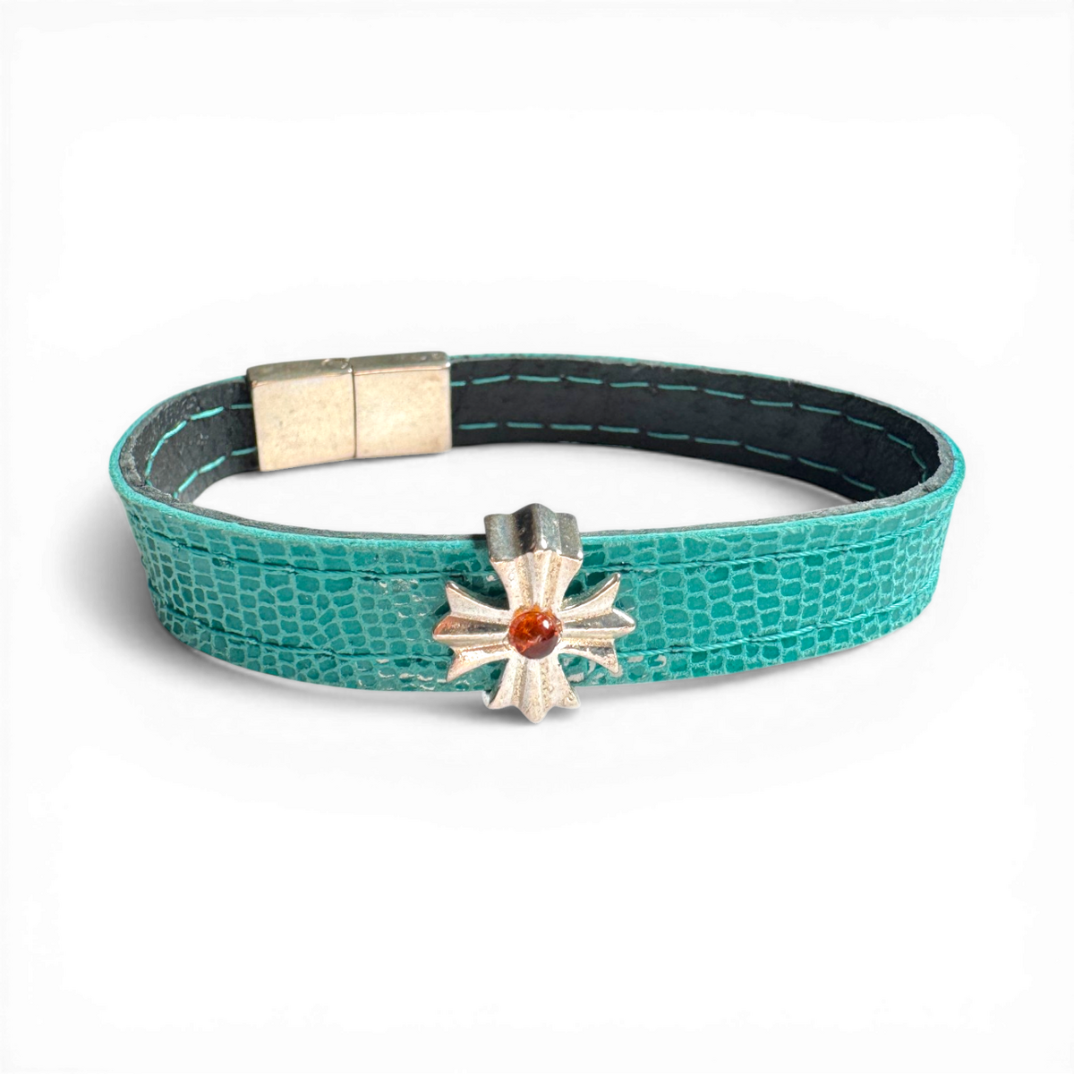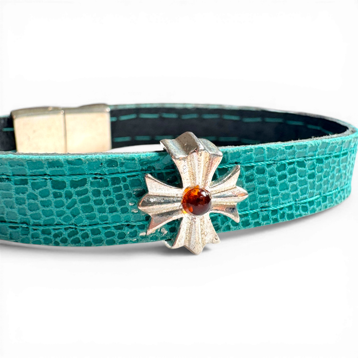 Fresh, vibrant, unforgettable. The turquoise leather paired with warm amber creates a striking contrast. Wear it to brighten your look and express your creative side.