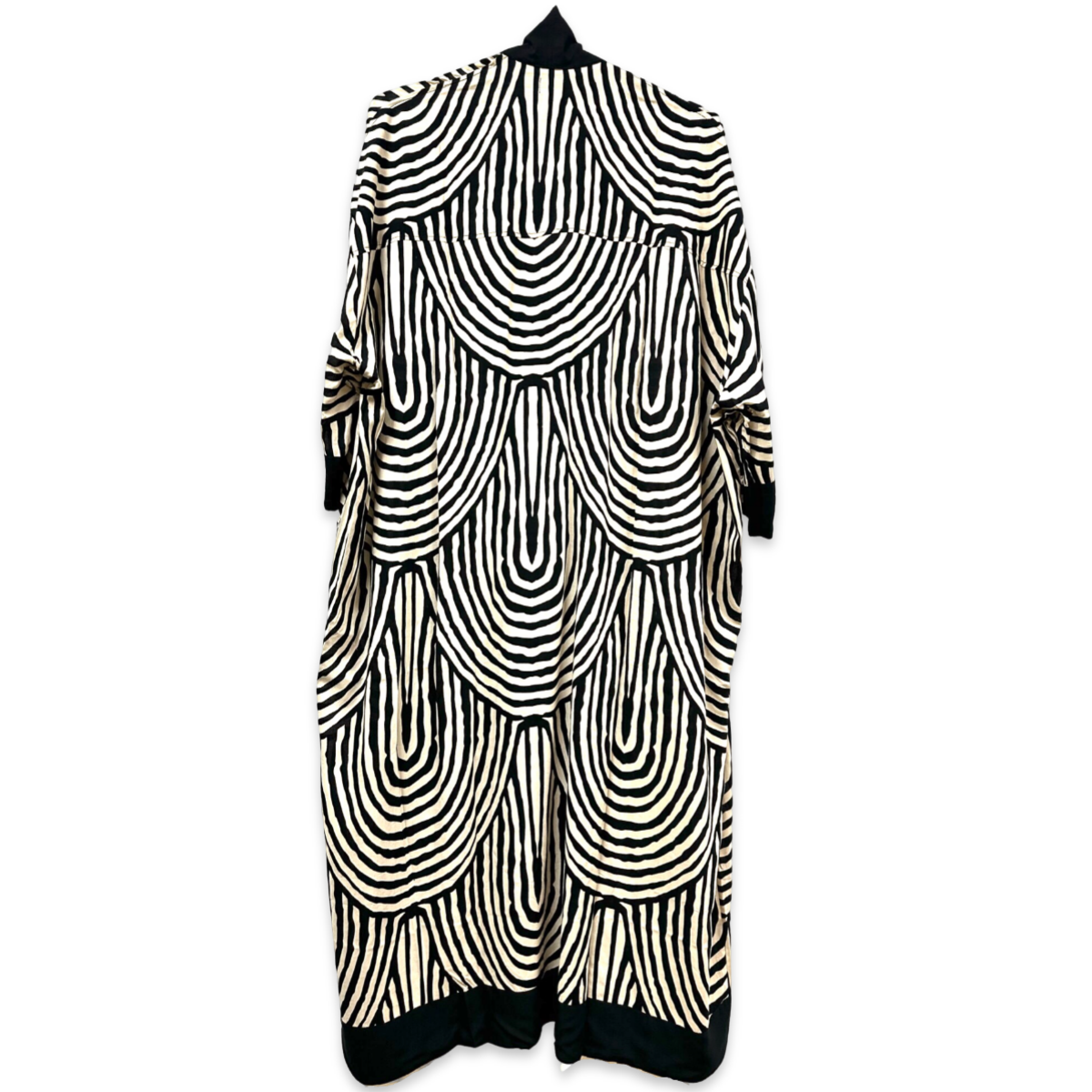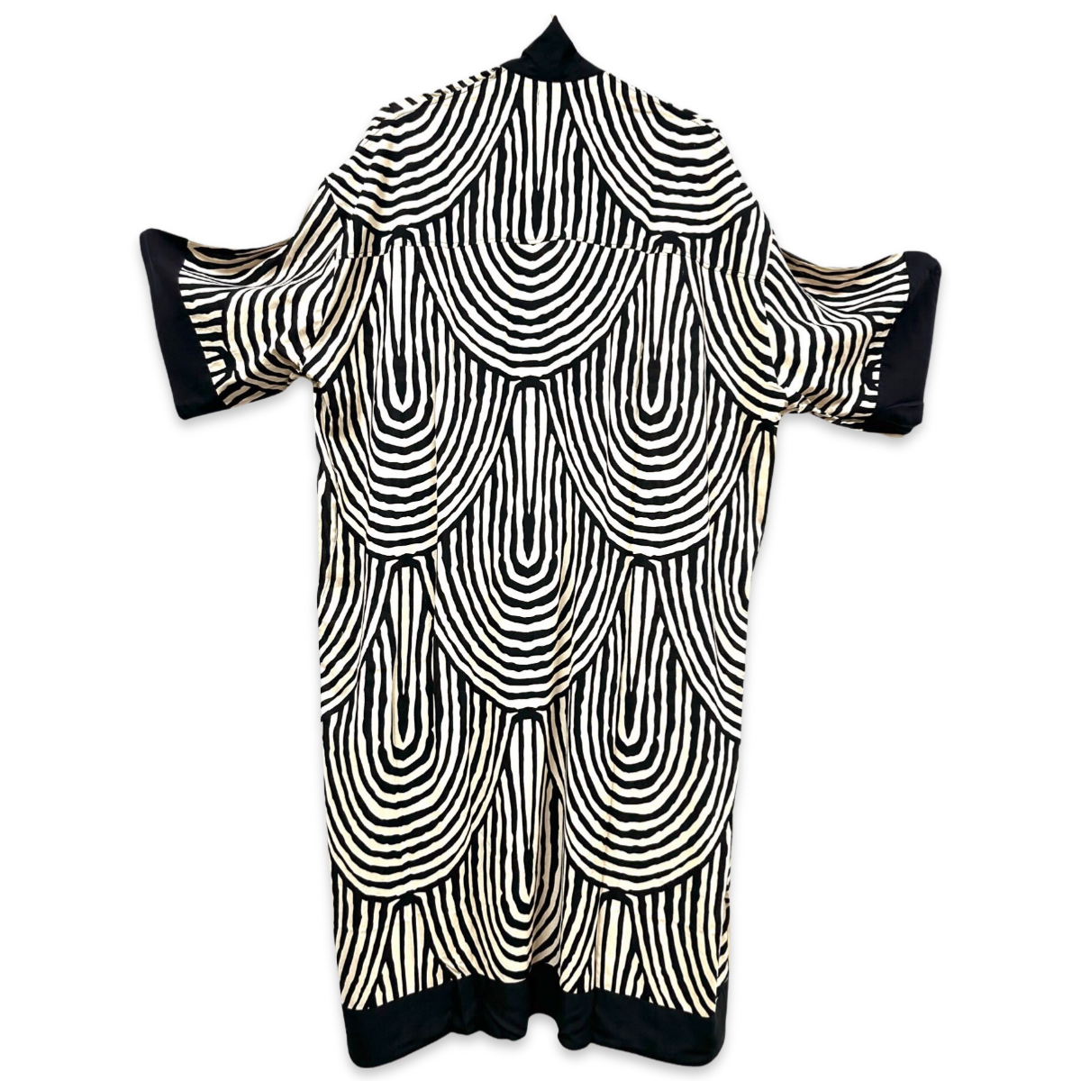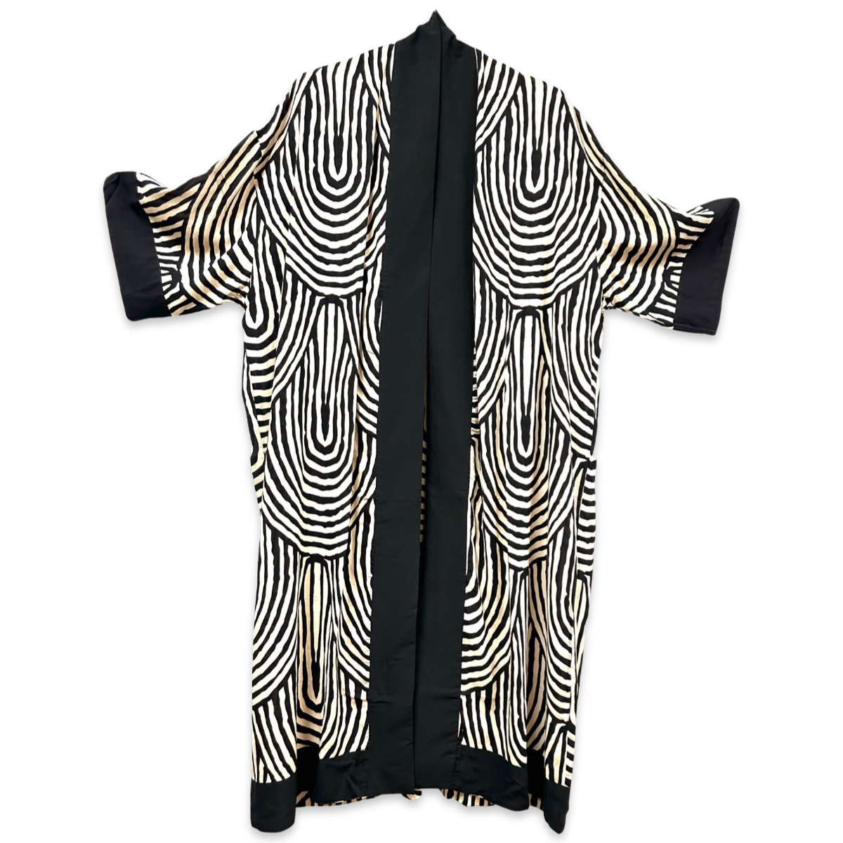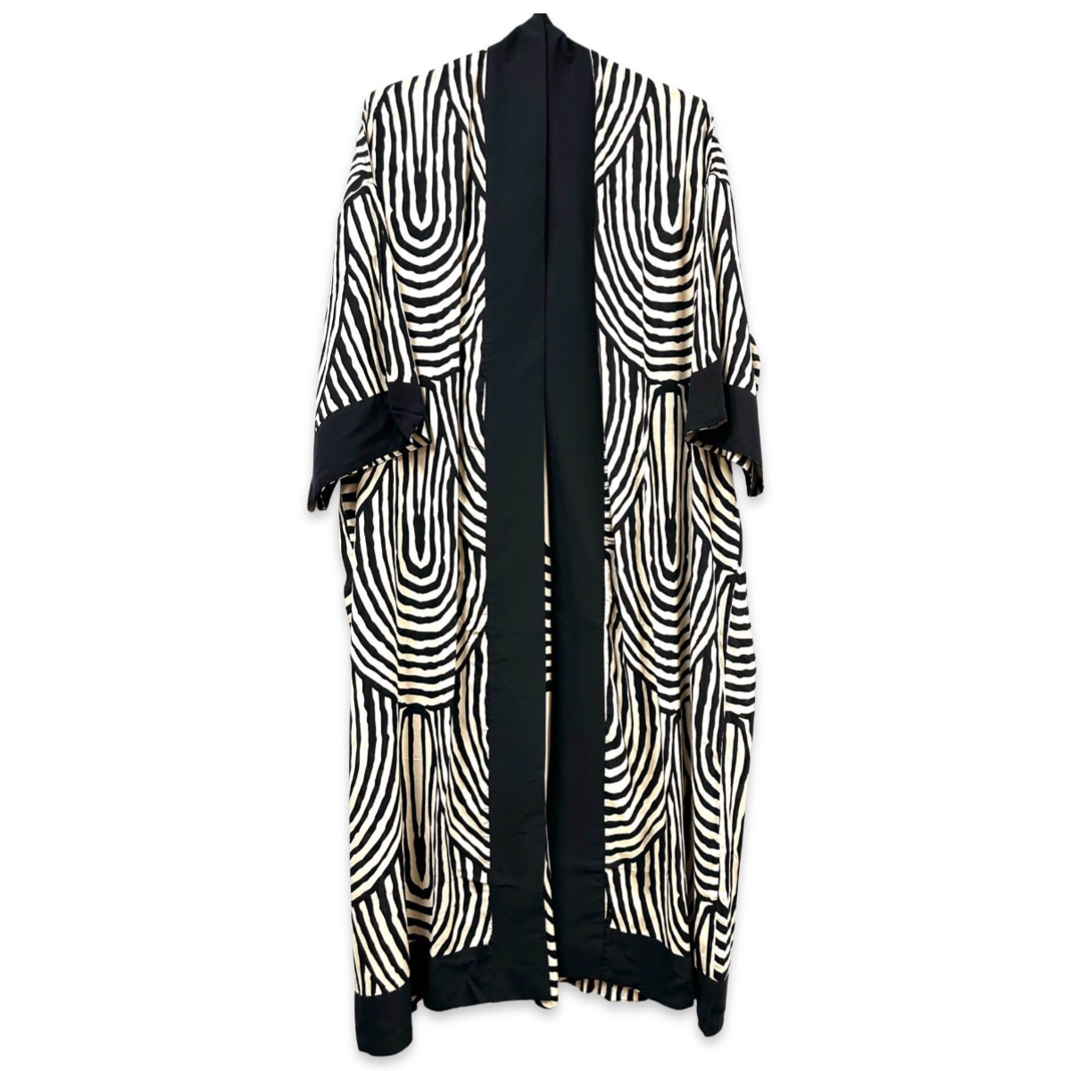 Ein Kimono ist ein traditionelles japanisches Kleidungsstück, das für sein anmutiges und elegantes Design bekannt ist. Er wird aus feinen Stoffen gefertigt und ist mit komplizierten Mustern und lebendigen Farben verziert. Der Kimono zeichnet sich durch seine T-förmige, gerade geschnittene Silhouette und breite, fließende Ärmel aus.