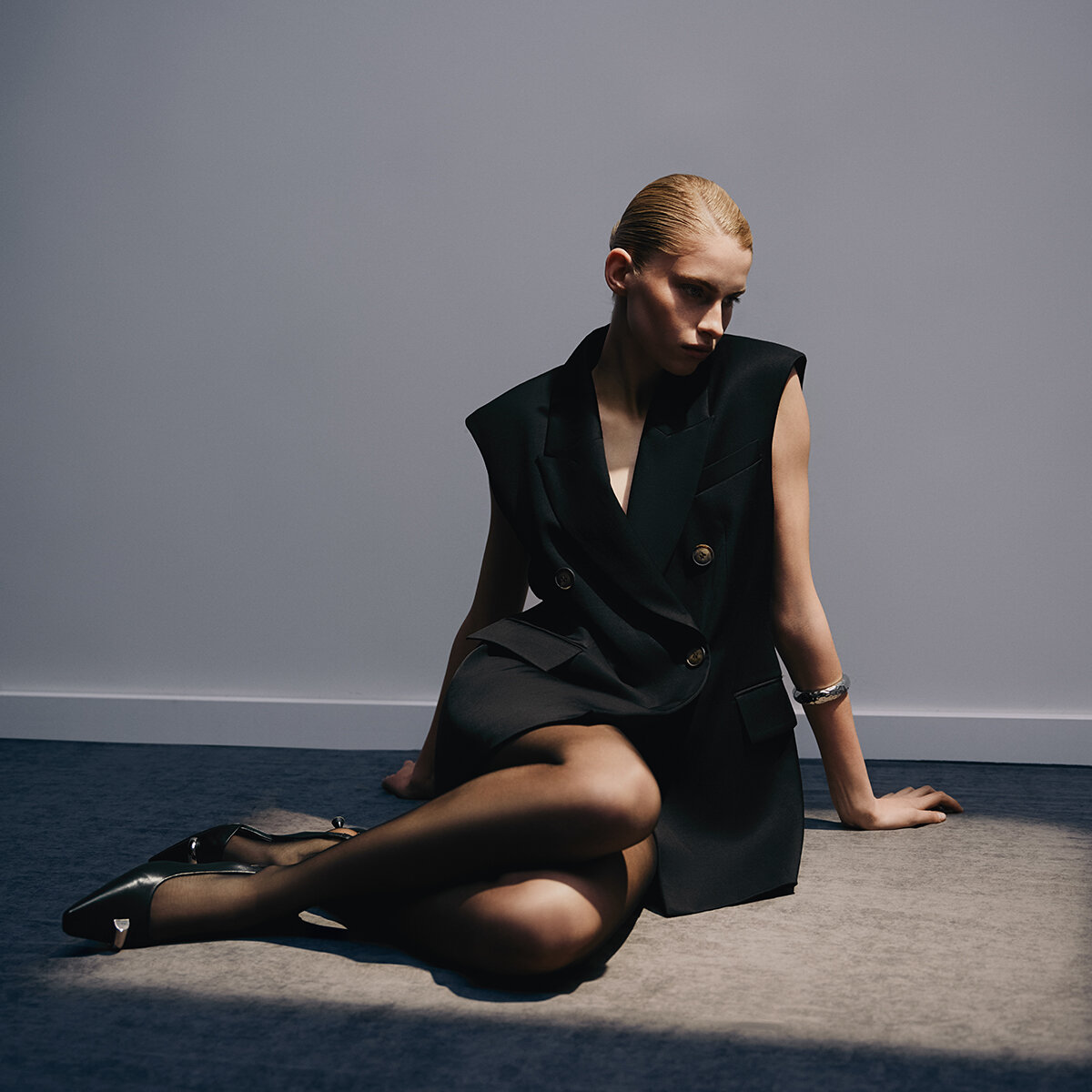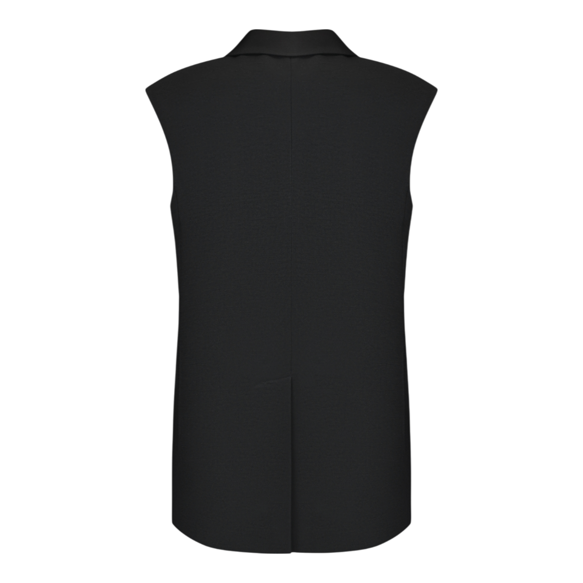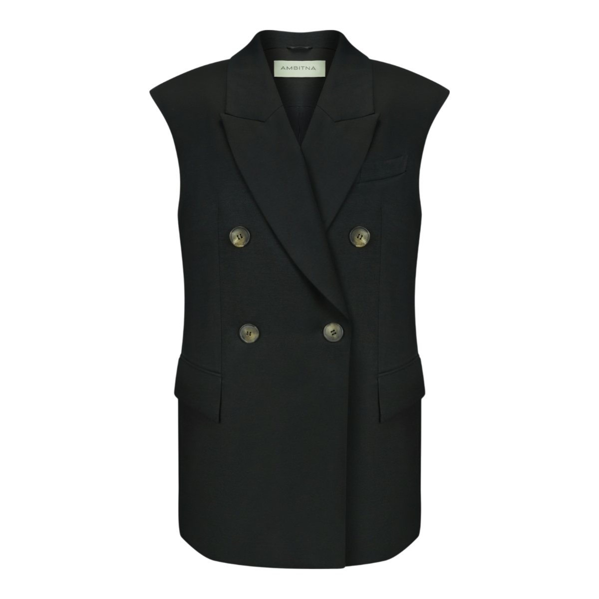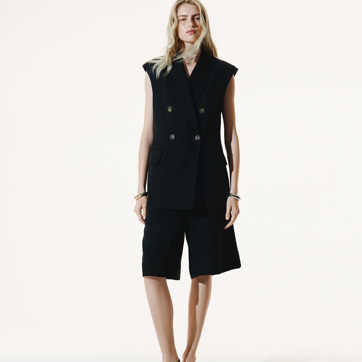 Diese verlängerte Weste ist eine raffinierte Mischung aus Leinen und Viskose, die Atmungsaktivität und Bewegungsfreiheit bietet und gleichzeitig eine scharfe, strukturierte Silhouette bewahrt. Es ist Power-Dressing neu interpretiert — fließend, modern und frei von Starrheit.