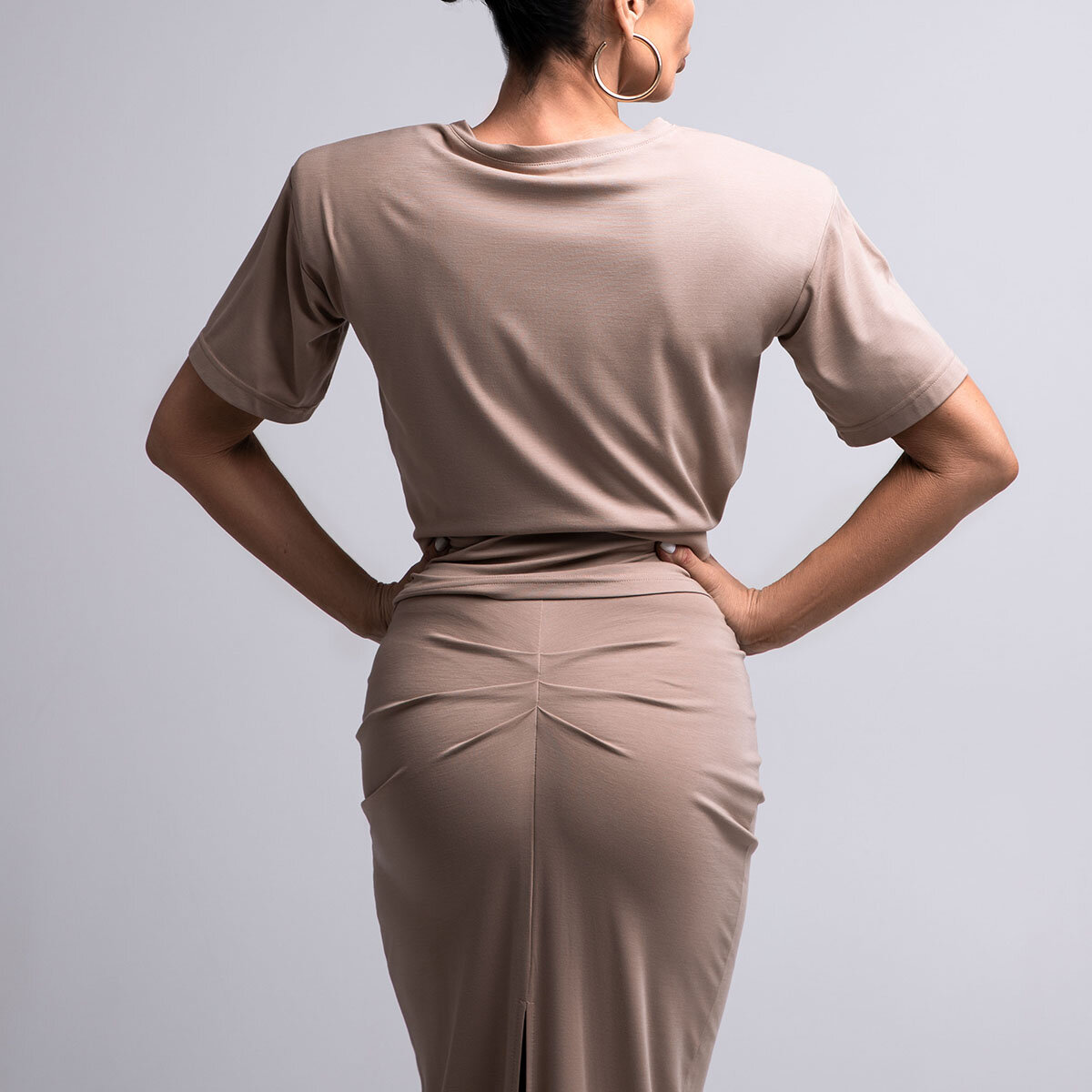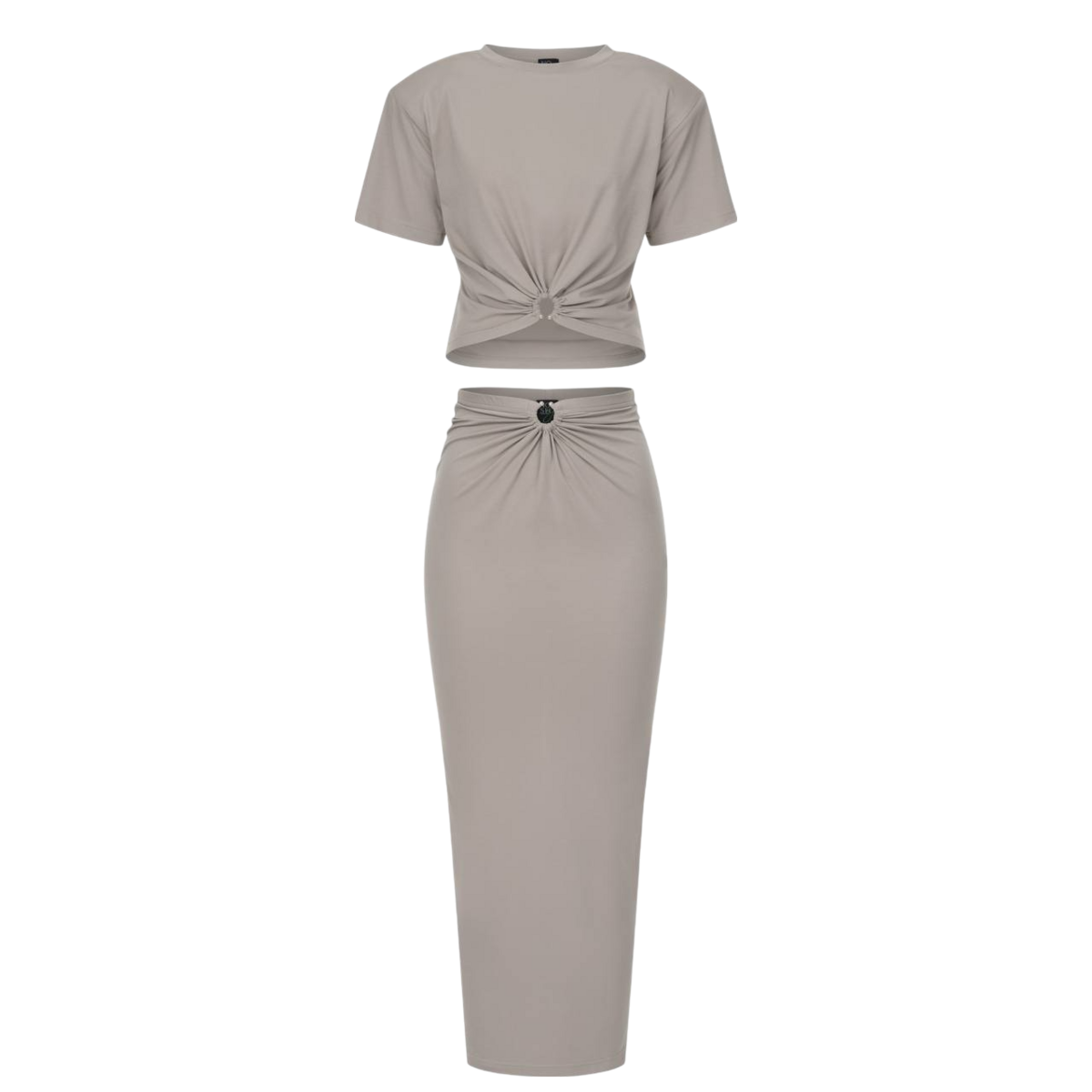 Ein schlanker und moderner Look, dieses minimalistische zweiteilige Set besteht aus einem geknoteten Crop-Top und einem hoch taillierten Midirock. Für Komfort und mühelosen Stil entworfen, ist es perfekt für sowohl legere als auch gehobene Anlässe.