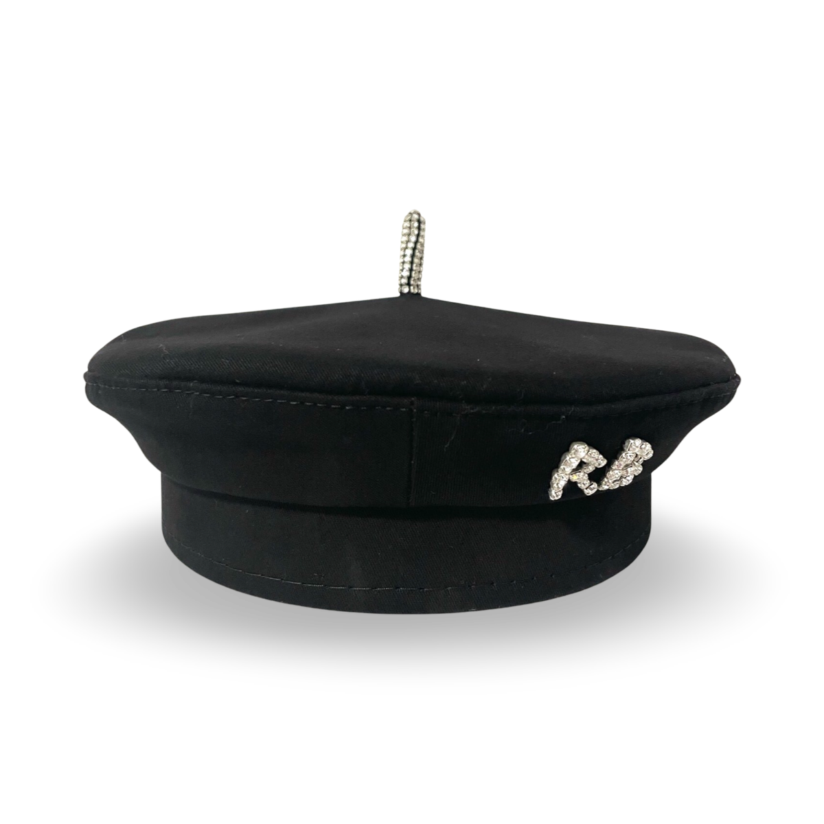 Das hervorstechende Merkmal dieses Baretts sind die funkelnden Kristallverzierungen, die strategisch platziert sind, um einen Hauch von Glanz und Faszination hinzuzufügen. Ruslan Baginskiys Liebe zum Detail zeigt sich in jedem Aspekt, da jeder Kristall zart eingesetzt ist und einen faszinierenden Effekt erzeugt, der das Licht bei jeder Bewegung einfängt.