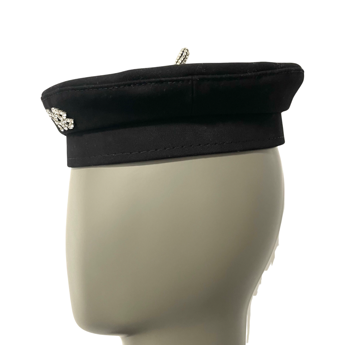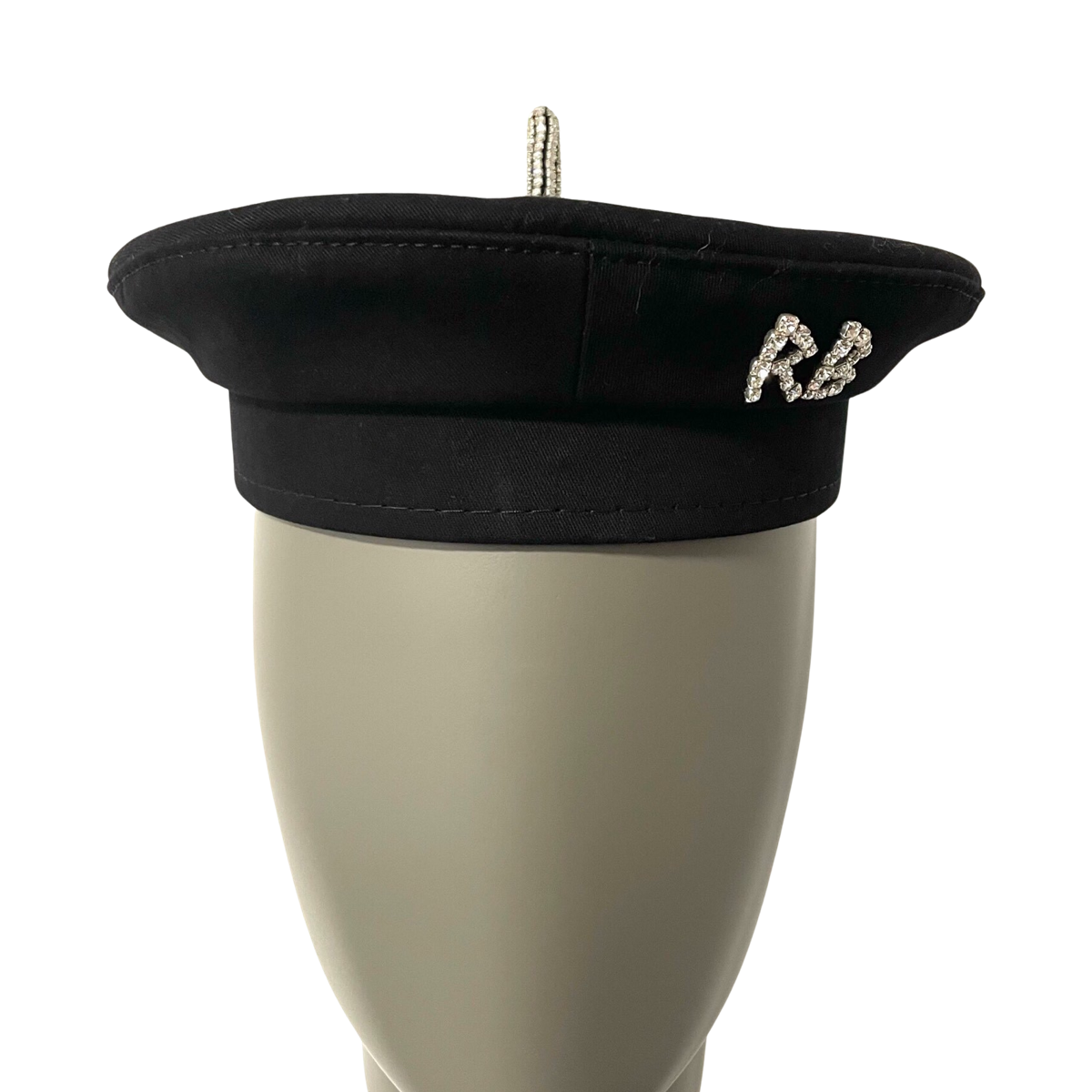 Machen Sie einen unvergesslichen Auftritt mit dem mit Kristallen verzierten schwarzen Baumwoll-Beret von Ruslan Baginskiy, wo Luxus und zeitgenössischer Stil zu einem wirklich außergewöhnlichen Accessoire verschmelzen.