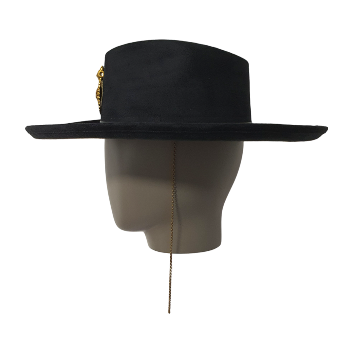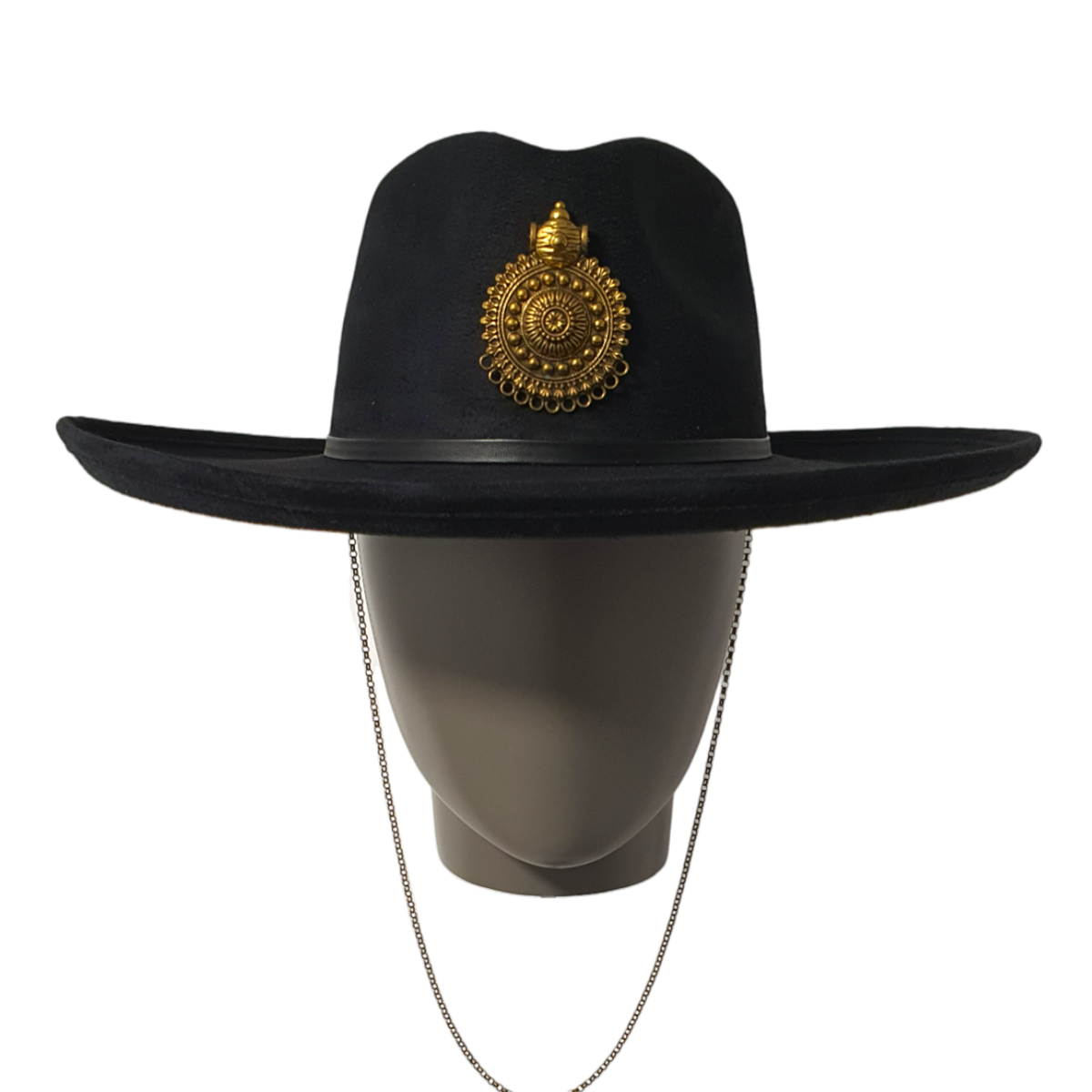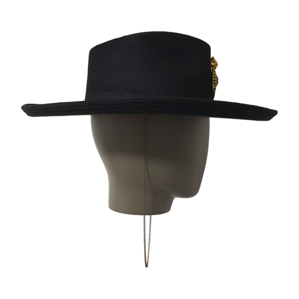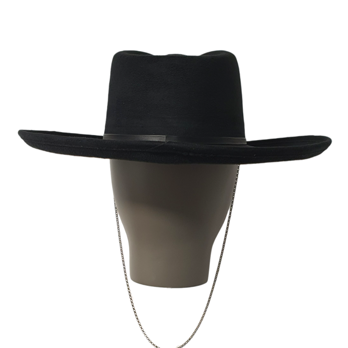 Ein moderner schwarzer Fedora-Hut aus weichem Textilsuede mit einem dekorativen Kettendetail. Stilvoll und vielseitig verleiht er jedem Outfit eine kühne, zeitgemäße Note. Geeignet für sowohl legere als auch elegante Looks.