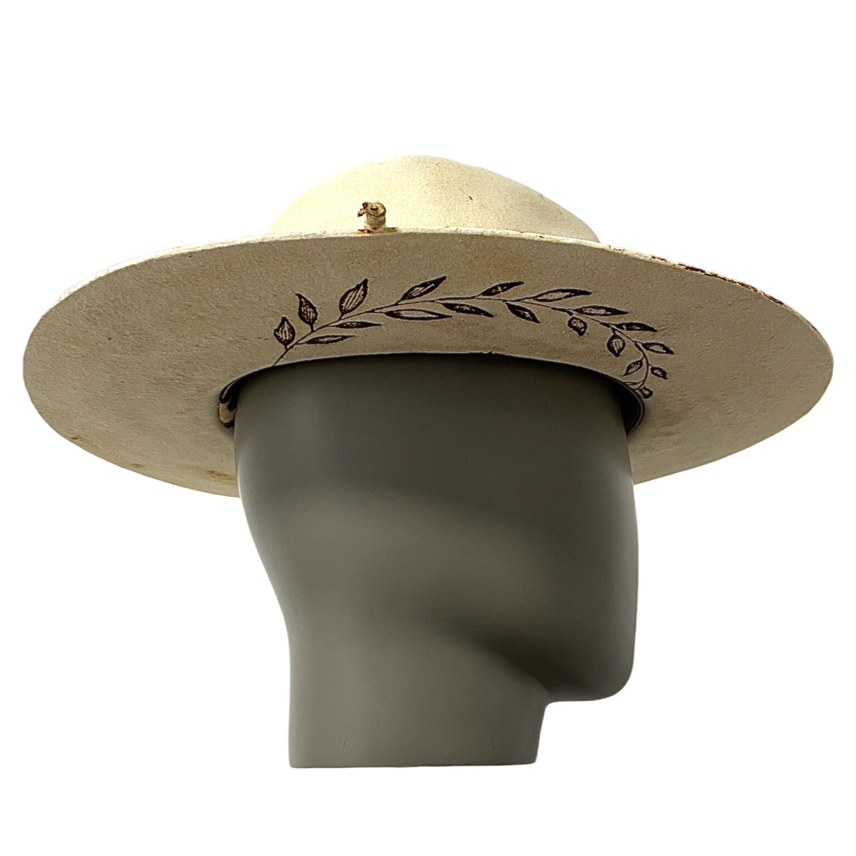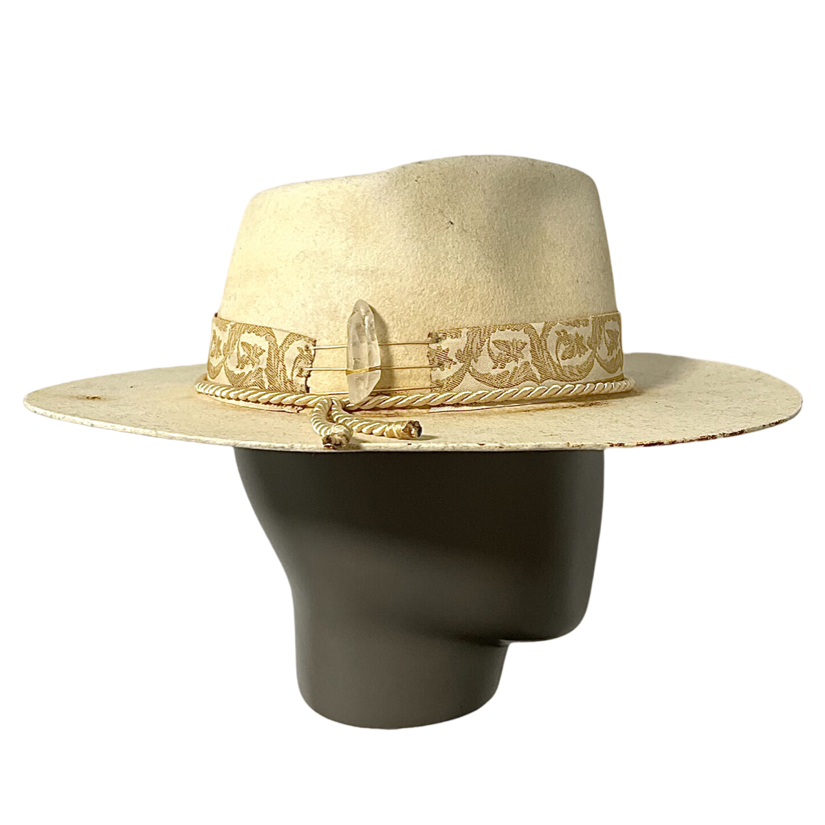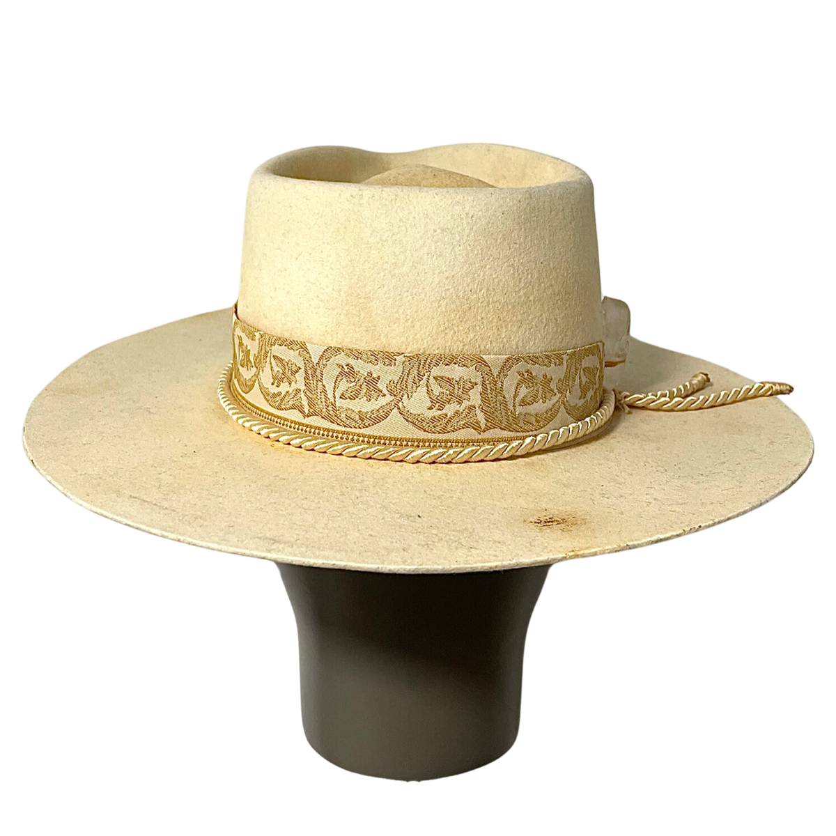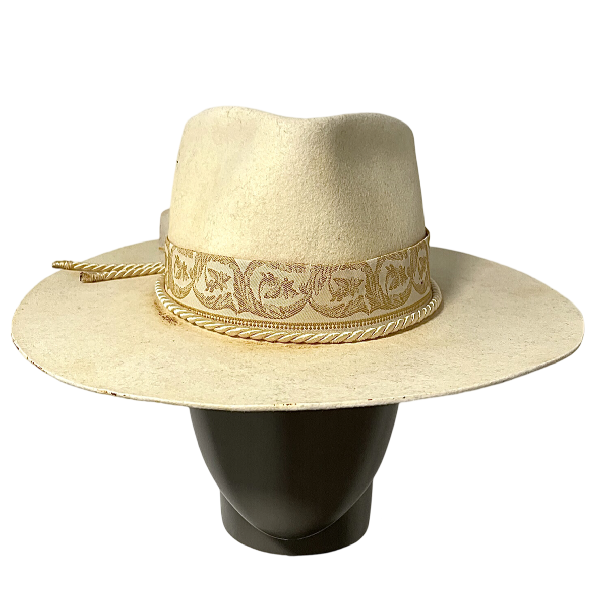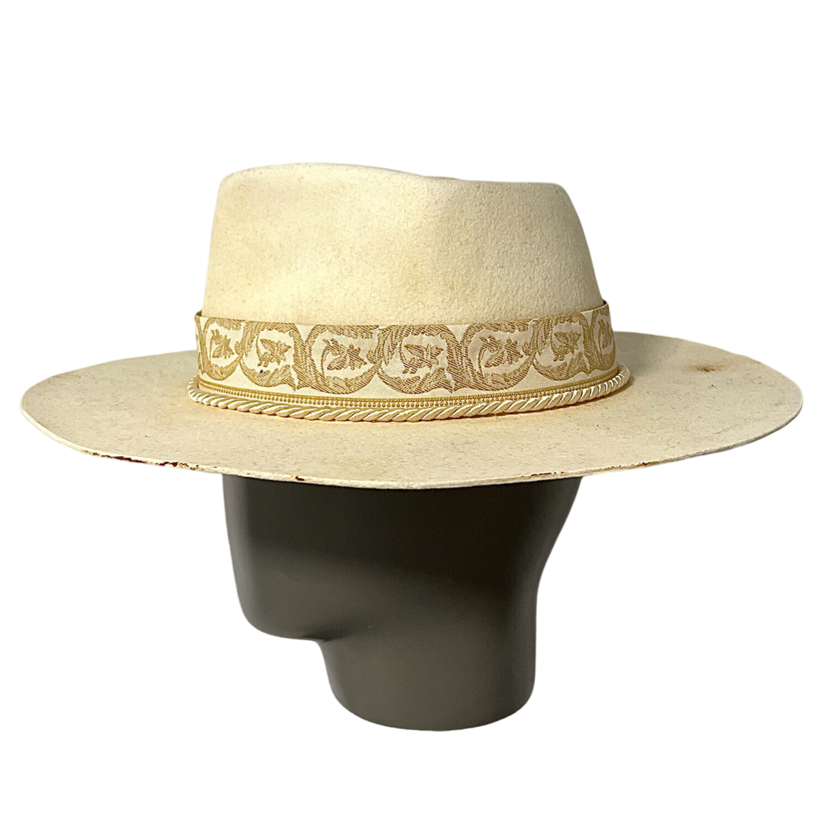 Das Bandmuster besteht aus verschiedenen geometrischen Formen und Linien in Gelb- und Weißtönen, die einen mutigen und modernen Look erzeugen. Das Muster wurde sorgfältig in das Band eingewebt, um ein hohes Maß an Detailgenauigkeit und Präzision zu gewährleisten. Die Krempe des Hutes wurde versteift, um ihre Form zu bewahren und dem Hut ein frisches und poliertes Aussehen zu verleihen.