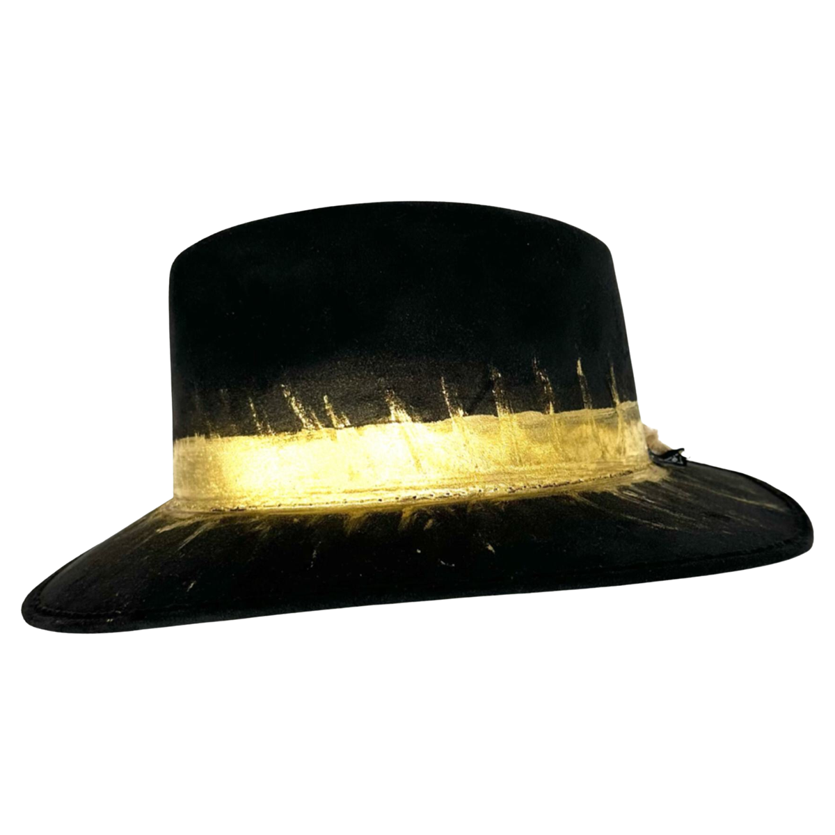 The bond that wraps around the base of the crown is another eye-catching feature of this hat. The bond is a shiny golden color that complements the feather and adds a touch of texture and dimension to the hat. It also gives the hat a more polished and refined look. This hat is perfect for both casual and formal occasions, making it a versatile and stylish addition to any wardrobe.