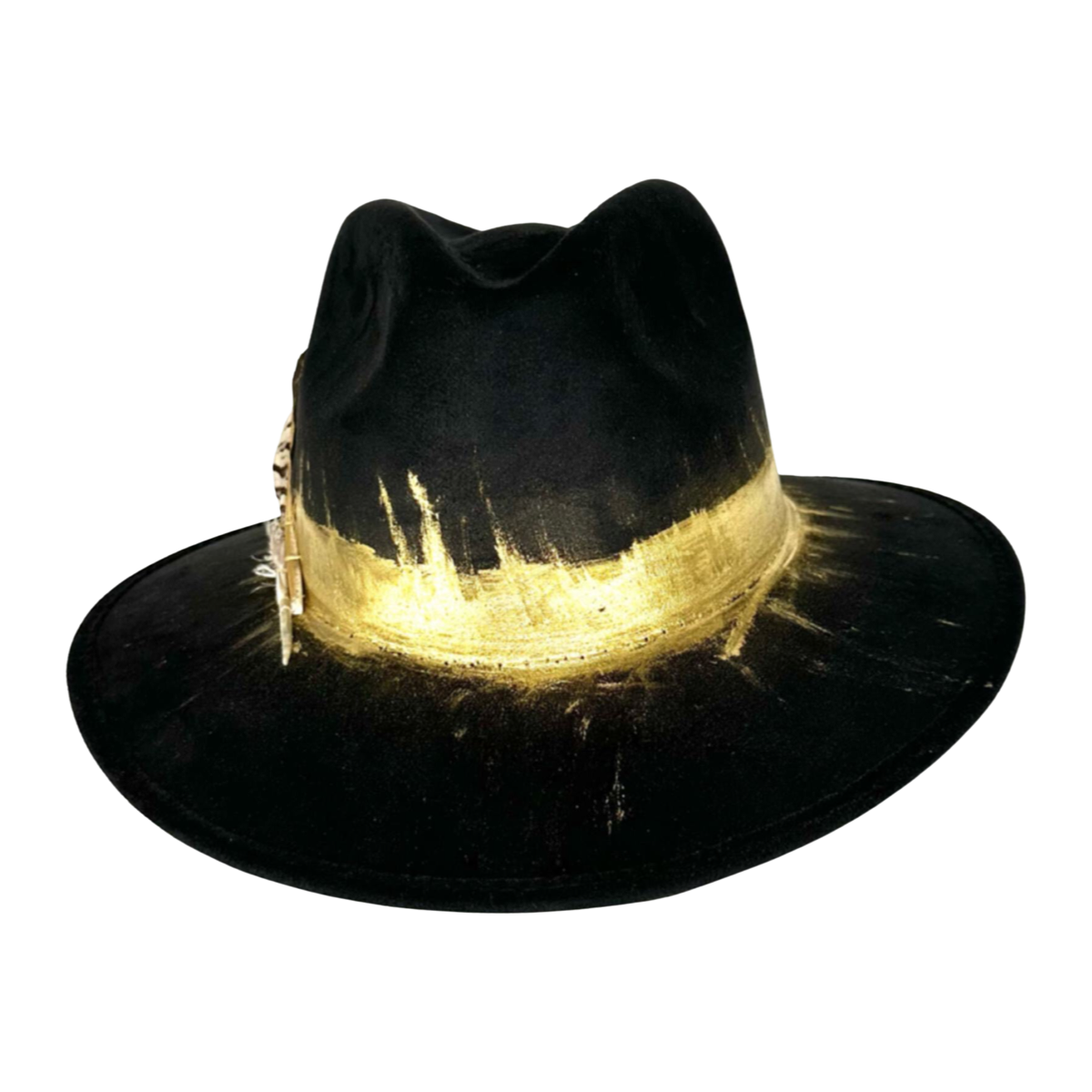 One of the standout features of this hat is the golden feather attached to the side of the crown. The feather adds a touch of elegance and sophistication to the hat, and the golden color provides a striking contrast to the black suede material.