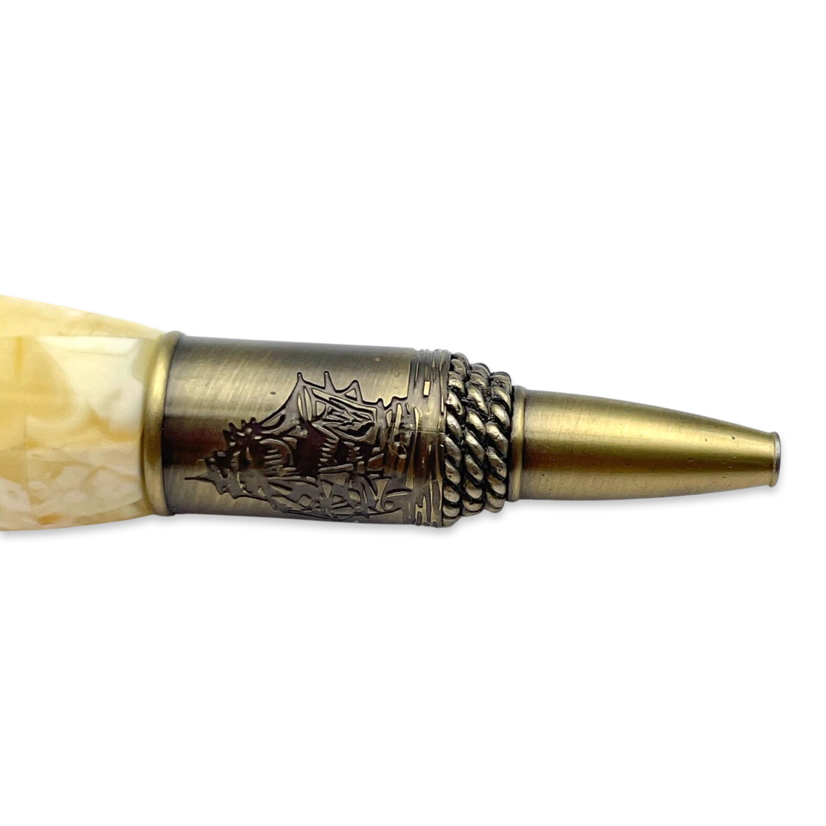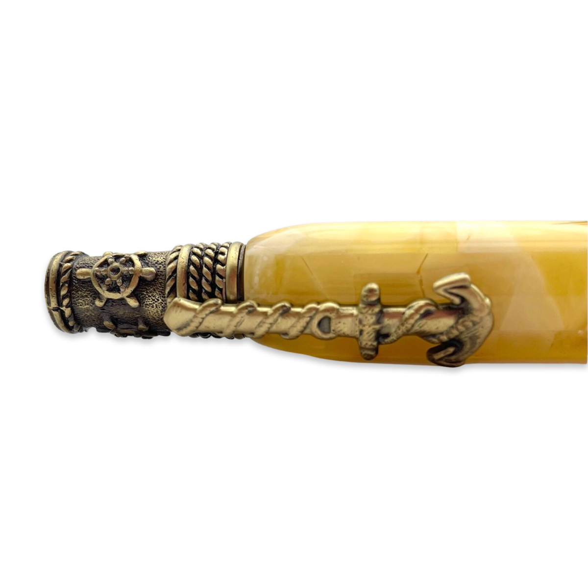 Dieser exquisite Kugelschreiber ist sorgfältig gestaltet und verfügt über einen Körper, der mit atemberaubenden Bernsteinakzenten verziert ist. Die warmen, goldenen Töne des Bernsteins schaffen ein reiches und opulentes Erscheinungsbild und verleihen dem Schreibgerät einen Hauch natürlicher Schönheit.