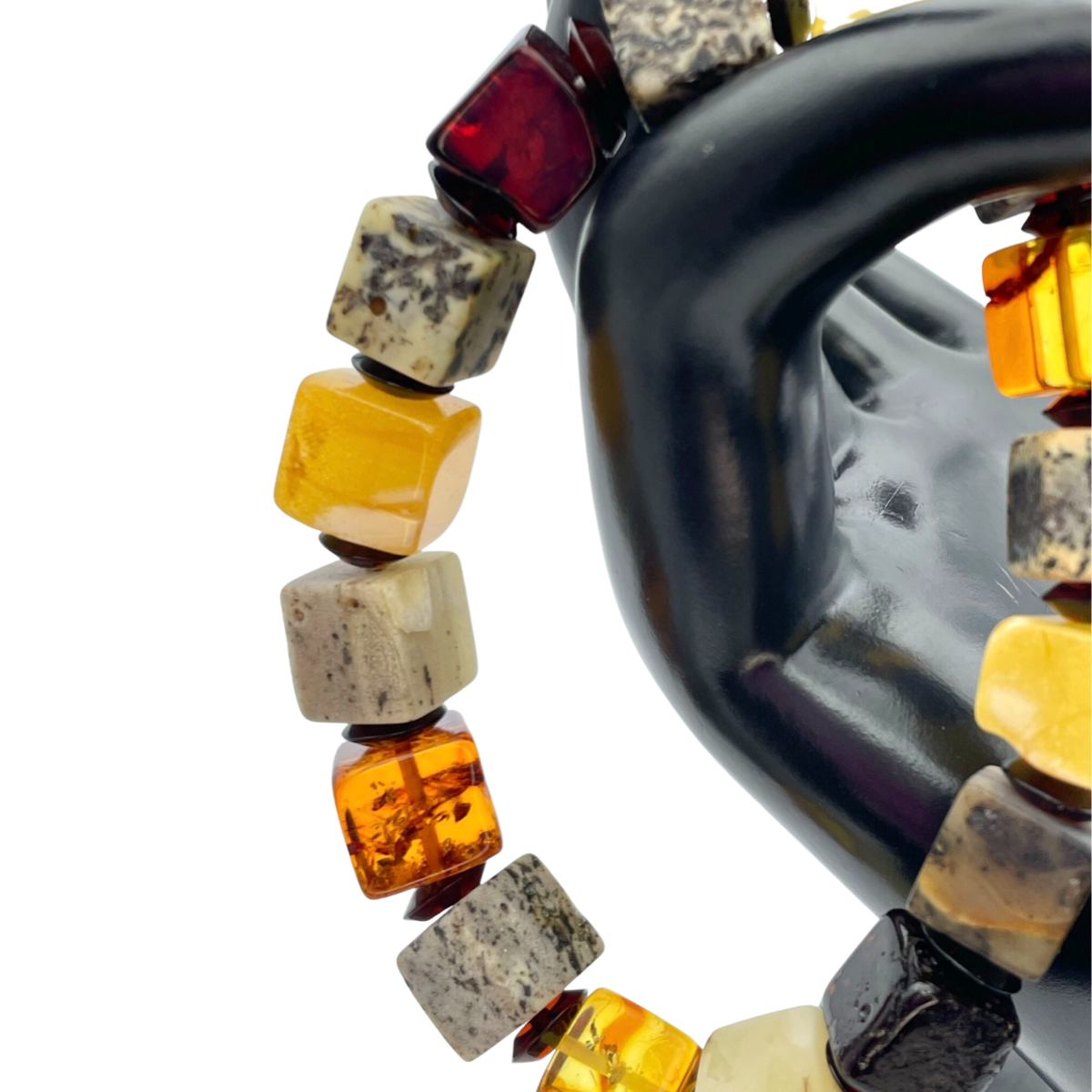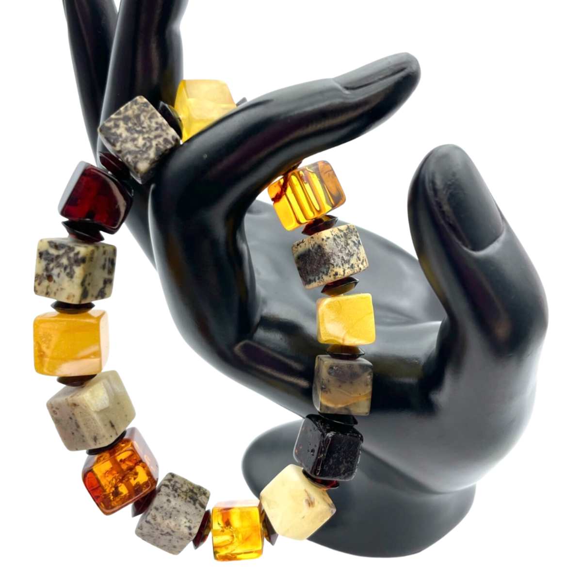This Multi-Colored Amber Cube Bracelet is a unique and vibrant addition to your jewelry collection. Made from multi-colored amber cubes, this bracelet combines the natural beauty of amber with a pop of color. Each amber cube is carefully selected and polished for a smooth, shiny finish. The bracelet features golden, brown, orange, and yellow amber cubes, creating a vibrant and one-of-a-kind pattern. In addition to being a beautiful piece of jewelry, amber is also said to have healing properties, making it a healthy and beautiful option to wear. This bracelet is the perfect companion for any outfit, from a casual look to an elegant one.
