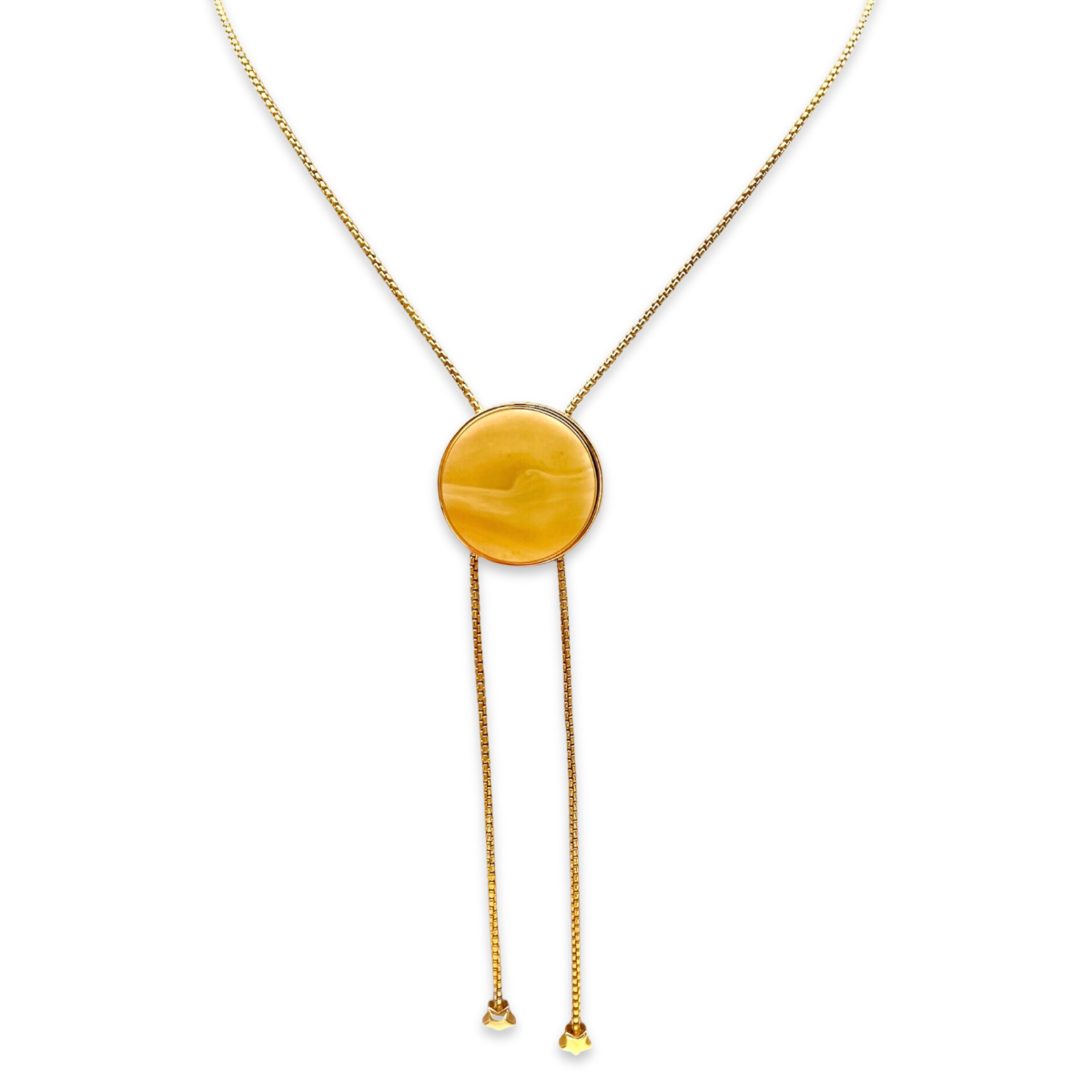 The gold-plated necklace with amber is a stunning piece of jewelry that exudes elegance and sophistication. Handmade by skilled artisans, this necklace features a beautiful amber stone set in a gold-plated 24k base.