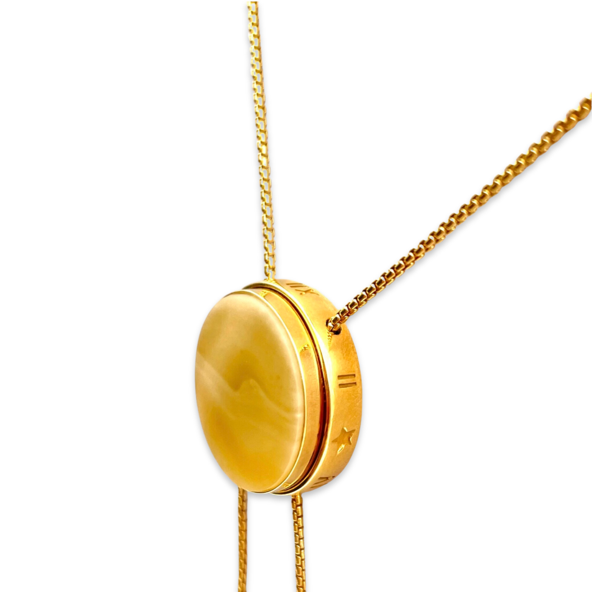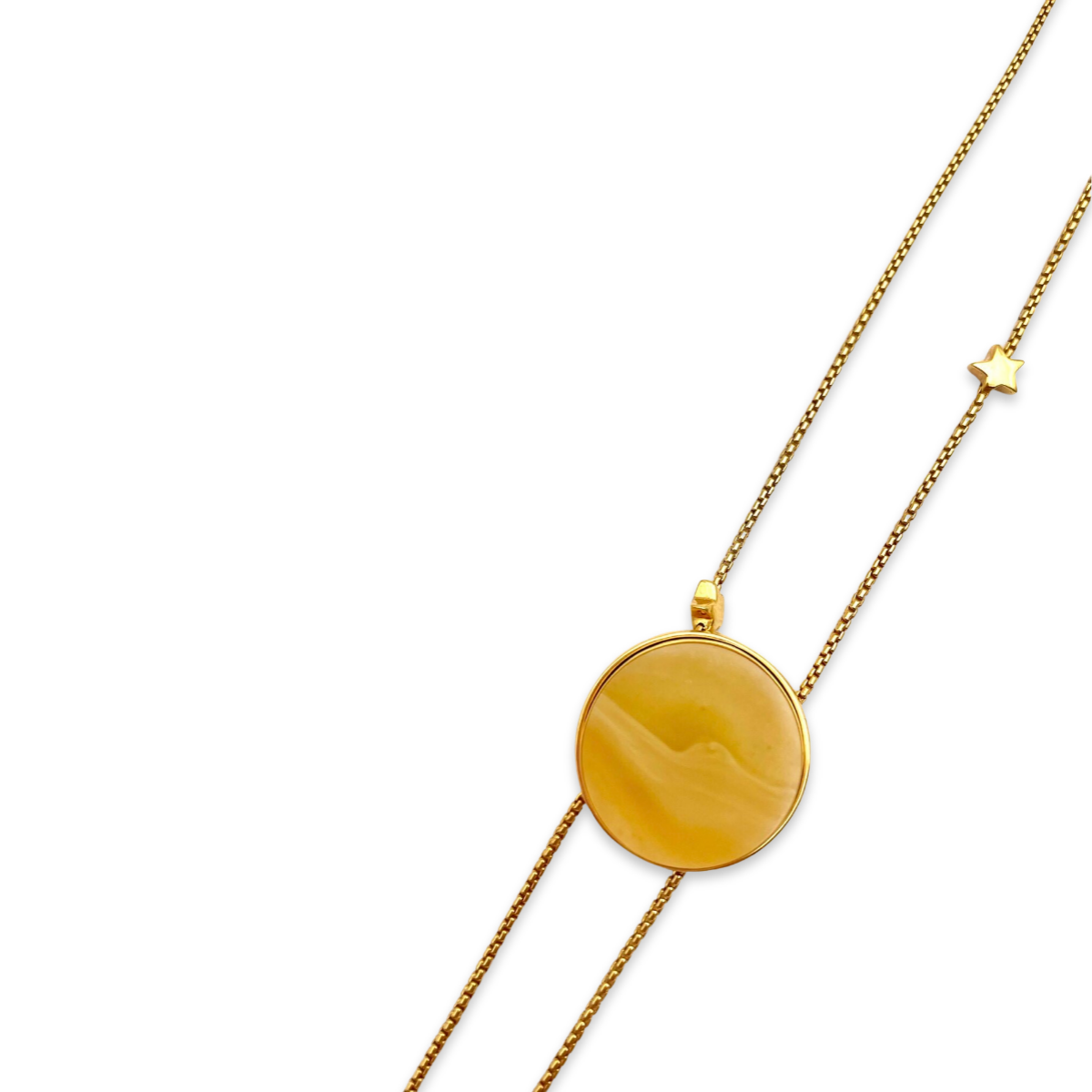 The amber stone is 100% natural, ensuring that each necklace is unique in its color. The stone is set in a delicate gold-plated pendant that hangs from a matching chain.