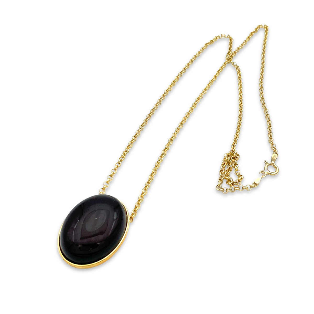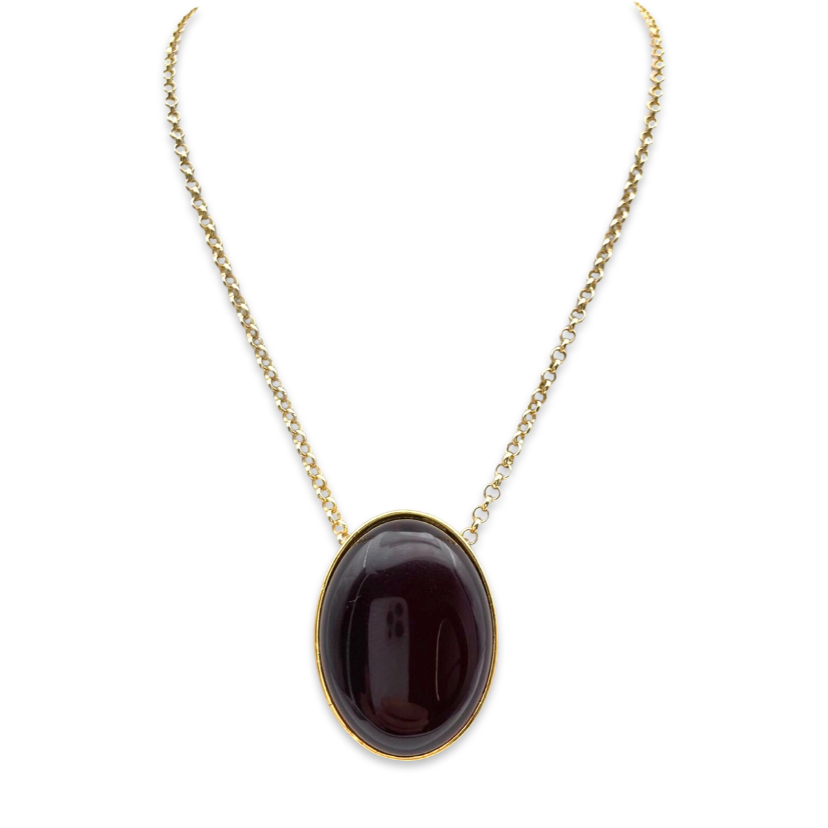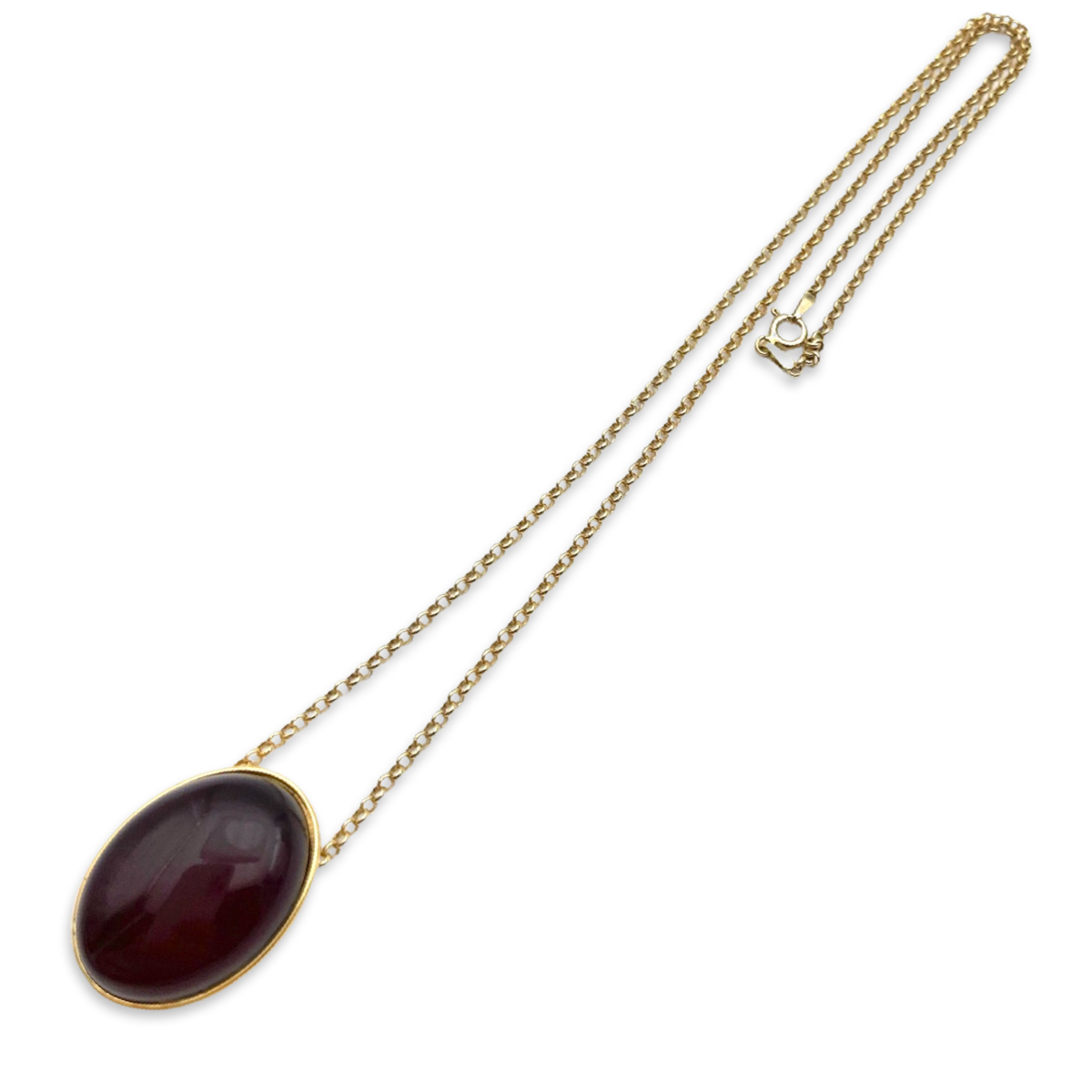 This gold-plated necklace features a beautiful red amber pendant. The pendant is made of genuine amber, which has been carefully selected and polished to highlight its natural beauty. The amber is set in a gold-plated frame that adds a touch of elegance to the overall design.The chain of the necklace is also gold-plated 24k and has a classic, timeless design that complements the pendant perfectly.This necklace is a great accessory for any occasion, whether you're dressing up for a formal event or adding a touch of sophistication to your everyday look. The red amber pendant adds a pop of color to any outfit, making it a versatile piece that you can wear with a variety of colors and styles.Overall, this gold-plated necklace with a red amber pendant is a beautiful and high-quality accessory that you'll love wearing and showing off.