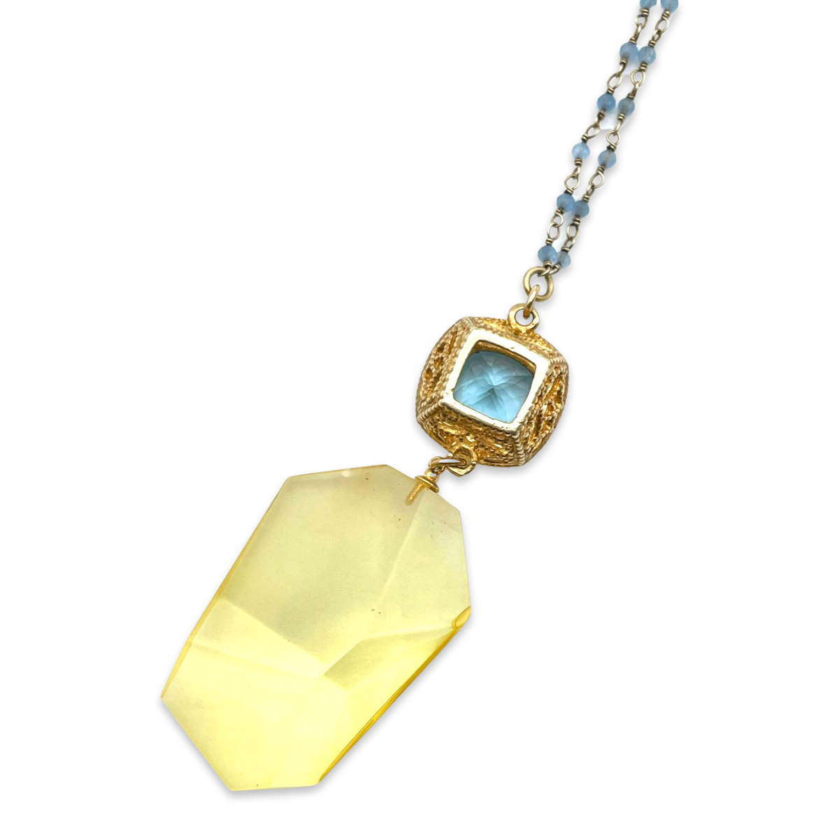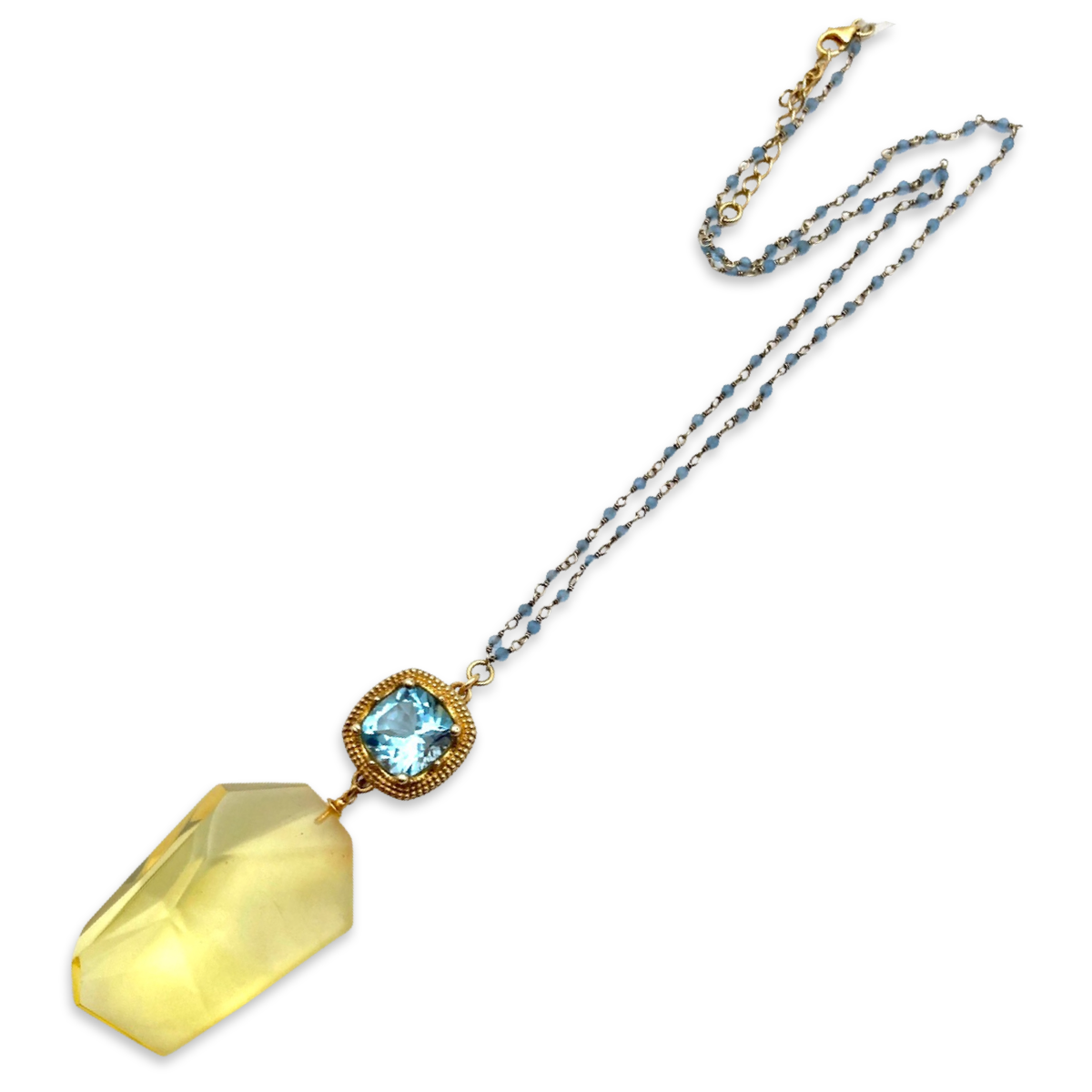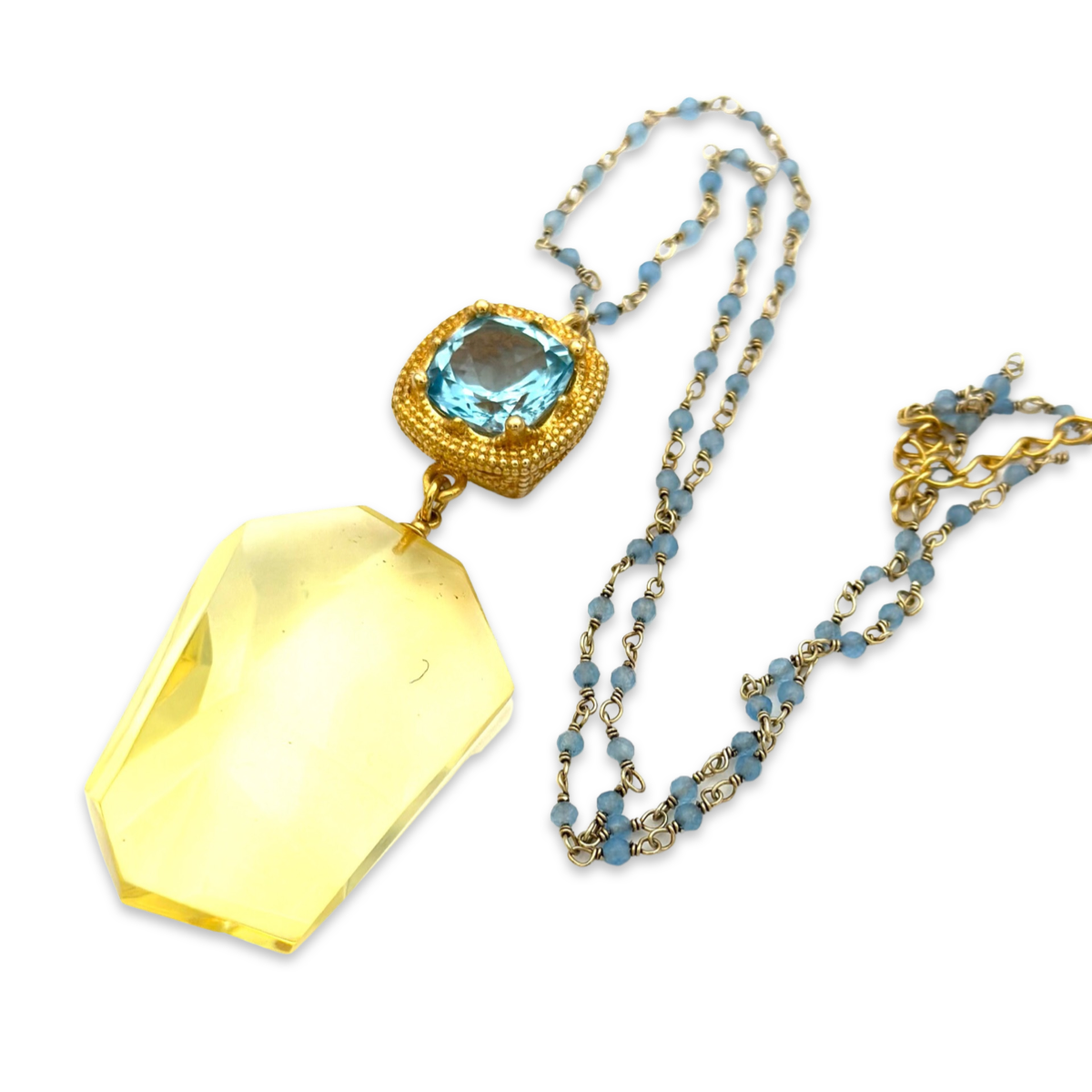 This stunning necklace features a faceted amber pendant at its center, which catches the light beautifully and adds a touch of warmth and elegance to any outfit. The pendant is accented with topaz and turquoise beads, which complement the natural color of the amber and add a pop of color to the design.The necklace is made from high-quality materials and features gold-plated 24k details, which give it a luxurious and eye-catching finish. The gold plating adds a touch of glamour to the design, making it perfect for special occasions or adding a touch of sophistication to your everyday look.The necklace comes with a sturdy clasp that ensures it stays securely in place all day long. If you dressing up for a night out this necklace is the perfect accessory.Order now and add this beautiful necklace to your jewelry collection today!